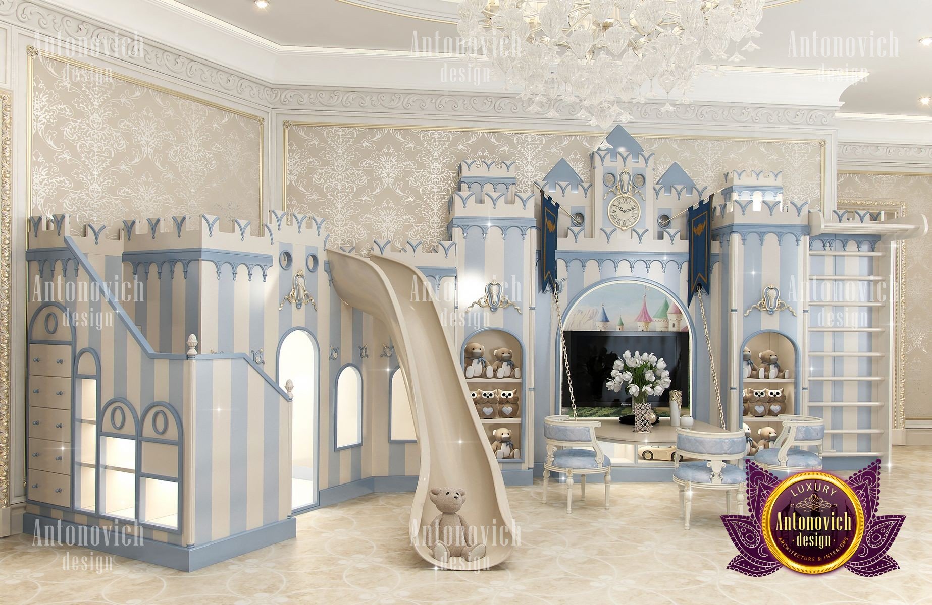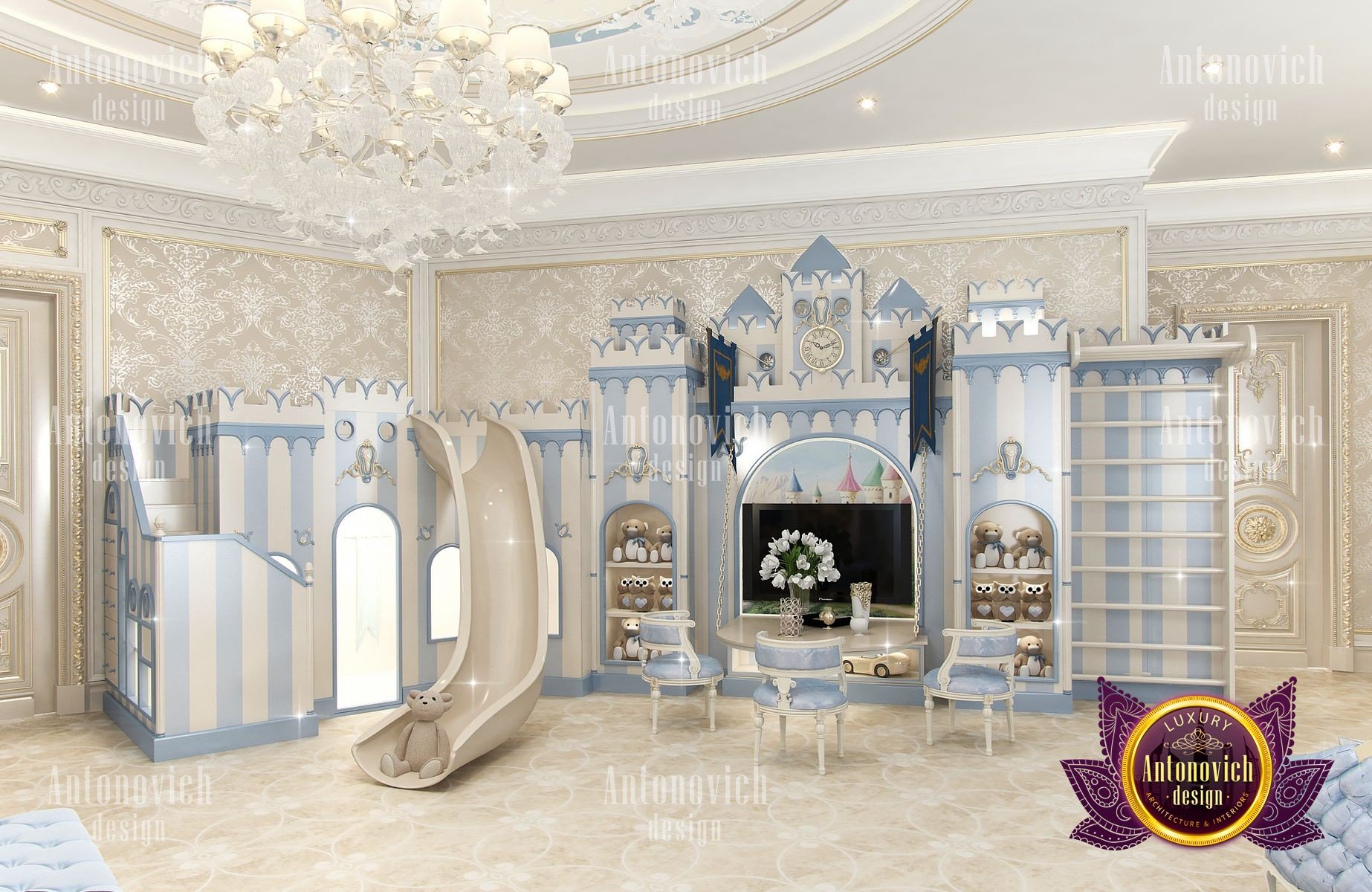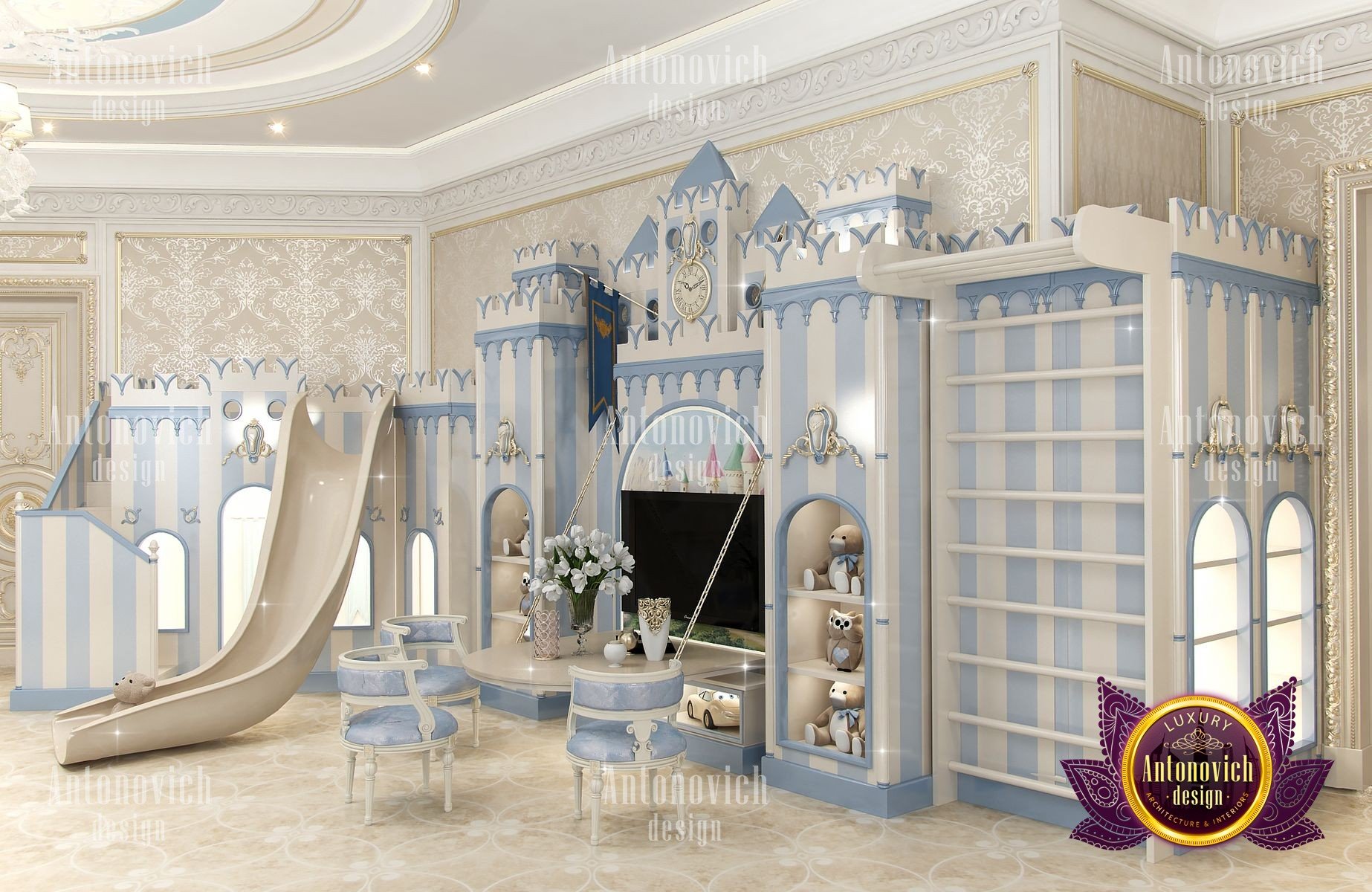 The design of the childrens room, which is similar to a happy fairy tale, was created by the creative designer of the studio Luxury Antonovich Design Katrina Antonovich. Everything is so beautiful here that you want to admire this beautiful interior of the childrens room for two sisters aged 4 and 5 years. A large enough space allowed creating comfortable areas for sleep, games, and learning. Modern furniture manufacturers create incredibly beautiful options for childrens rooms. In this project, the highlight and the main decoration of the room were two charming beds. The carved headboards are encrusted with sophisticated carved decorations with silvering and inlay with semiprecious stones. An obligatory part of the bed was the charming ottomans. Especially luxurious look original canopies made of translucent blue silk, which beautifully decorates the beds with the help of special arched constructions. In the decor of the walls, floors, and ceiling, the interior designer continues the motives of the other rooms in the house. Very warm and cozy look natural parquet on the floor of a light valuable wood. The walls were decorated with elite silk wallpaper with damask ornaments in creamy-golden tones. A circular multi-leveled niche on the ceiling visually combined the space of the interior. A large crystal chandelier with large pendants and a magnificent molded decoration on the medallion around it fills the room with the mood of royal palace luxury. Beautiful curtains of blue silk fit perfectly into the interior of the childrens room. A large play area has become a real dream come true for two little princesses.