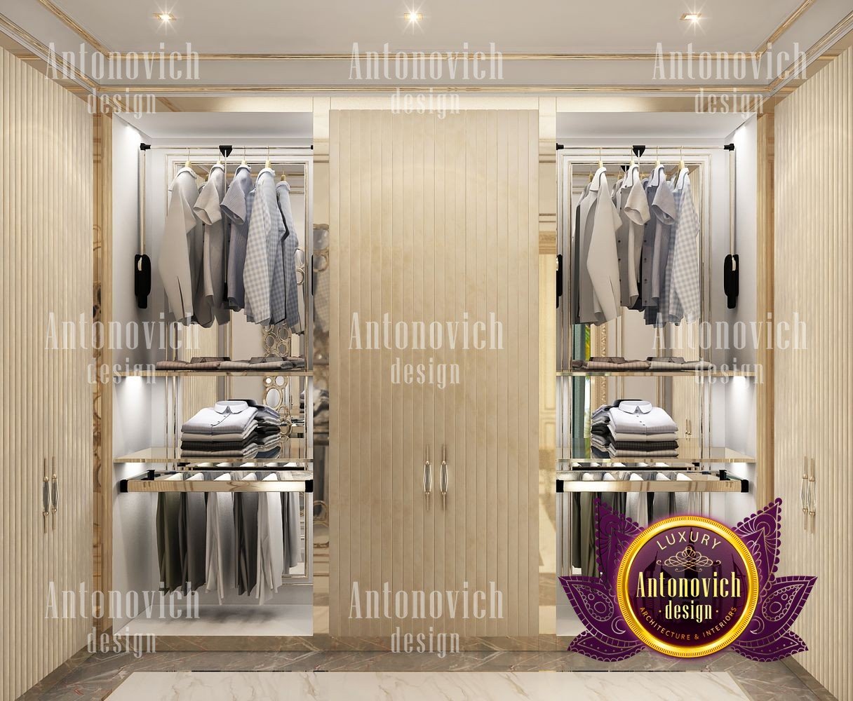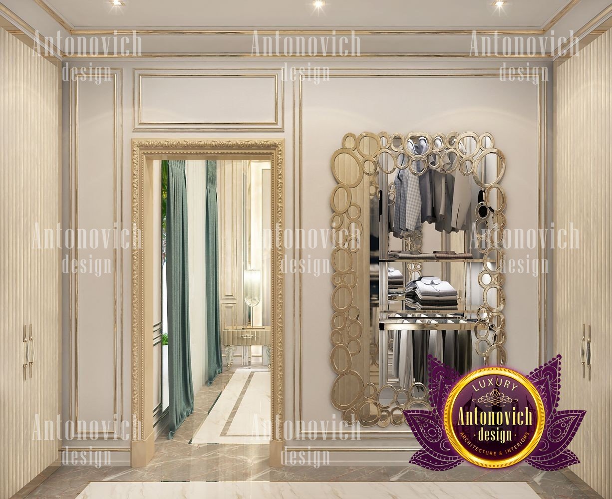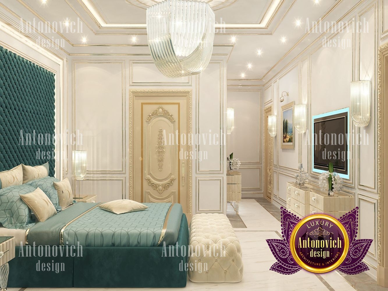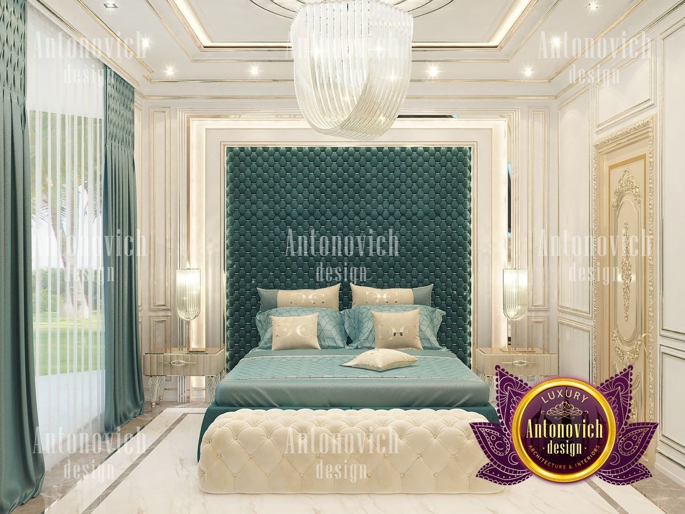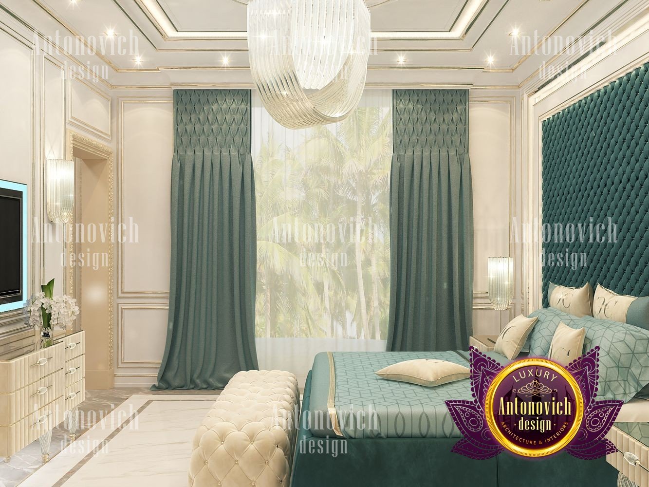 The charming interior of the bedroom in the modern penthouse was created by the best designers of the Luxury Antonovich Design Studio. You can repeat a thousand times that it is the bedroom interior that plays a key role in our life. After all, here we rest and gain strength before new achievements. Here it is only our territory, where we devote time to ourselves, away from prying eyes. And do not need to remind you how important is the cozy and comfortable bedroom interior in a modern big city. When the noisy city around, the day is full of goals and events, it is so important that you can relax in your own ideal bedroom. And this ideal for everyone is different. Creating interiors, talented designers never repeat themselves. Each interior is a unique story of beauty, luxury, and comfort. The highlight of this project is two large arched windows with a beautiful city landscape behind them. The windows are decorated with luxurious curtains made of silk velvet. Thanks to soft decor from decorative silk roses of a cream shade, the velvet curtains forms beautiful folds and gorgeously falls to the floor of natural wood. To emphasize the beauty of the city, the windows are curtained with a translucent tulle of milky shade. In general, the interior is dominated by a pleasant palette in warm lilac tones. The walls are decorated with silk wallpaper with a delicate damask ornament. On the floor of natural wood, a natural carpet with a large, monogrammed design looks very bright. A luxurious bed with a high soft headboard and graceful ottoman complement the comfortable mood of the interior.