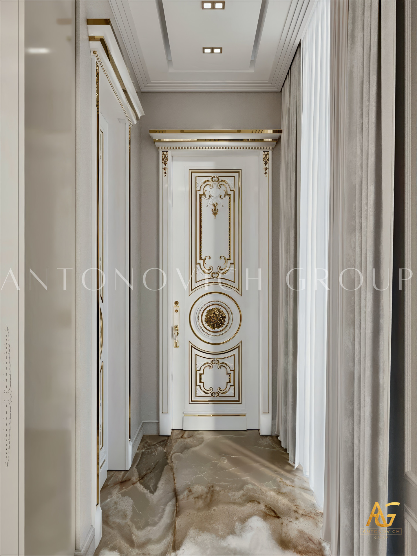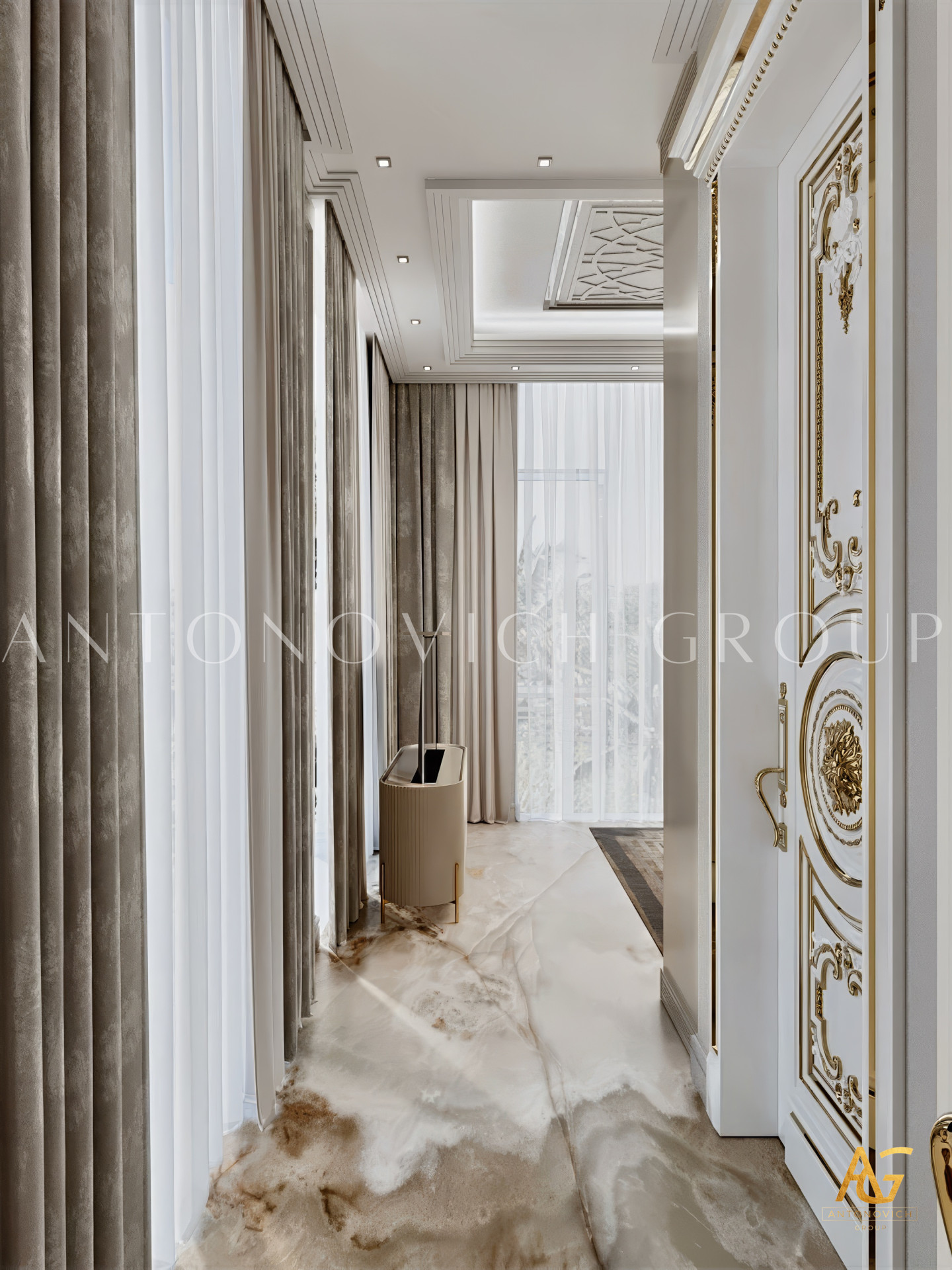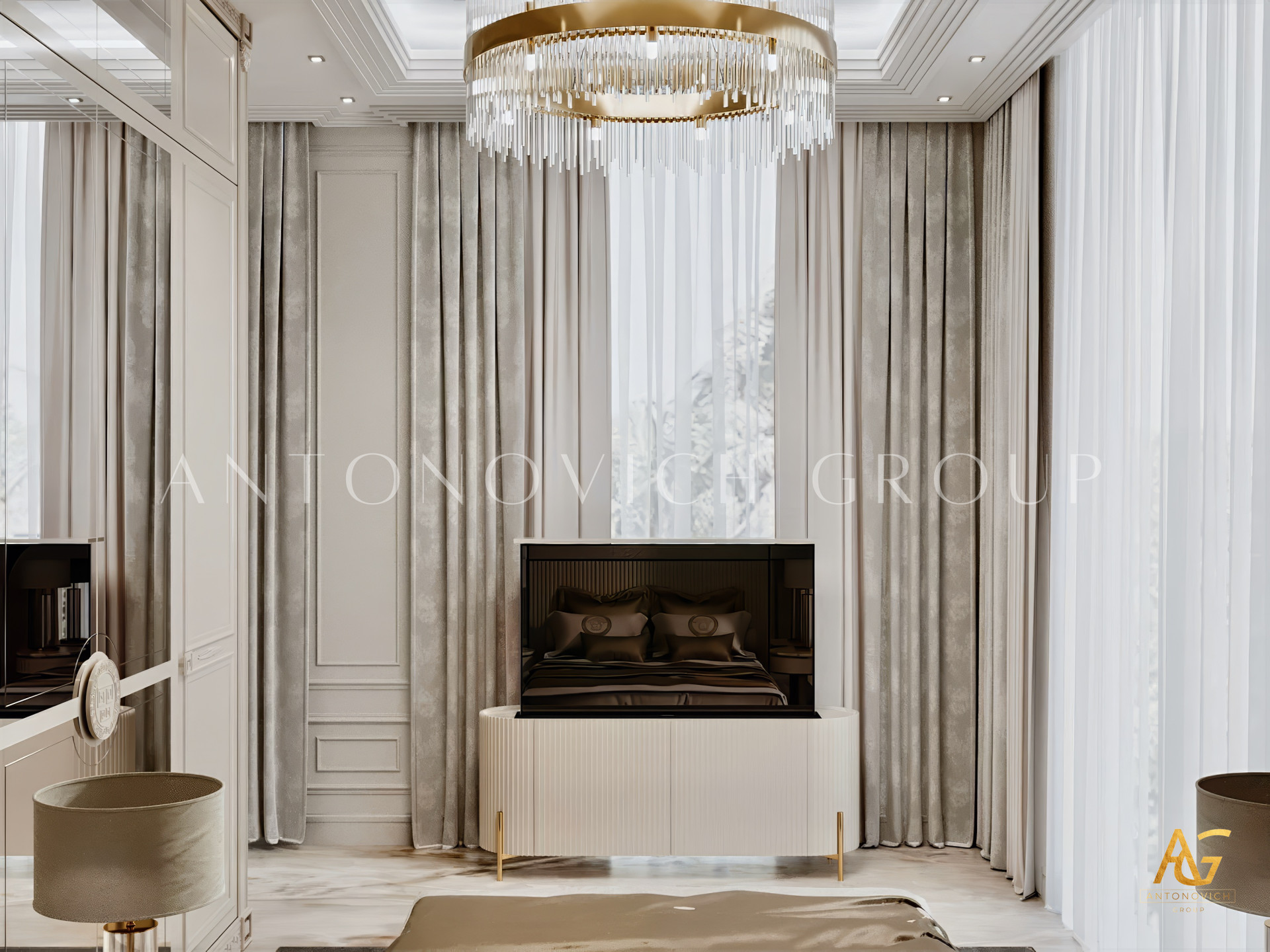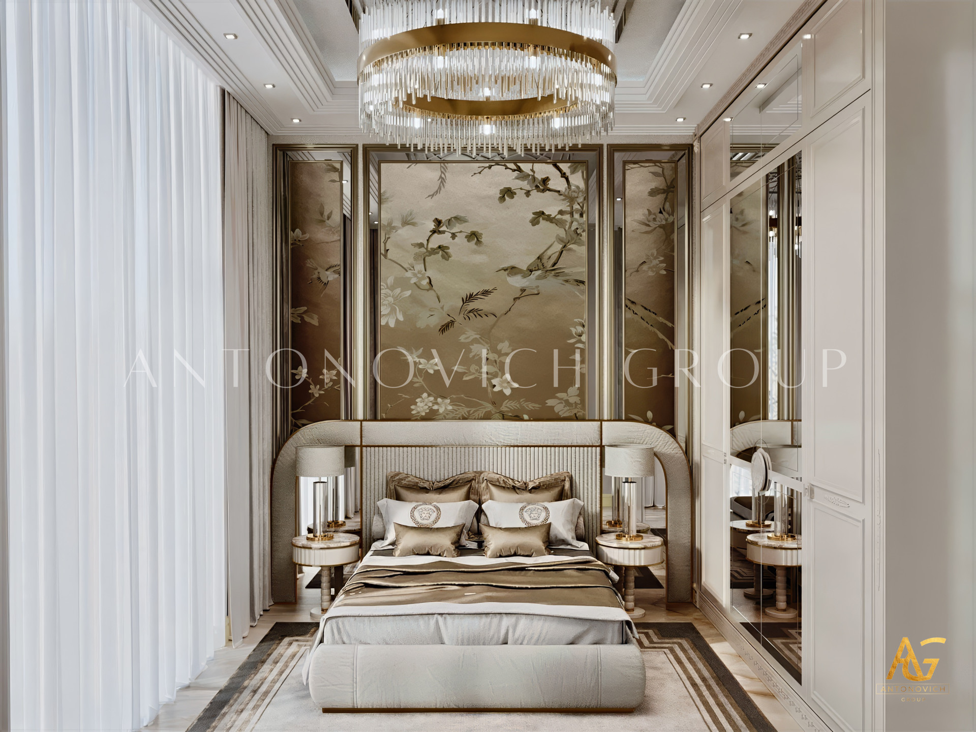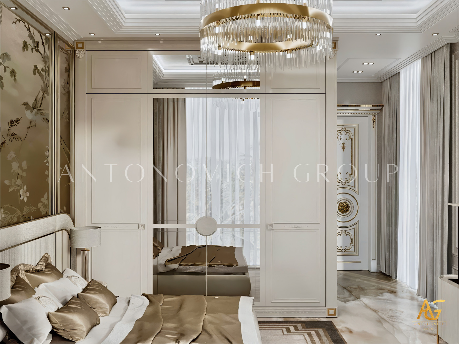 With the help of interior design, you can completely move in time and space. If modern style takes us sometimes to an unknown future, then the classic style moves us into the luxury of the royal palaces of France or Italy, as in this interior of a luxurious bedroom. Life is beautiful when you can fall asleep and wake up in such a beautiful and enchanting interior. As never before, the ceiling design is very important in the bedroom interior. After all, here we can spend most of our time laying in the bed, admiring the ceiling. It is for this purpose, namely to give a sense of aesthetic pleasure, the interior designers of the studio Luxury Antonovich Design created a beautiful ceiling with a round niche that is filled with artistic painting in the spirit of the best traditions of the Renaissance. In general, the bedroom interior design fully expresses the beautiful taste of its owners and their subtle sense of beauty. This is a real paradise for pleasant and happy moments. The decoration of windows and beds is almost in a perfect harmony. Luxurious textiles with openwork prints combine a rich blue hue and pearly white. Decorative plaster and pelmet cream-colored accentuate this magnificent play of ornaments. The natural carpet with bright floral ornaments became a cozy and bright accent of the luxurious bedroom interior. The saturated palette of shades in the interior has become a reflection of the cheerful and optimistic nature of the house owners. Beautiful furniture from Italy filled the interior with greatness and comfort.