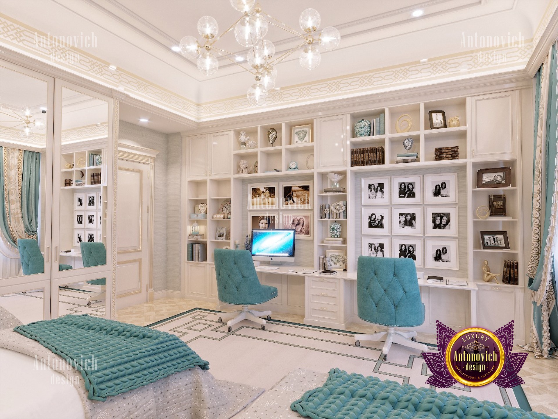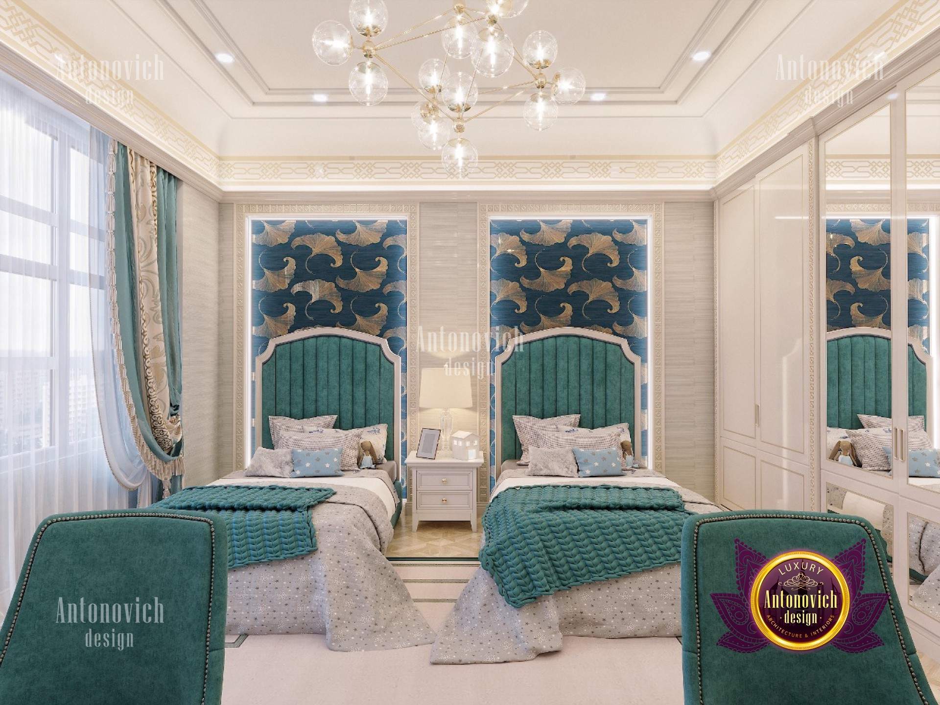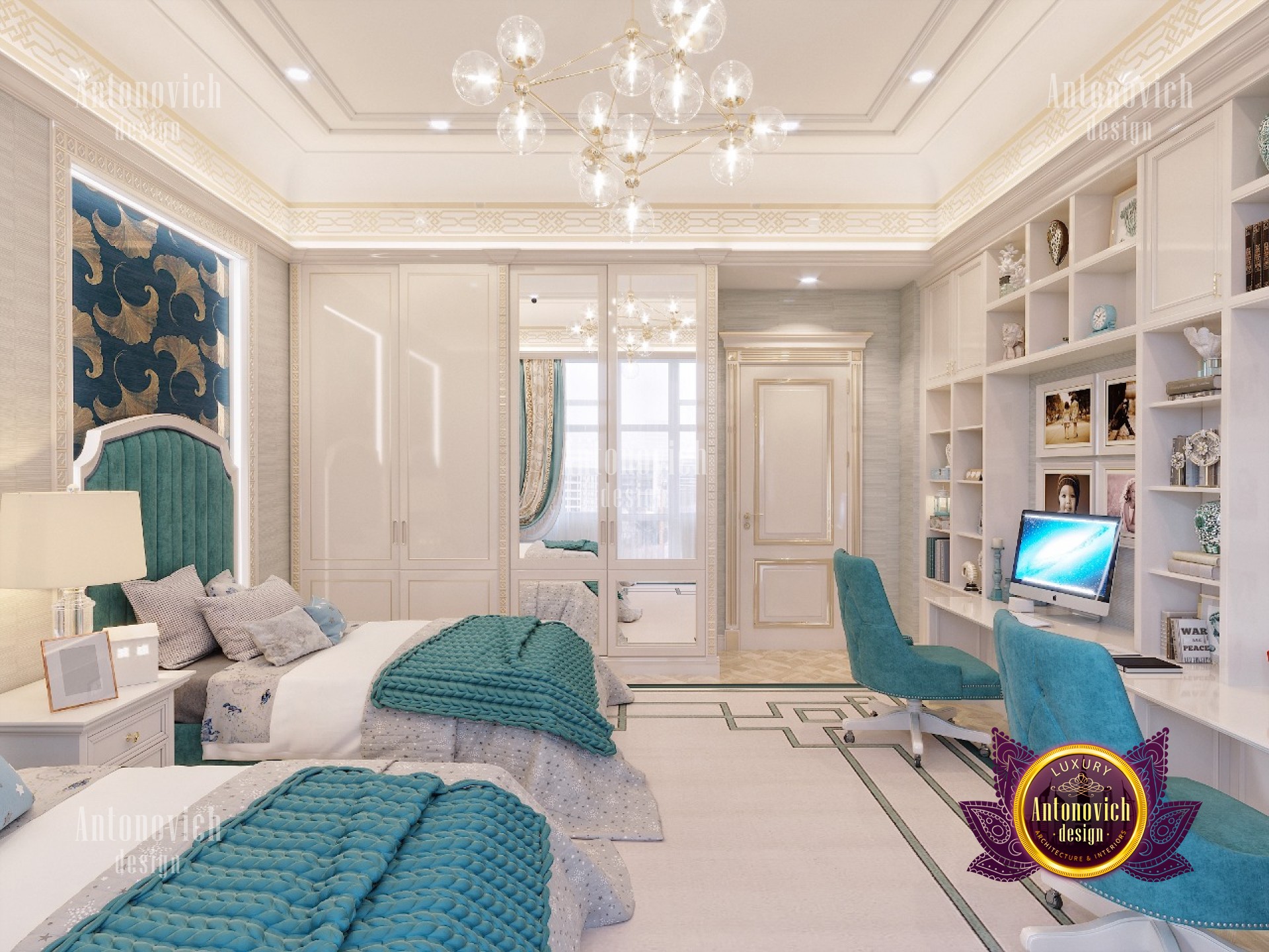Art plays a huge role in the completion of this luxury apartment bedroom. The beautiful wall decor in the cool and interesting pattern is one of the main focal points of the stunning bedroom. Its beautiful design is paired with equally beautiful turquoise beds. Along with it are two office chairs perfect for two kids as a study area. The cute yet luxurious ambiance of the room is made for kids to be productive in their studies while enjoying life to the fullest.