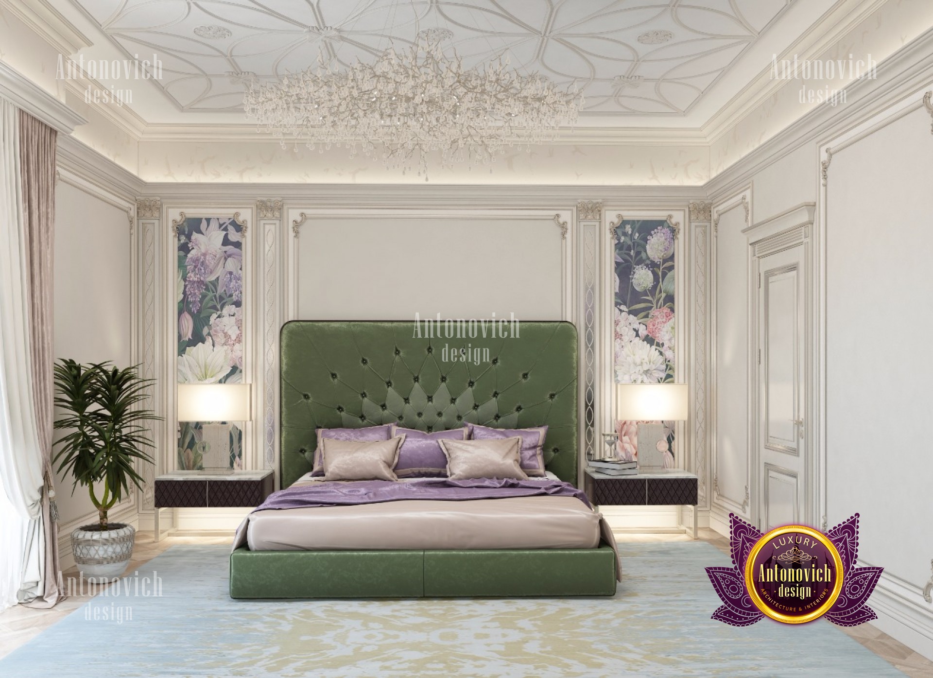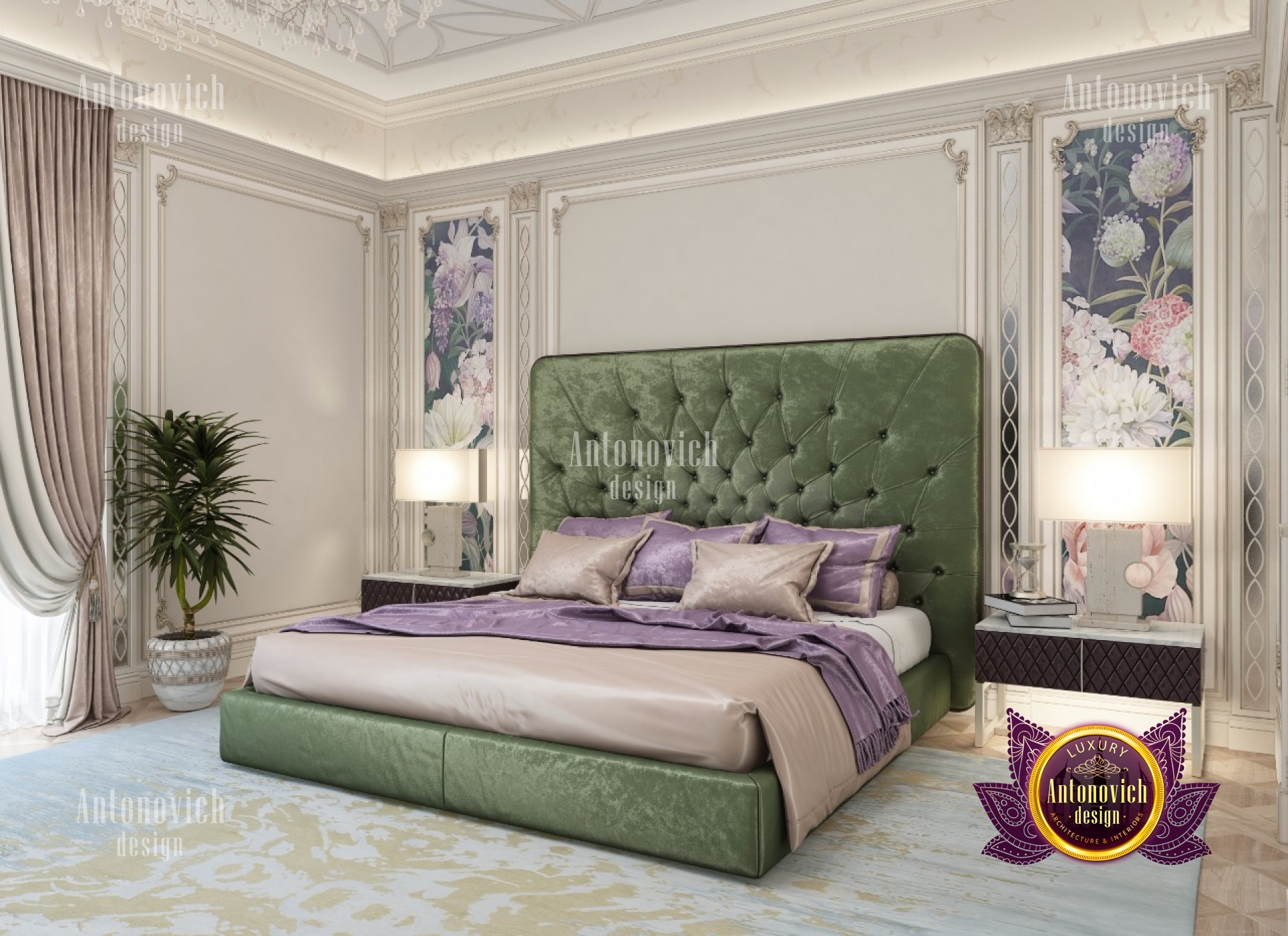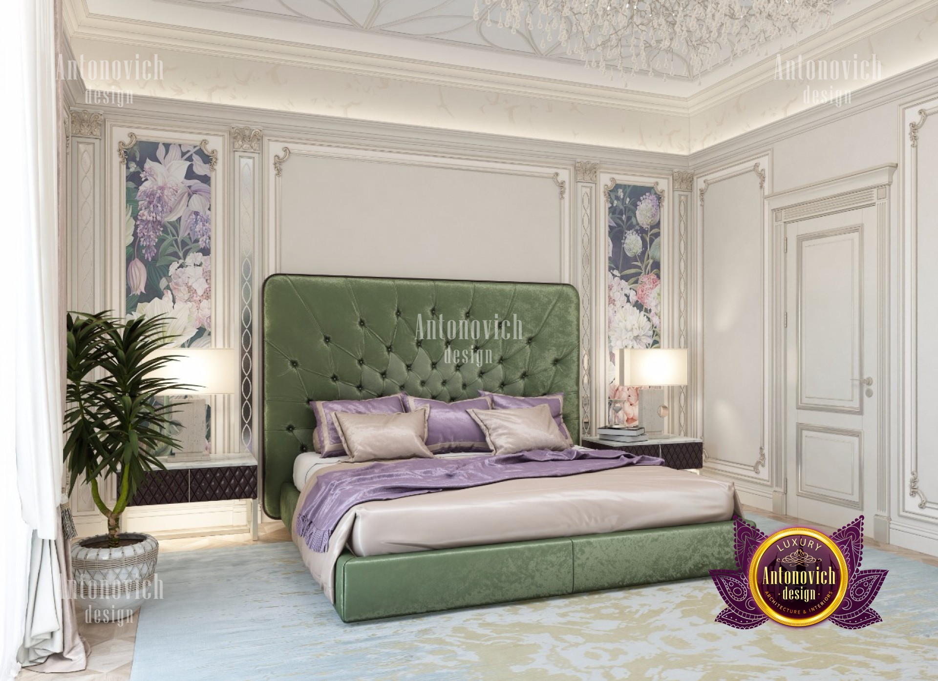 The masters bedroom is finished with a beautiful moss green bed paired with lavender bedding. This color combination is unique and one of a kind. Rarely do we see this kind of tone; yet Luxury Antonovich Design was able to pull off such a hard color combination. Its details in color along with the beautiful finish of the room is something to consider when looking for a luxury interior design. The art and masterpieces on the wall are also stunning. Finishing the look of the room is a beautiful curtain with stunning colors to complete the luxury interior decor of the room.