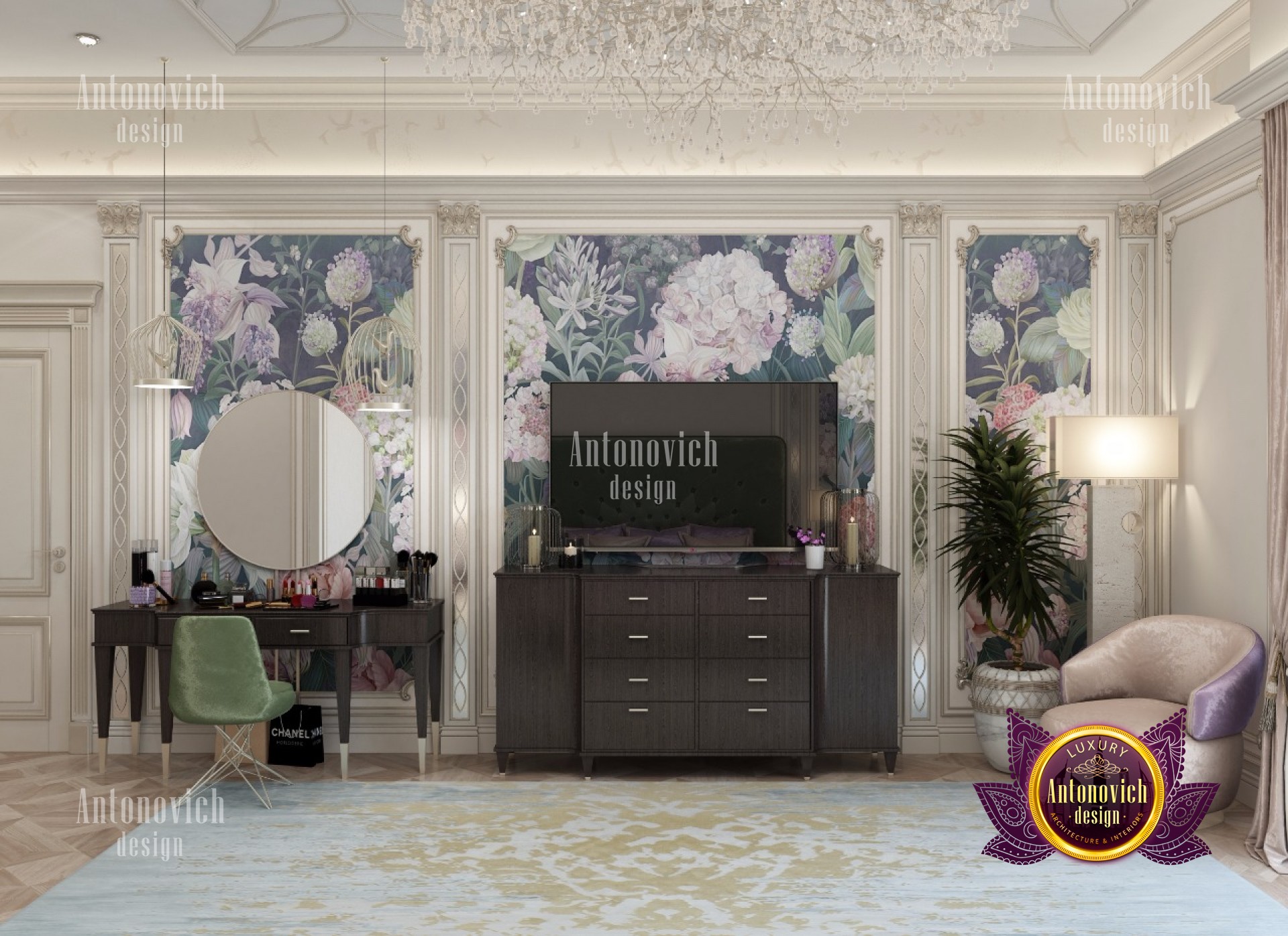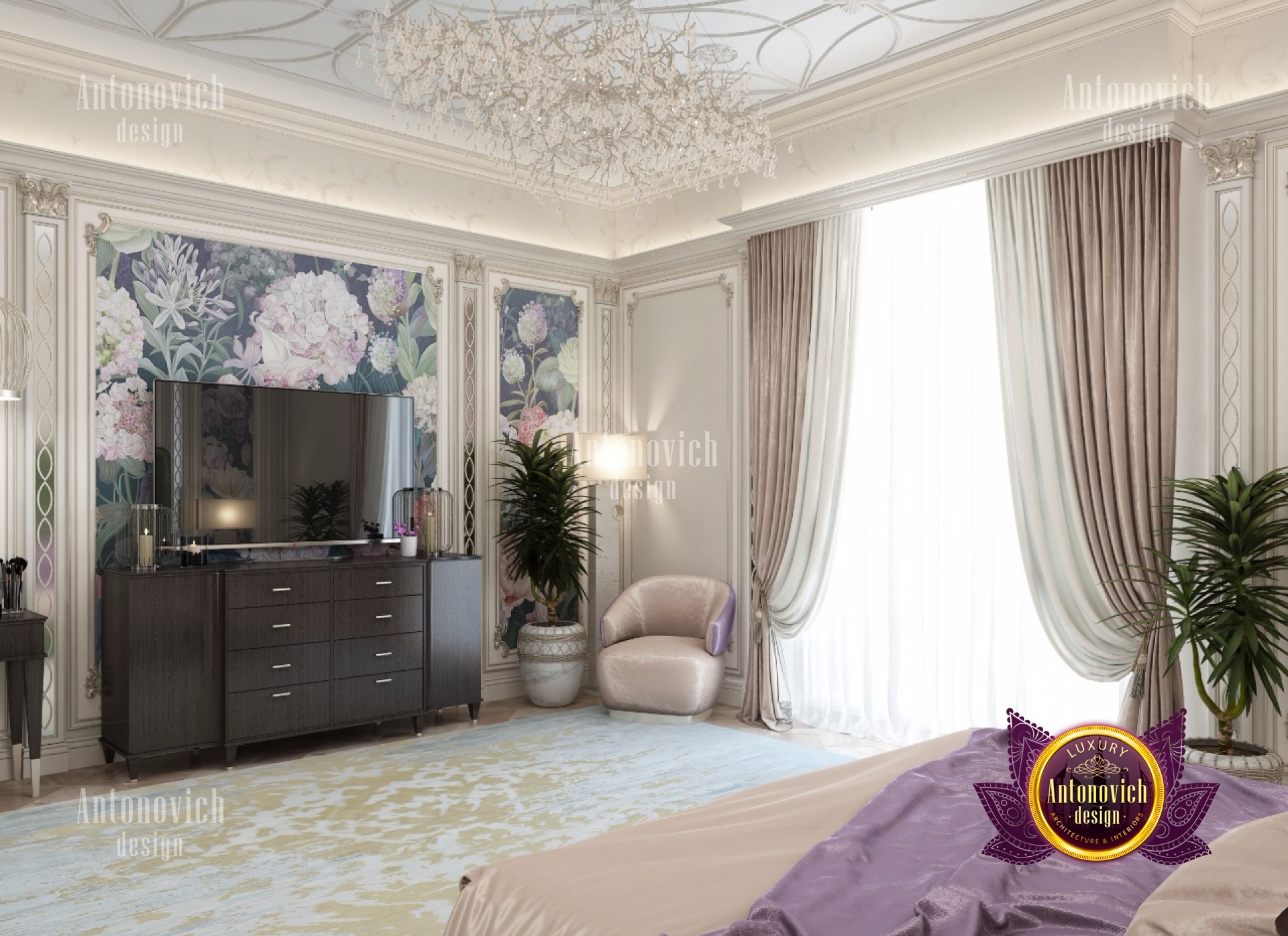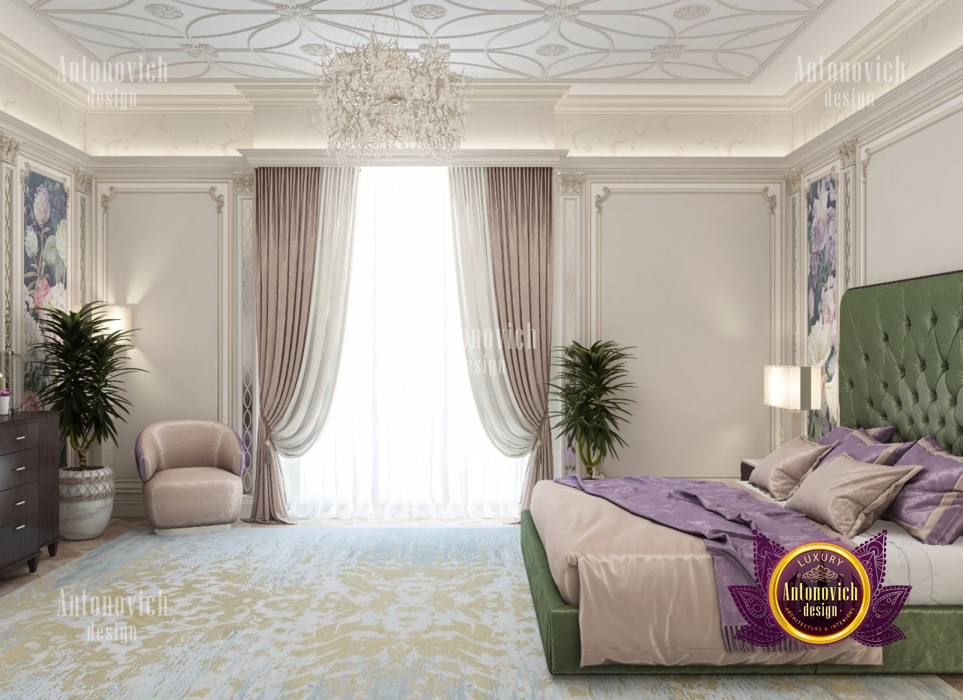 The masters bedroom is finished with a beautiful moss green bed paired with lavender bedding. This color combination is unique and one of a kind. Rarely do we see this kind of tone; yet Luxury Antonovich Design was able to pull off such a hard color combination. Its details in color along with the beautiful finish of the room is something to consider when looking for a luxury interior design. The art and masterpieces on the wall are also stunning. Finishing the look of the room is a beautiful curtain with stunning colors to complete the luxury interior decor of the room.