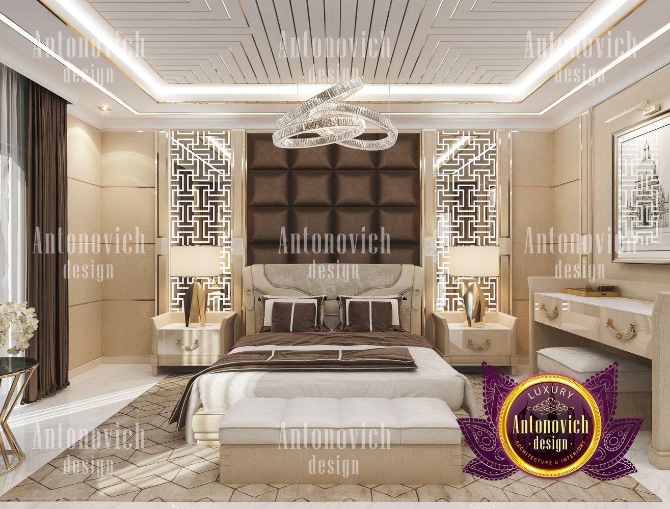 There is nothing more beautiful than enjoying a comfortable rest in such a luxurious bedroom. Here, modern style, thanks to the bright accents of Art Deco, acquired the completely different look. It would seem that a few strict forms and lines here look quite festive. A great moment in the interior of this bedroom was the presence of large panoramic windows. Outside the windows, a quite bright and colorful city landscape view opens. So the ideal solution to decorate the interior was curtains in a modern style made of silk of chocolate shade. Moving eyes to the ceiling, we will see a more vivid picture of a beautiful ornament of gold lines. In the center, the interior is illuminated by a smart crystal chandelier. The floor of light marble and ceiling are decorated in large geometry patterns. Designers had offered to decorate walls in the bedroom interior with modern plaster with the gloss effect. As accents, the authors of the project use beautiful mirror panels with grid patterns of fine lines of polished brass. The additional comfort and bright luxury were given by a beautiful soft sofa by the window with pearl white velvet upholstery and inlays of natural wood, which is covered with gilding. These moments are repeated in the design of a large bed, as well as in two armchairs in a small dressing room. Behind the headboard of the bed, the interior of the large bedroom was decorated with an interesting soft panel with geometric pattern and inlays of the same polished brass. Charming bedside tables and all kinds of lamps make the interior complete.