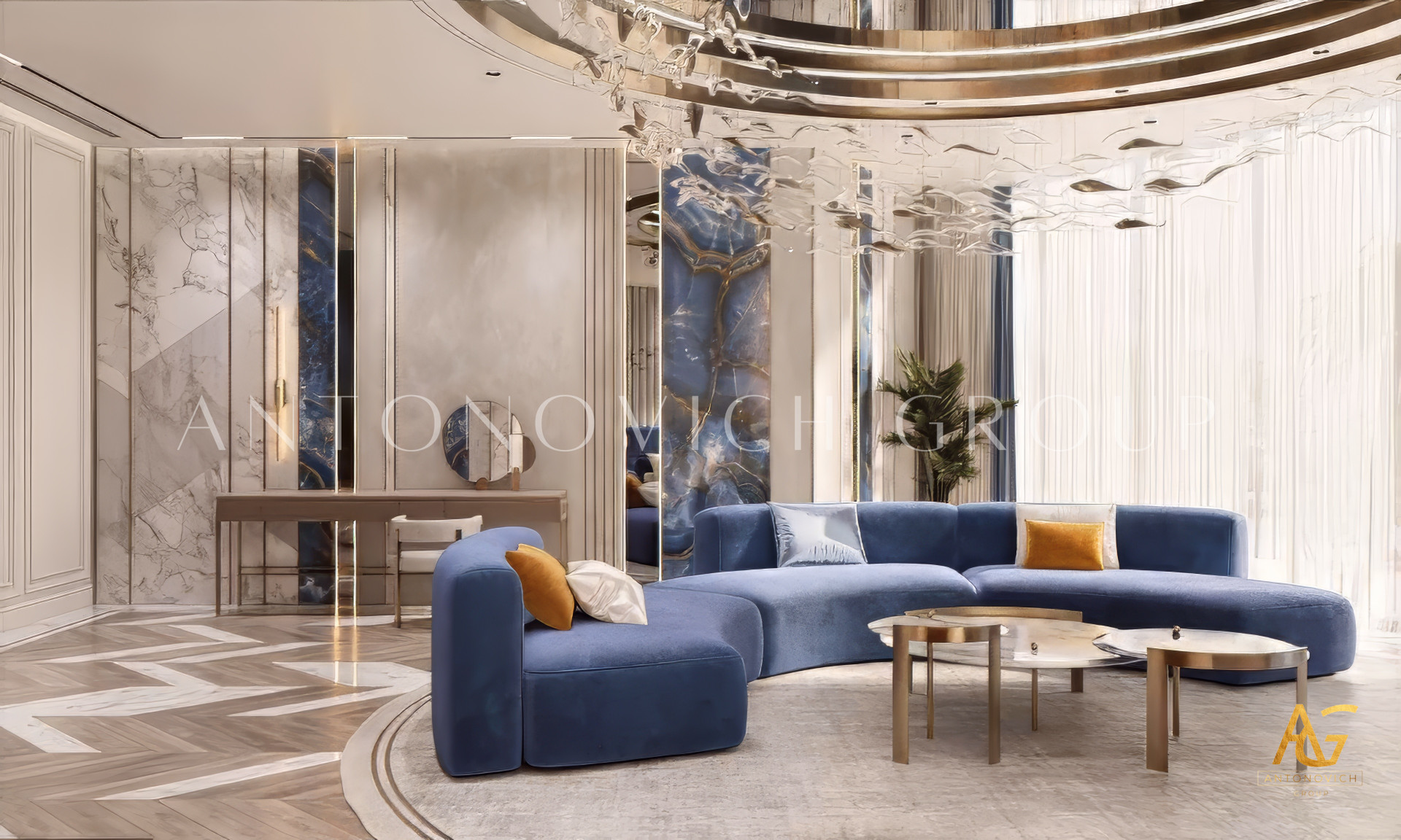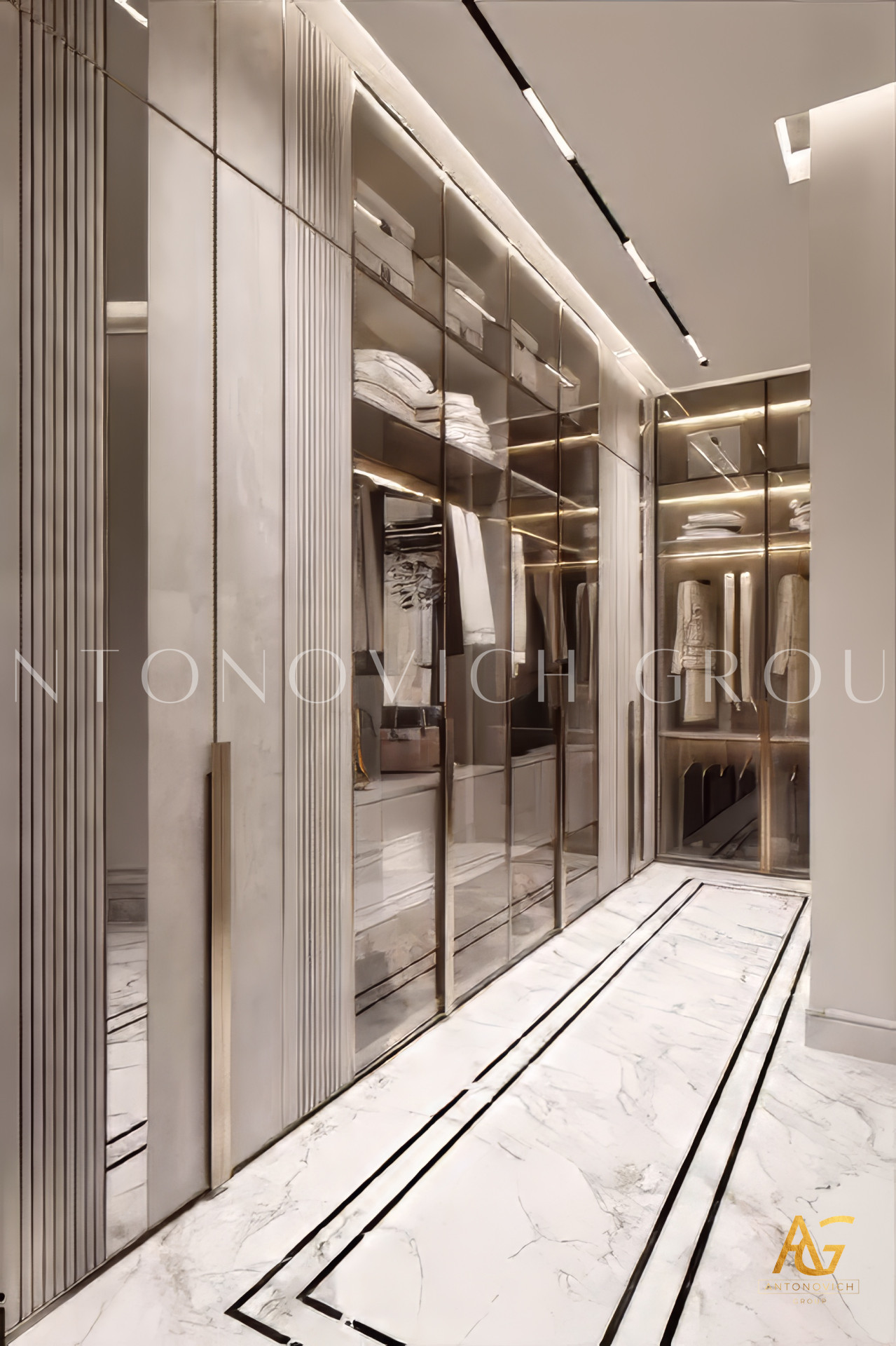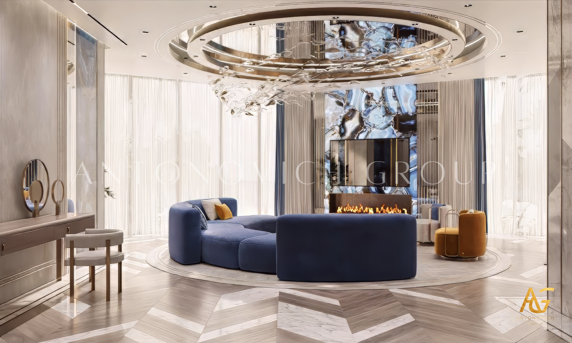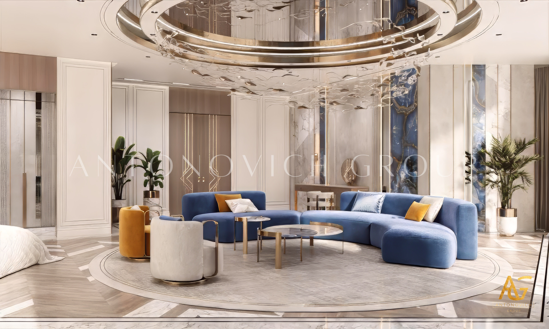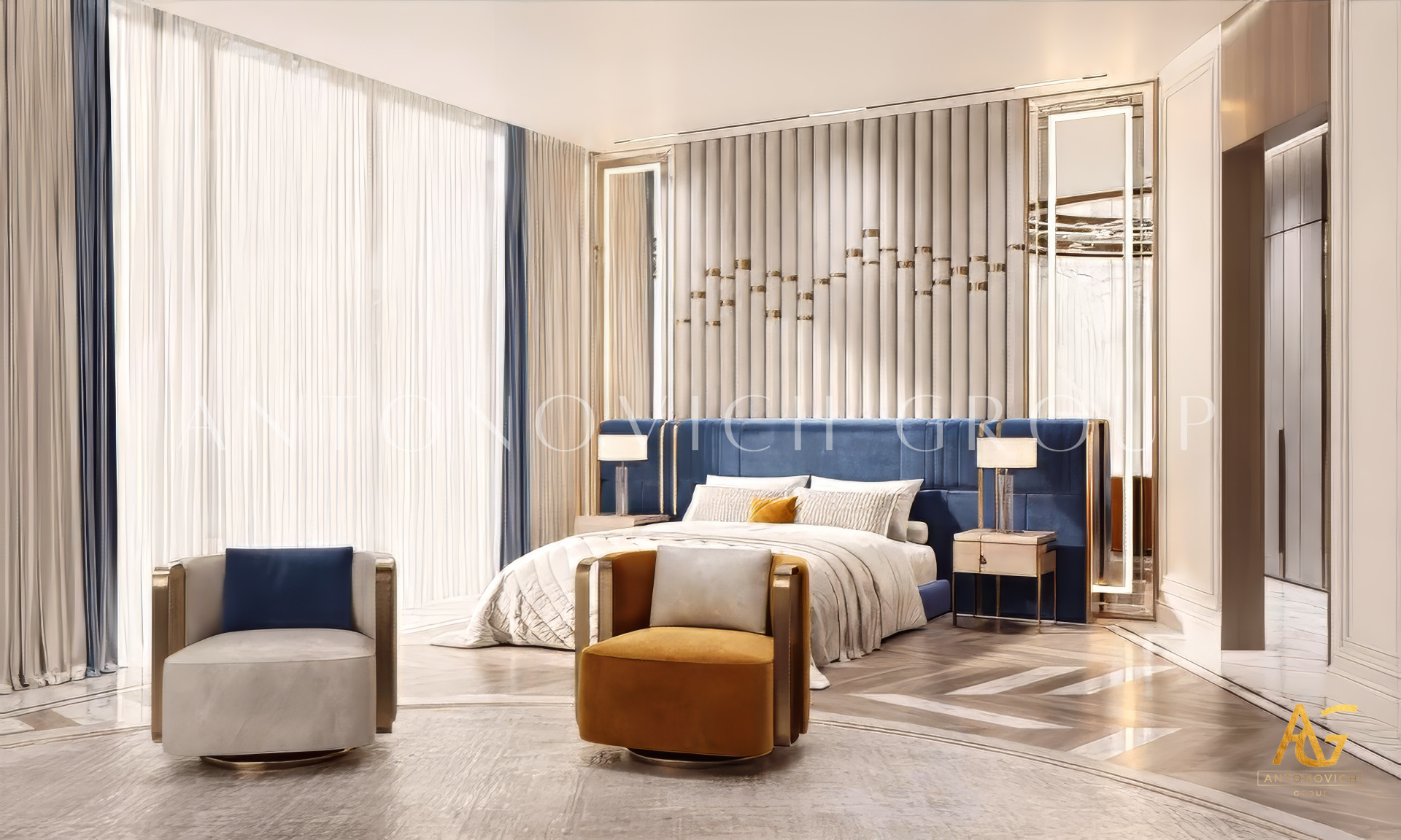 The violet and gold colors in the luxury interior design create a highly dynamic mood. The elegant and luxurious interior design features an intriguing space where you can relax all day. With its gold finish and sophisticated room, the interior design is done in a very attractive way. Luxury Antonovich Design has incorporated some incredible items into these stunning luxury bedroom interior designs. The dark crimson bed and chairs are both inviting and beautiful.