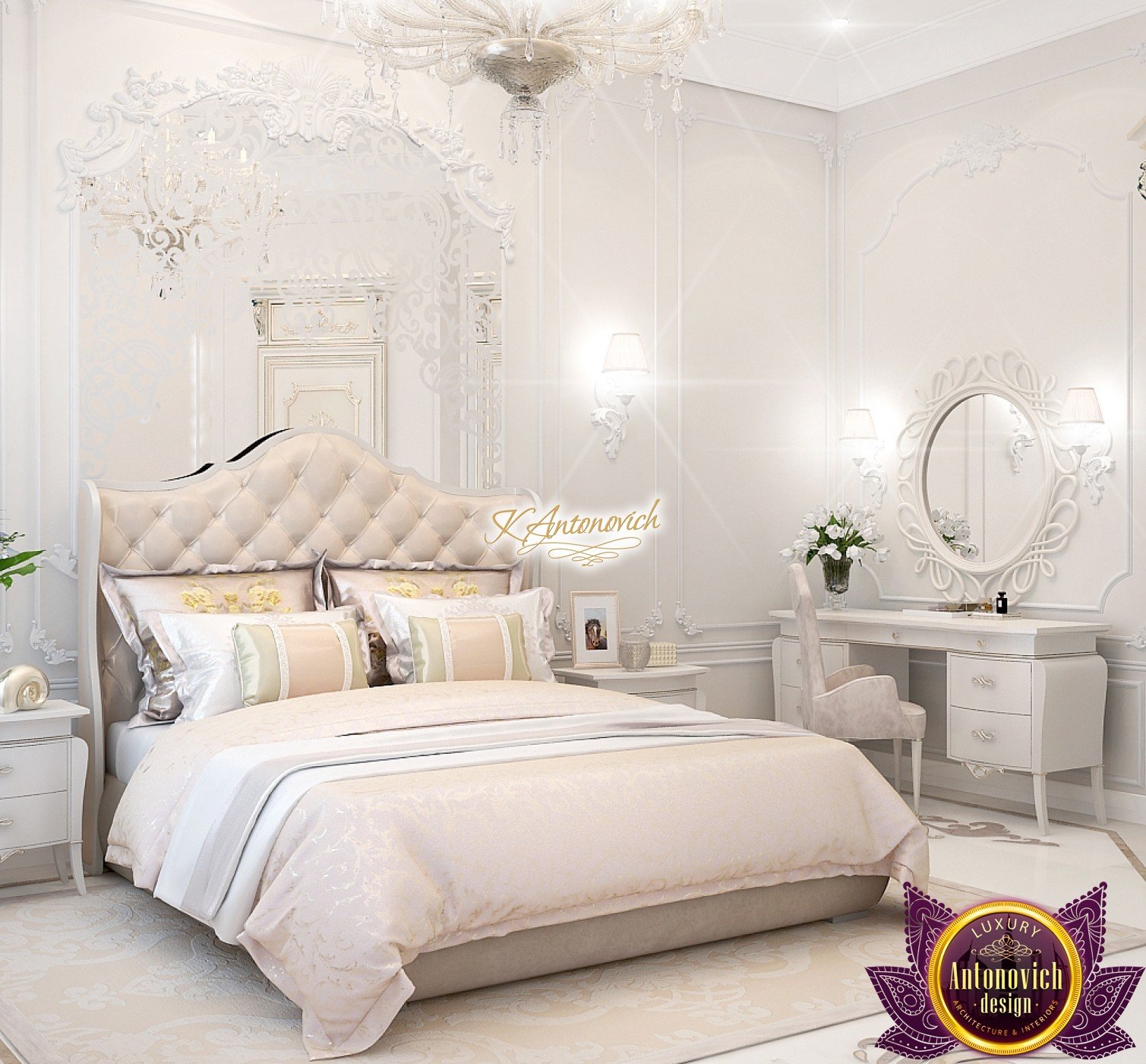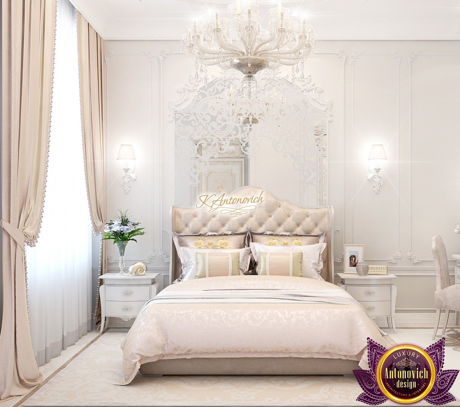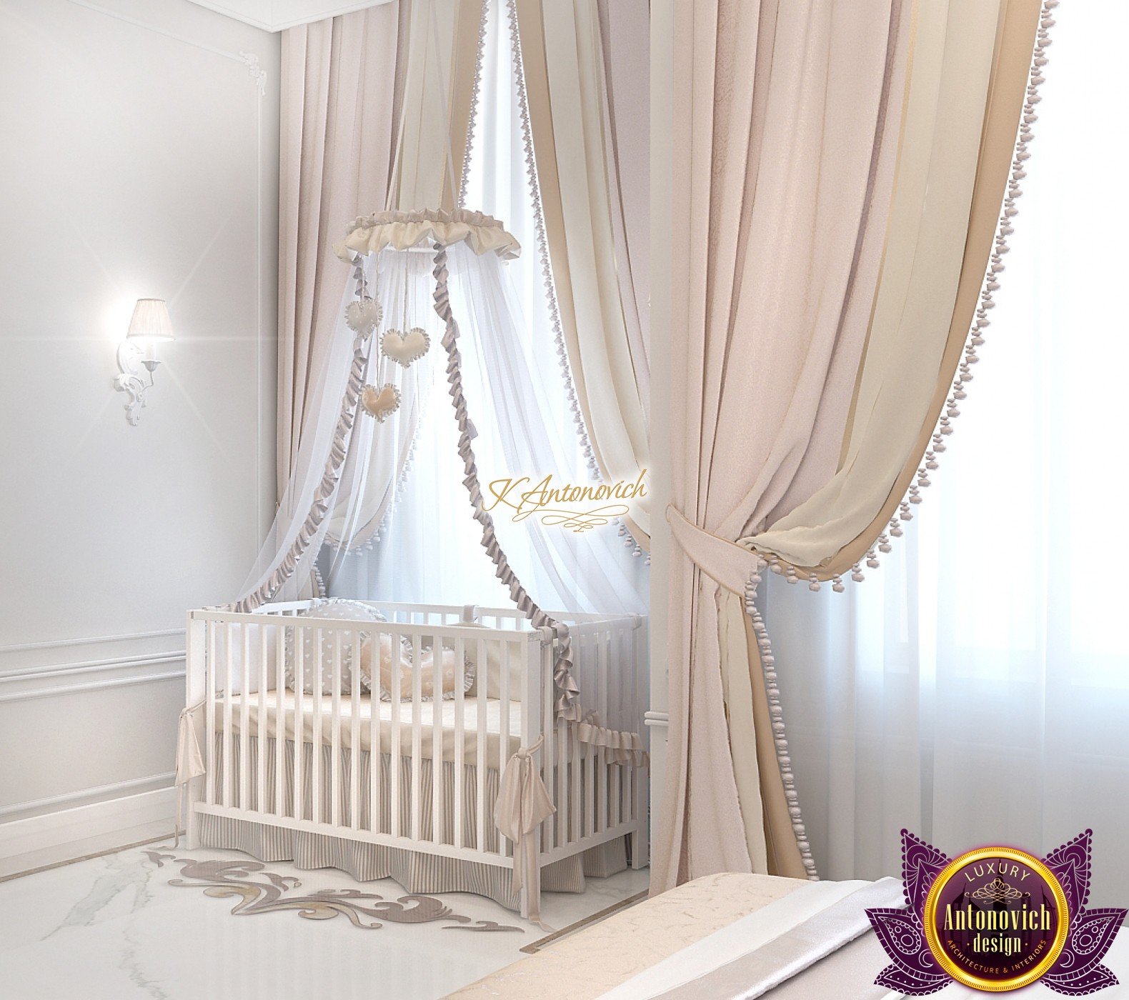 This bedroom interior has a special character of true happiness and tenderness. Work on such projects is extremely interesting. After all, here interior designers had to combine a charm of luxury bedroom interior and gentle nursery for the baby.Design a bedroom with cradle becomes the perfect solution for new parents. Thus, comfortable and cozy feels as parents and child, are close by.Interior design bedroom in classic style with a hint of Art Deco.The palette of colors in pastel shades is perfect for rooms where little child a lot of time spends.Because of this thought through special lighting standards. The whole interior of the bedroom looks very comfortable, elegant and respectable.To visually expand the room relatively small area, interior designers use such proven and luxurious method as mirrored panels.In this interior decoration the panel behind the headboard of a large comfortable bed made of a large mirror with a delicate openwork ornament. Charmingly blended into interior a beautiful bed with high upholstered headboard, which is upholstered with natural leather of cream-pink hue. This solution also provides additional comfort for the baby, as leather does not collect a lot of dust.Against the background of pearly white walls looks great classical sconces and elegant boudoir table with a round mirror.Curtains made of natural silk pale peach hue become an amazing finishing touch to a charming bedroom interior.