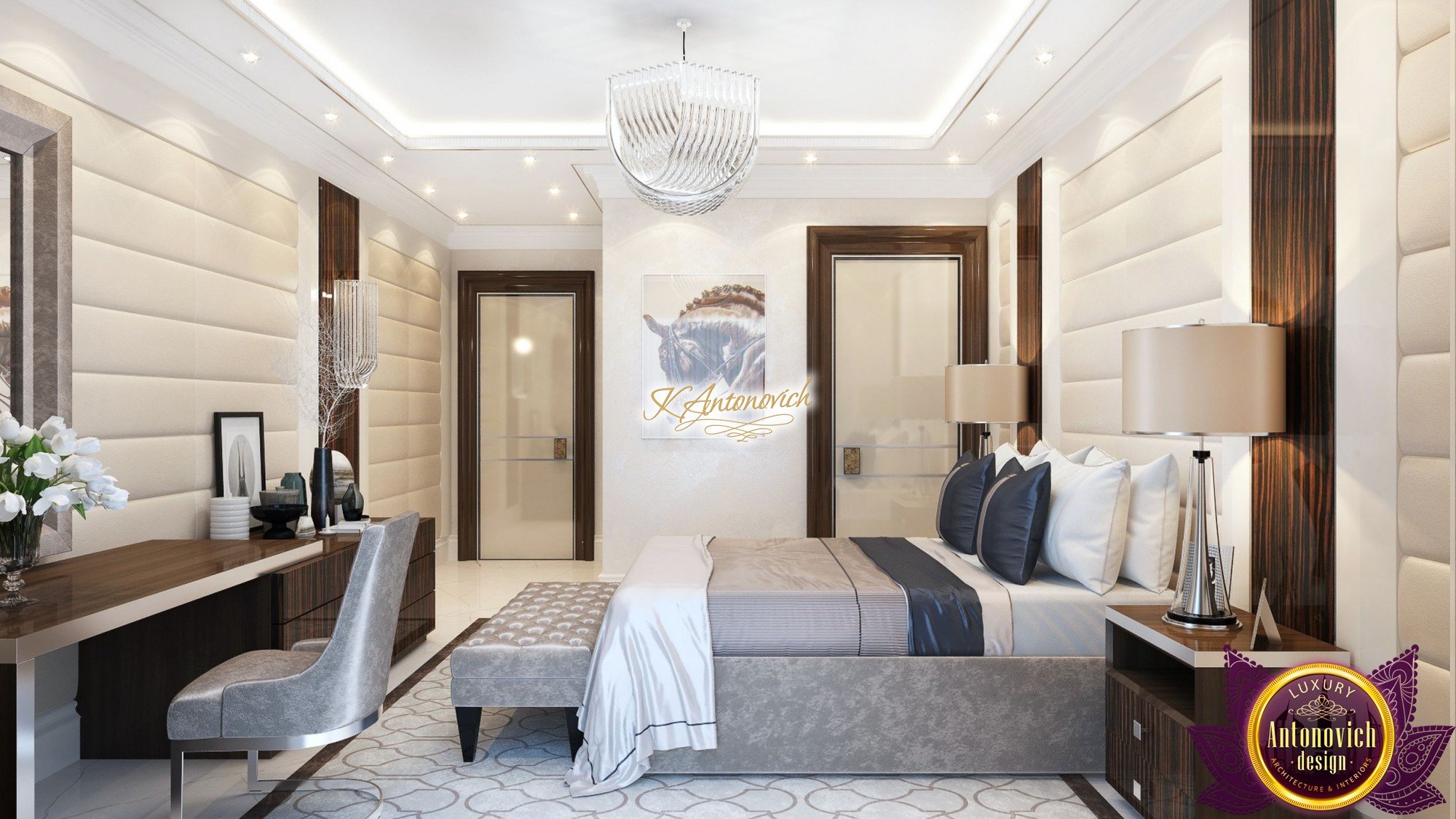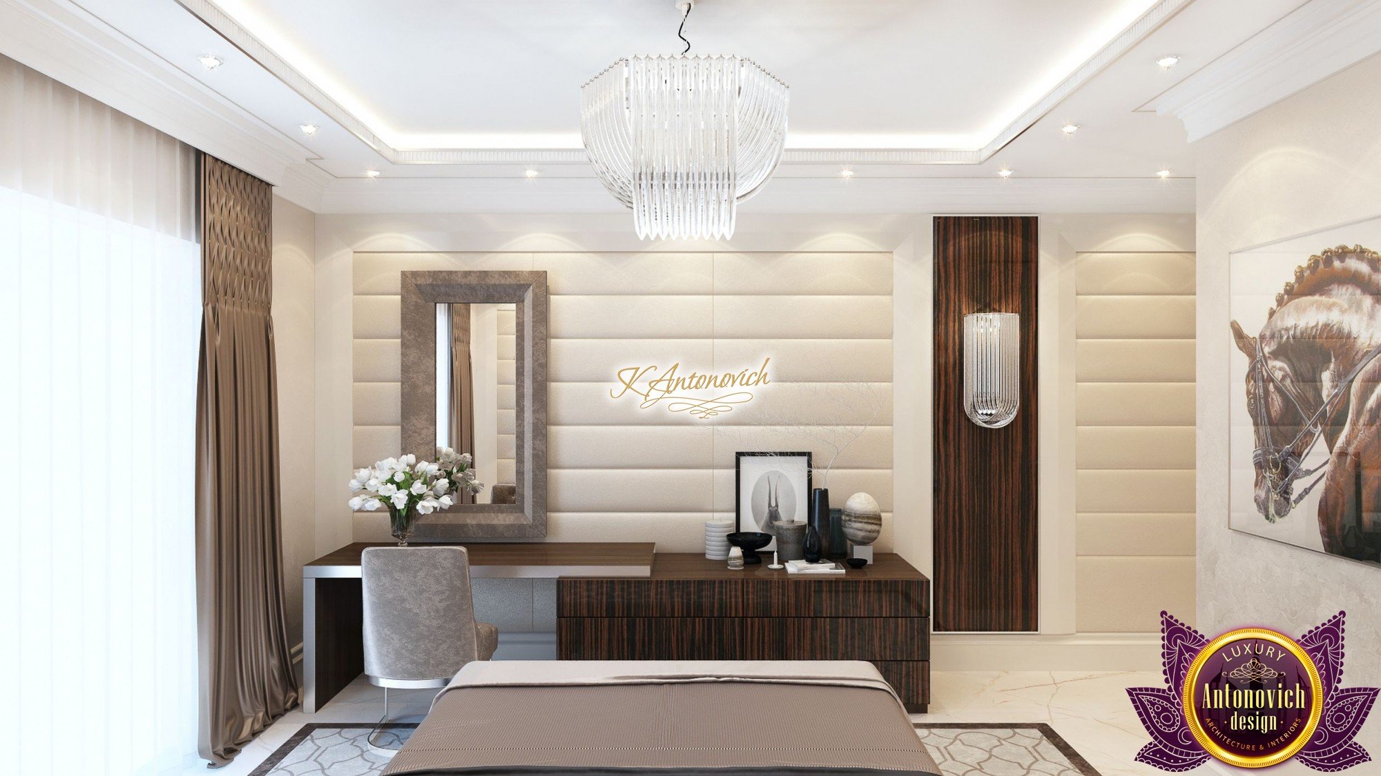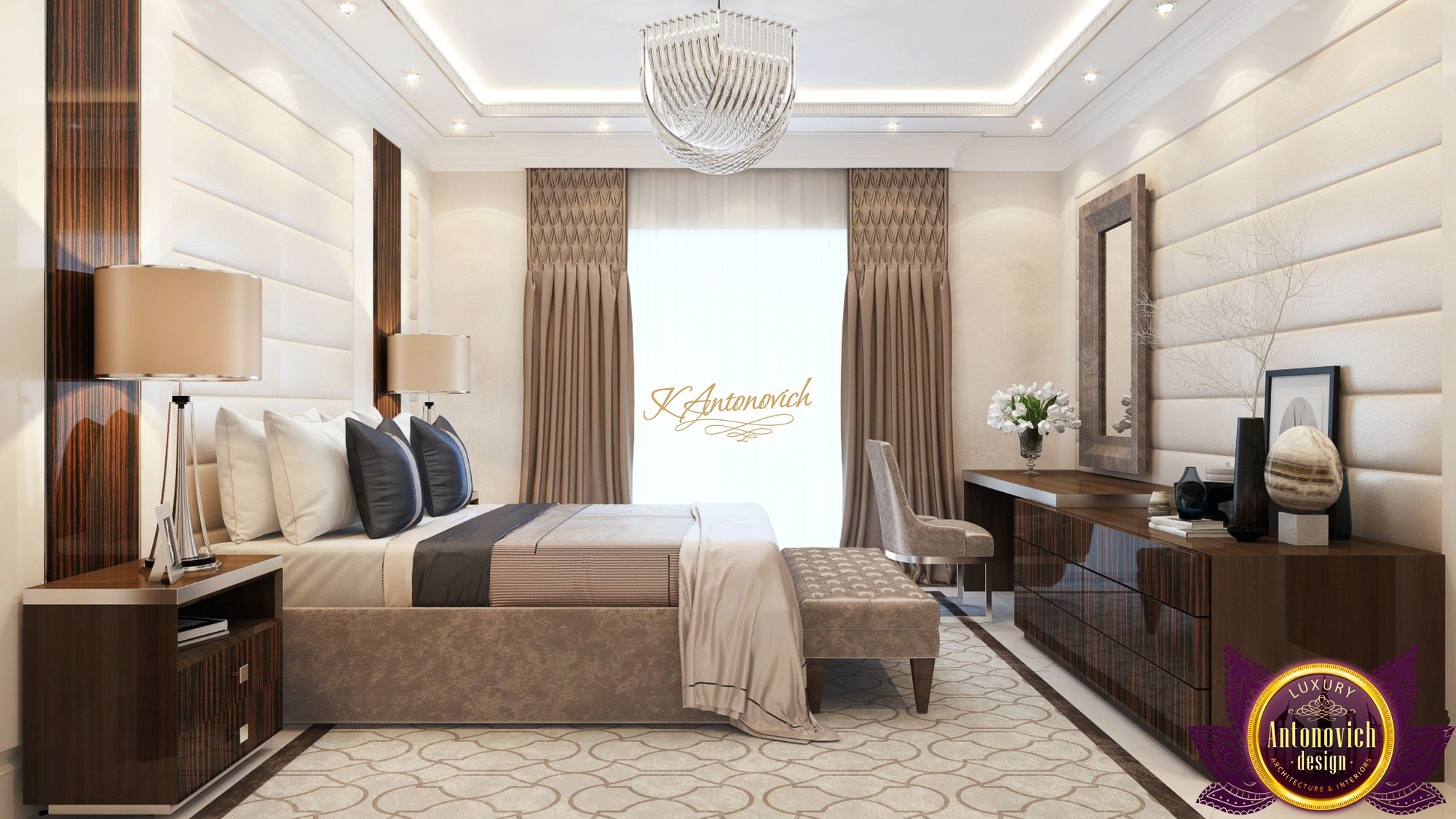 Design a bedroom in a modern style was good for decorating guest bedrooms in a luxury house. The friendly and hospitable hosts in such a way sought to demonstrate that they are always welcome guests and offer them the best.The gamma of warm beige and brown colors prevail in the interior of the bedroom.The big window decorated with beautiful curtains made of natural silk color of milk chocolate. Their, textile designers from studio Laksheri Antonovich design, complemented by beautiful box pleat. Refined and unpretentious looks translucent tulle of milky hue. Special attention the interior designers pay to wall design.Two opposite walls are decorated with luxurious decor panels.Soft panels of creamy color genuine leather look superb. A special method of laying in the form of shallow grooves in vertical wide stripes visually lengthens the interior of the bedroom.Decor panels are not only wonderfully decorate the interior, but also serve as an excellent soundproofing material. The soft panel also serves as a large comfortable bed headboard. It is framed by panels made of wood valuable species, which is covered with varnish.With these panels perfectly matches the furniture in bedroom interior. In the room all very harmonious, comfortable and functional.Friendly and laid-back nature of the interior continues in the ceiling decor. A shallow niche around the perimeter outlined by a line of soft lighting. nd in the center, the ceiling is decorated elegant chandelier in the style of Art Deco. For floors, interior designers offered precious marble and soft natural carpet.