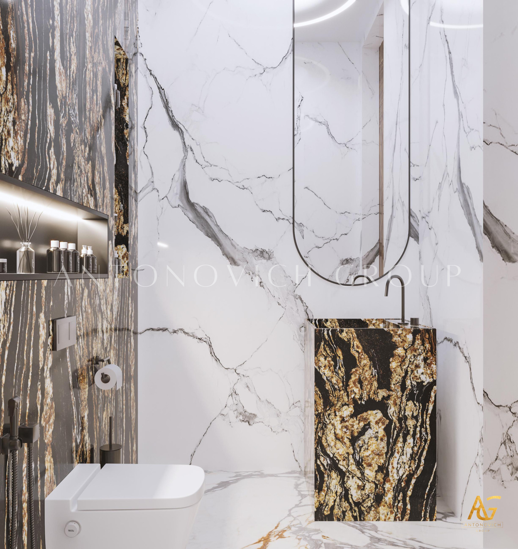 The luxurious bathroom is full of elegant and unique decor elements, each of which is a part of a unique image. Interior Designers Dubai skillfully placed into the time-honored tradition notes of contemporary trends. One of the highlights of the interior became a hanging closet with a sink, which is decorated with soft panel of genuine leather. Soft lights form a beautiful visual effect of weightlessness. Elegant decor element became the original tiles with texture that visually replicate a soft finish of the sink. Against this beautiful background bathroom interior is decorated with a large mirror in a carved gilt frame. Combination of gold, marble and creamy shades sets a gentle mood of the interior. The architectural villa design in Dubai has several bathrooms. Each room at the request of the owners of the house has become an obligatory element of the window. In this bathroom window is decorated with exquisite sided curtain of translucent silk. Noble marble floor and wall decor complement the noble and respectable image of the interior.