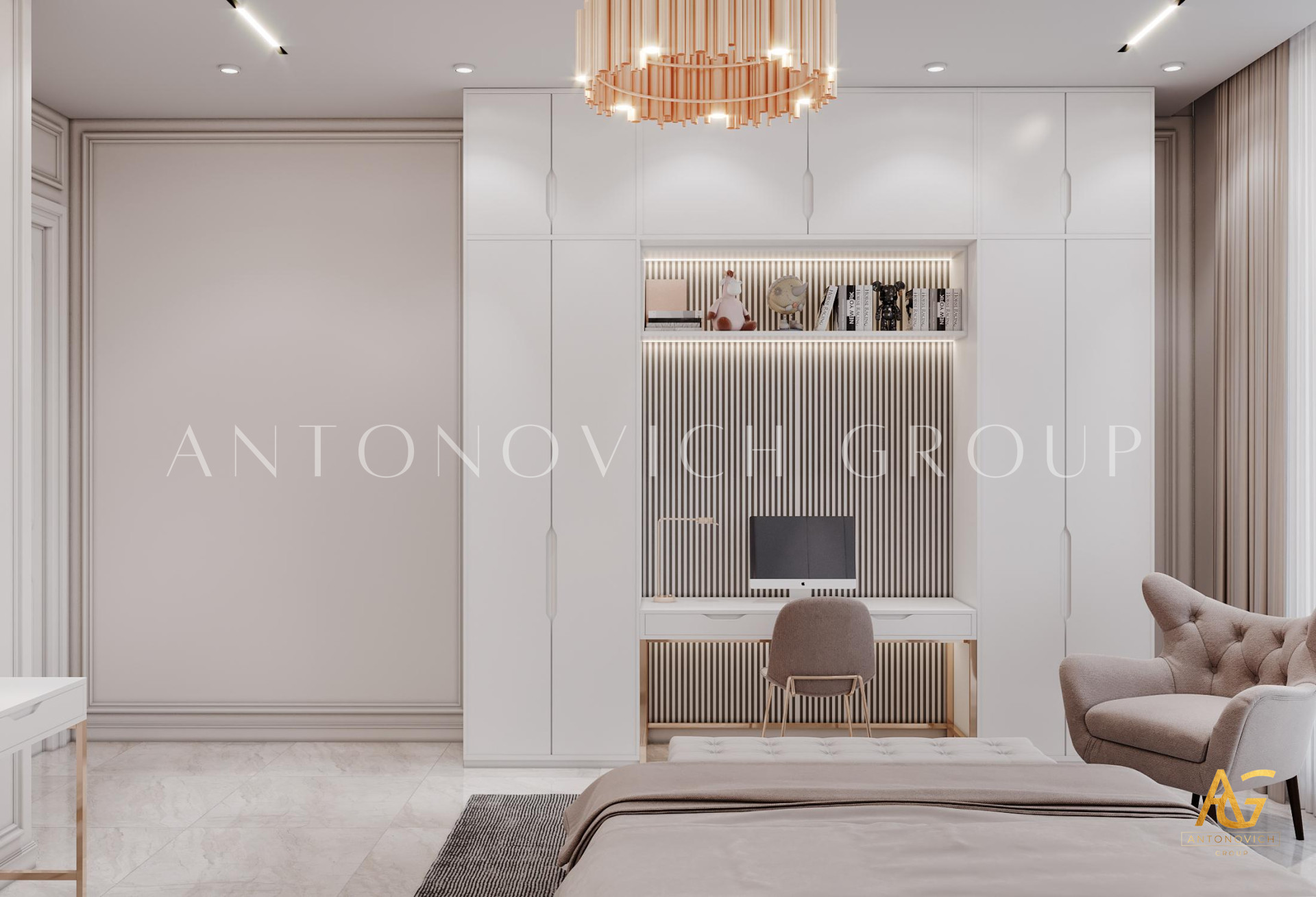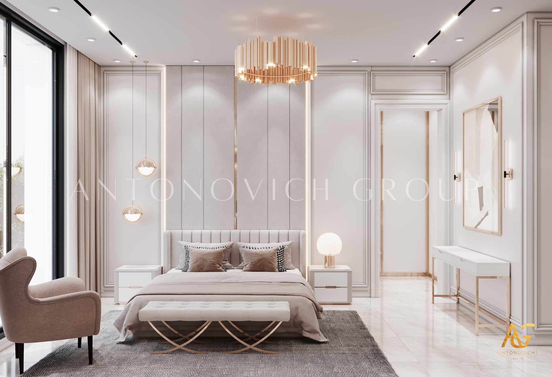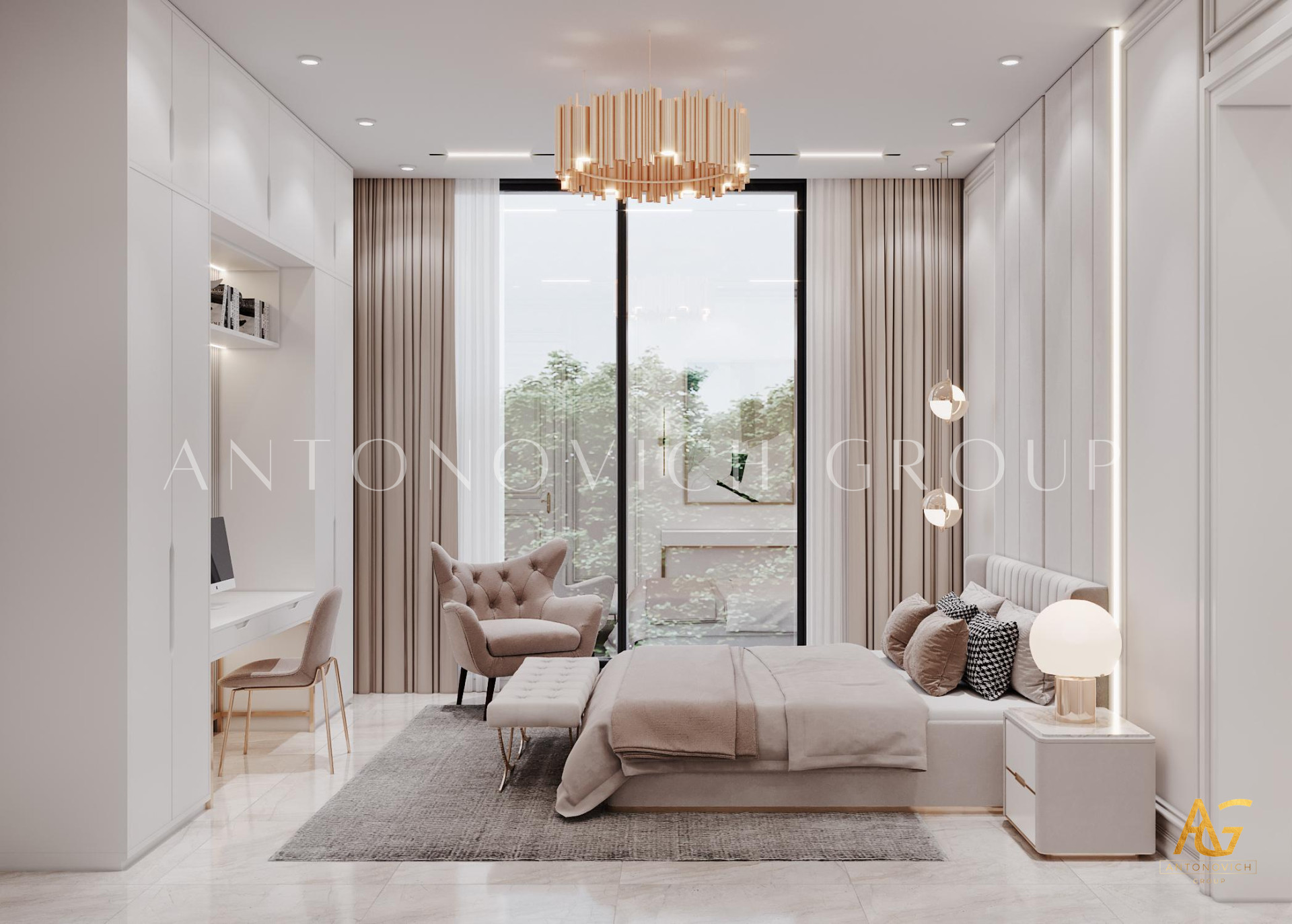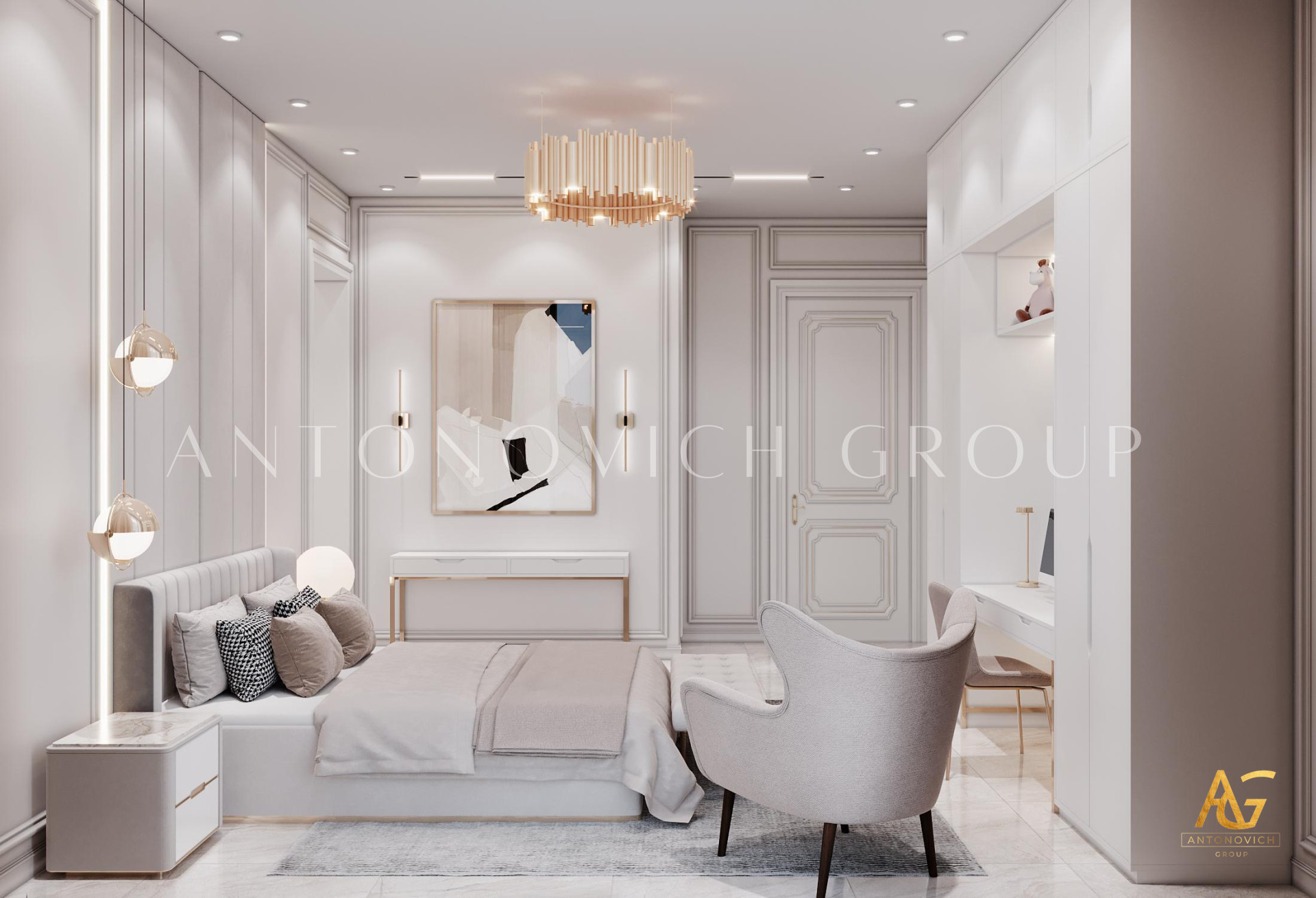 In this bedroom interior design, Luxury Antonovich Design has performed the best decorating techniques wherein every hues and texture that has been implemented has in consistency in style and quality. To become the top interior design company UAE, it has been always a must for Luxury Antonovich Design to keep the high standards towards in every furniture selections, likewise, this bedroom interior design which has the most glamorous setting of exquisite furniture and decoration. Since that the bedroom has a very spacious interior, Luxury Antonovich Design has executed a very artistic setting towards every walls, A set of geometrical shapes using a gold plated accent creates the finest art design that enhances the style and modernity of the bedroom. Dark beige, white and gold was indeed such a luxurious fusion which has been perfectly achieved in this bedroom interior design.