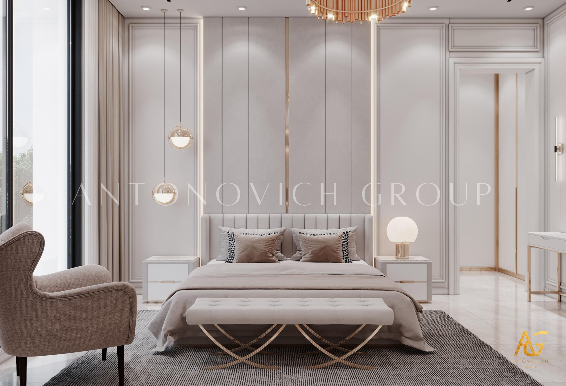 The ceiling scheme of this bedroom has the most wonderful details that aside from having the most luxurious chandelier design, Luxury Antonovich Design performed an amazing scheming towards ceiling details and secondary lighting effect that creates very cozy and calm atmosphere. The chandelier design with a luxurious touch of modern style has black cones covering luxurious details of the base and stem in white and gold color. As the top interior design company UAE, Luxury Antonovich Design keeps on discovering new style and decoration setting that makes the bedroom looks more sophisticated and stylish and with this luxury modern bedroom interior design, Luxury Antonovich Design installed a wall hanging side lamps towards the bed with a matching details of design in the chandlers which achieves the most fascinating result. Luxury bedrooms for expensive villa design have indeed a very remarkable interior setting and as the top interior design company UAE, Luxury Antonovich design always sets the highest standards and new design trend to achieve the best bedroom decoration.