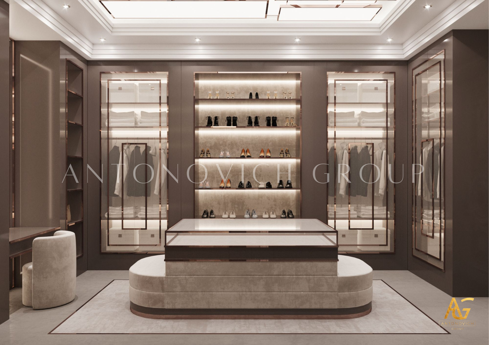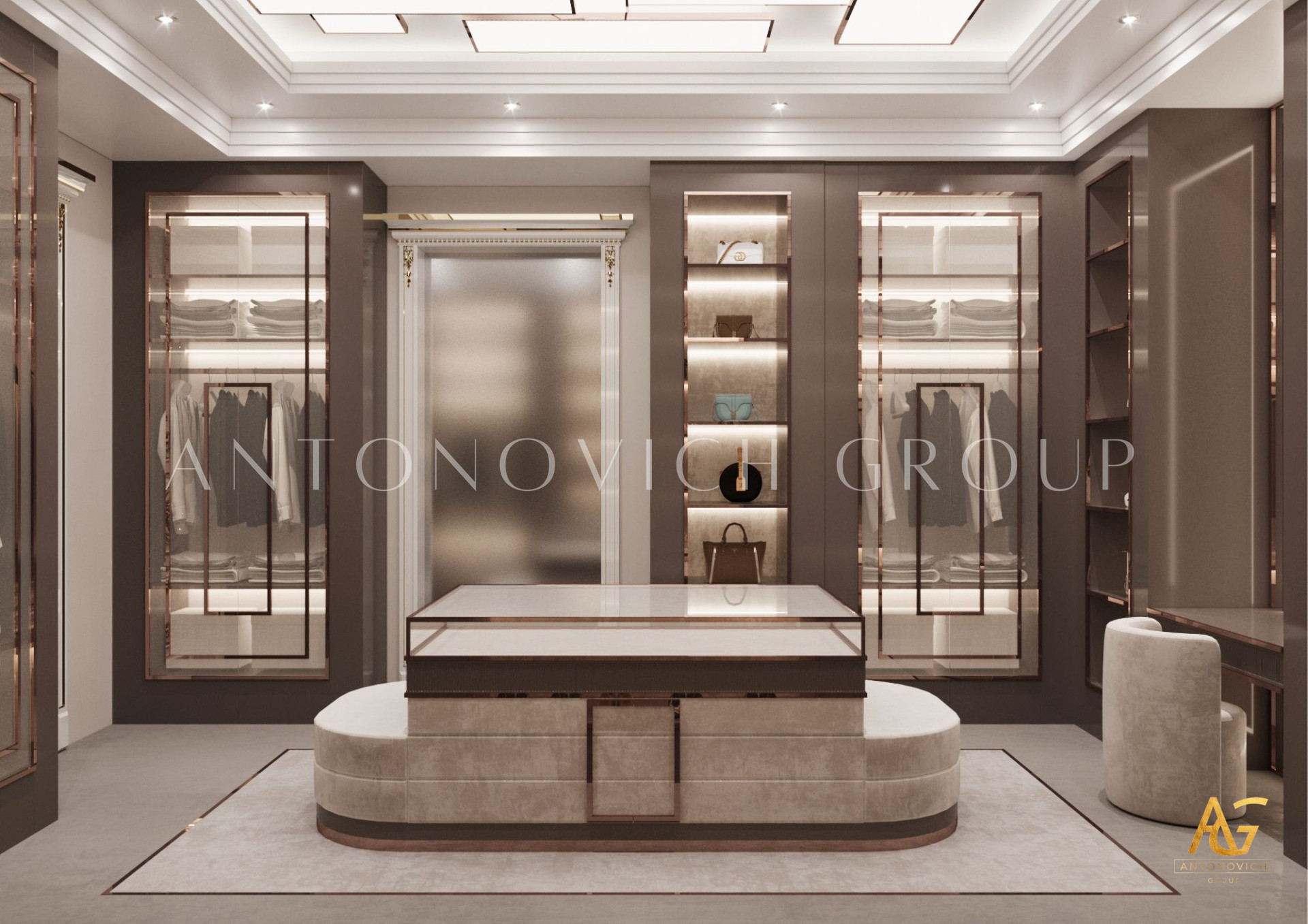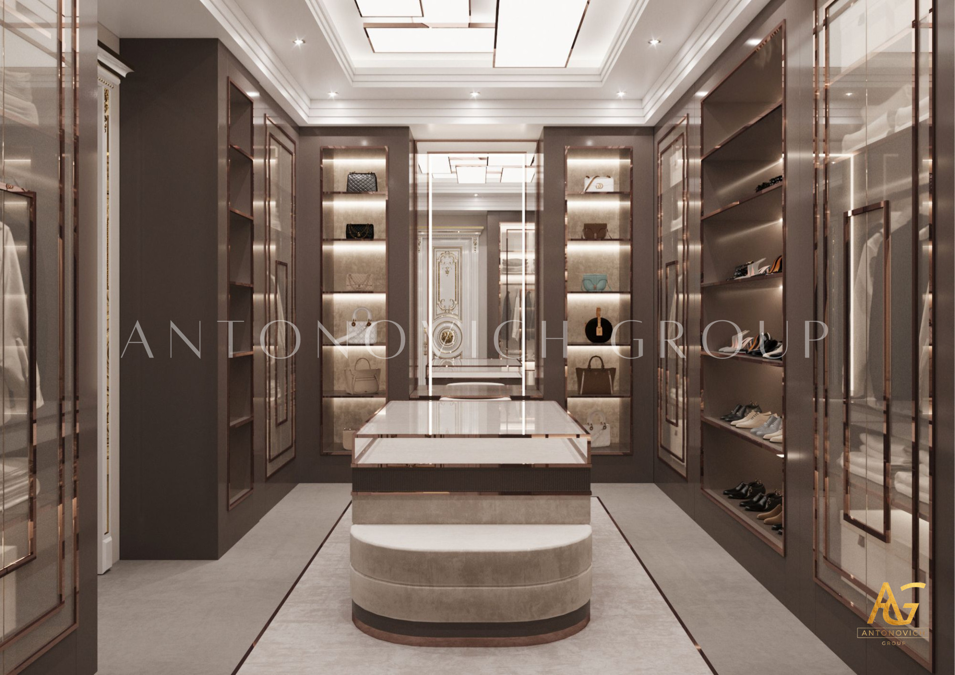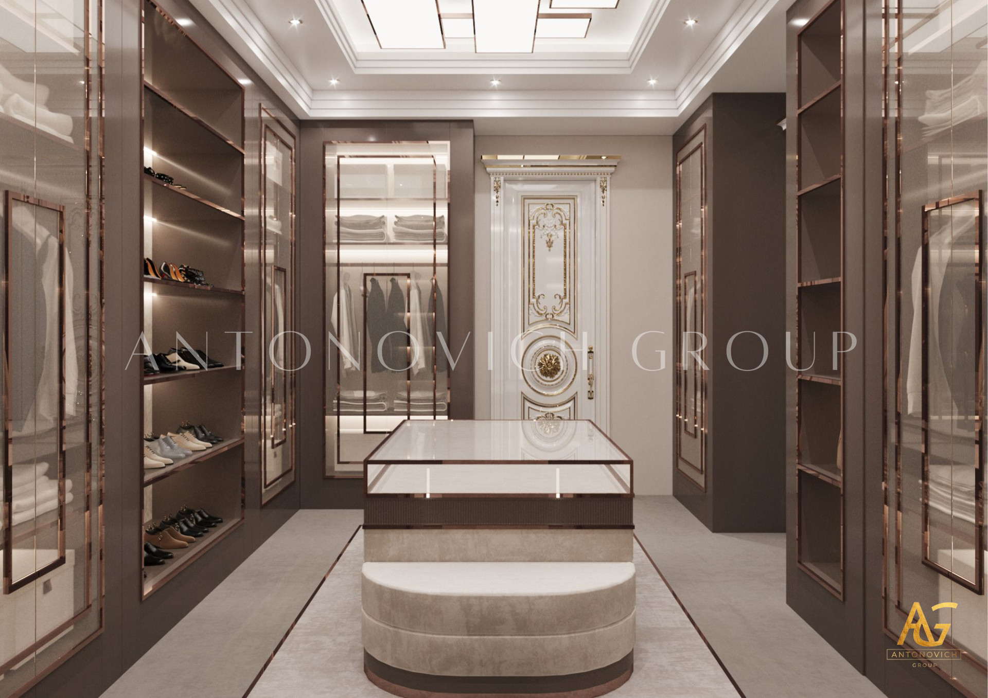 A lot of people dream of having a luxury wardrobe room. In this project made by Luxury Antonovich Design, the luxury wardrobe room is made perfectly by having the right furniture designs, the perfect wardrobe cabinet, and drawers that will help make the room more organized. The luxury wardrobe room also has a very huge mirror where you can take your everyday outfit with class and elegance. The luxury wardrobe room is designed in a spacious way. Dressing up here won't be a problem as it has such a nice layout.