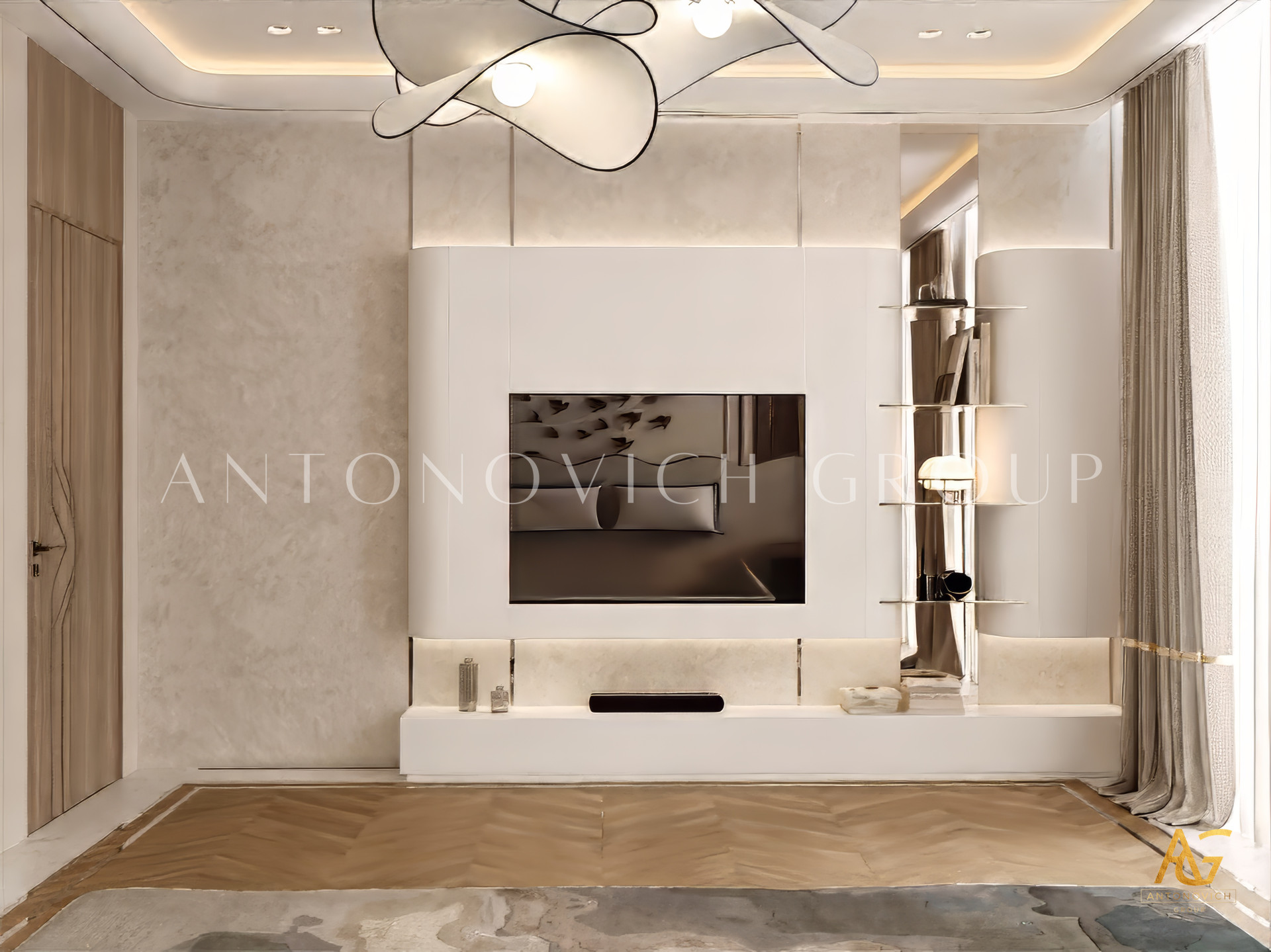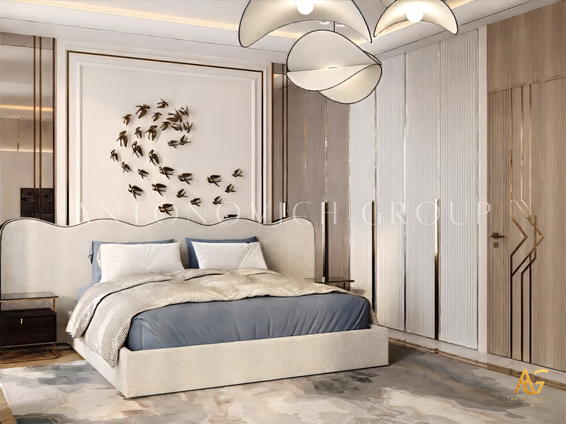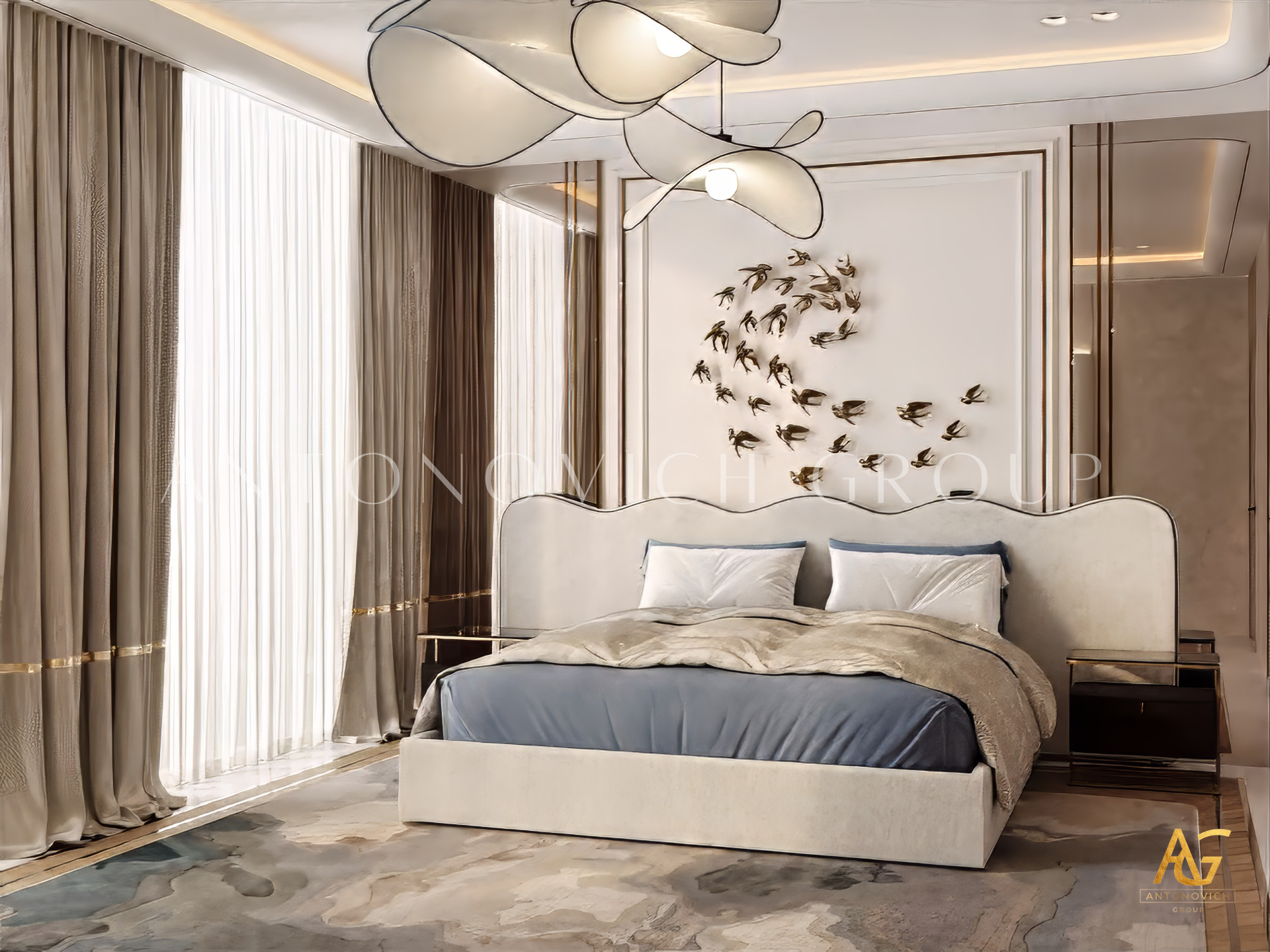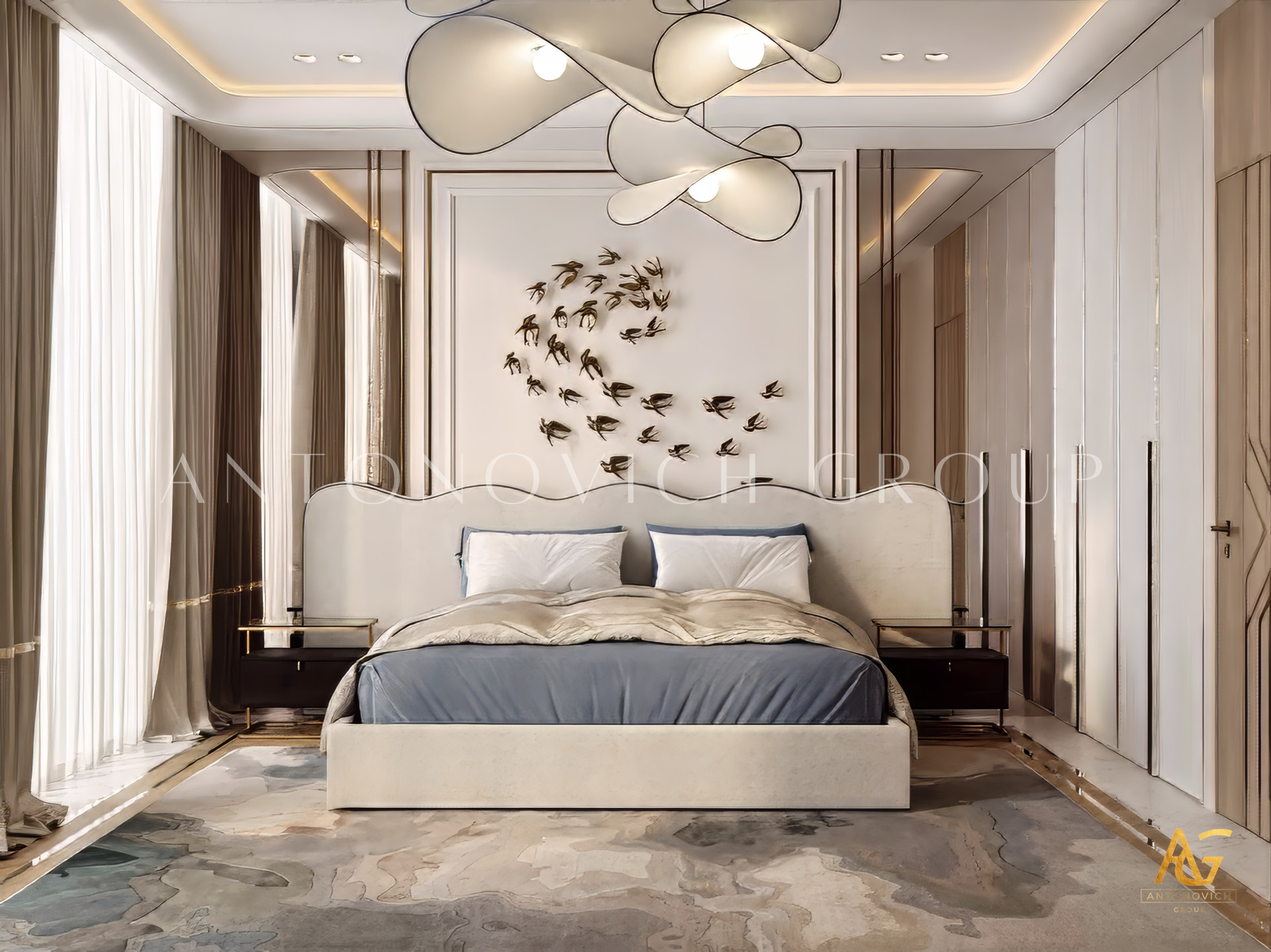 Acquaintance with each interior begins with a first glance, from the first sensed emotions. Looking at this bedroom interior, first of all, feels a pleasant feeling of calmness. Light features of neoclassicism are perfectly intertwined with modern style. This relatively small space, designers of the interior design studio Antonovich Design managed to turn into a cozy oasis for a comfortable life with beautiful features. In the predominant pearl and cream shades, the accents of silk velvet in lilac tones look great. The designers of the studio made the windows more expressive, framed by curtains made of natural silk of bronze shade. This same combination of colors is repeated in the decoration of the bed and the decoration of the wall behind its headboard. A soft headboard with a deep diamond-shaped texture and classic buttons gives this part of the bedroom interior space a wonderful charm of elegance. For the decor of the wall, interior designers suggested a velvet panel with laconic ornaments, which looks bright and vivid thanks to the inlays with Swarovski crystals. Additional illumination on the panel reinforcing the bright shine and beautiful image of this decor element. To extend the interior of the bedroom, designers use such a traditional element as faceted mirror panels which decorate the doors of the closet. The ceiling with a shallow niche, elegant chandelier and a line of LED lighting is outlined by a beautiful molding with stucco decoration and gilding. Molding visually combines the interior of the bedroom and makes it more integral and expressive.