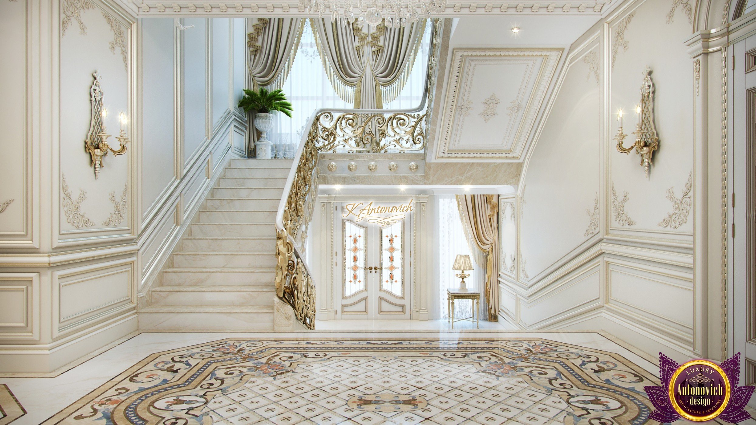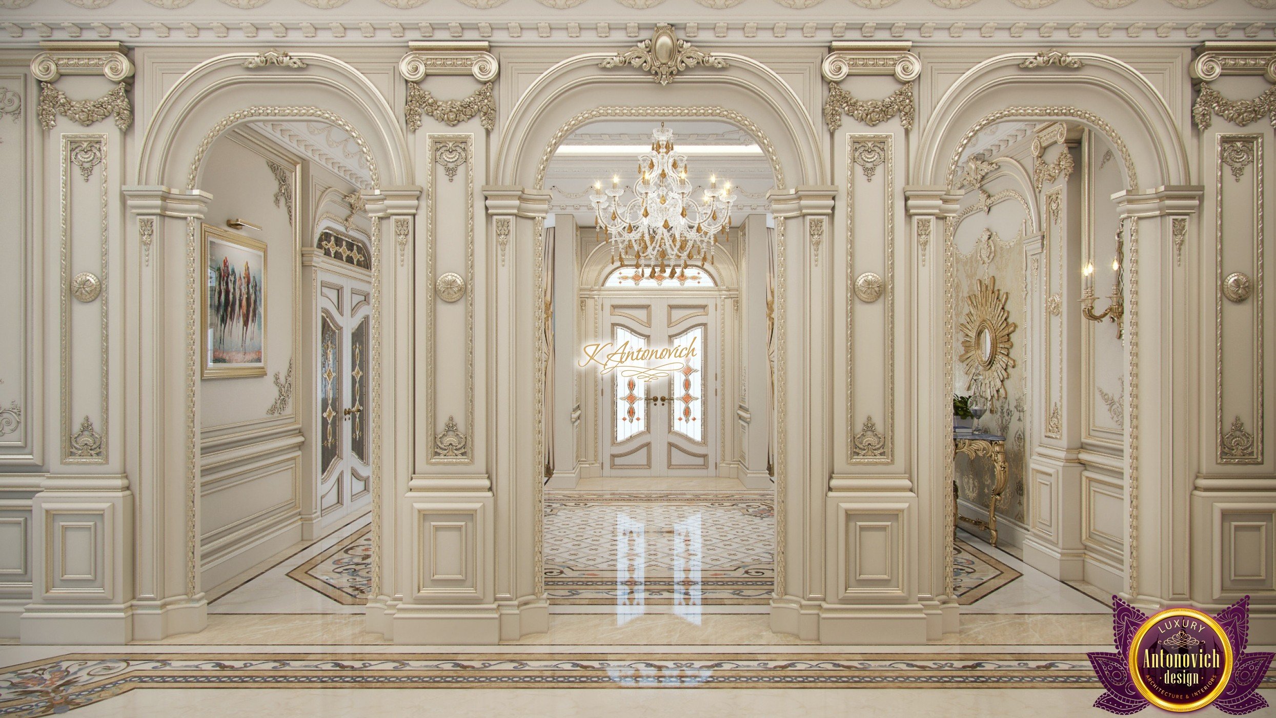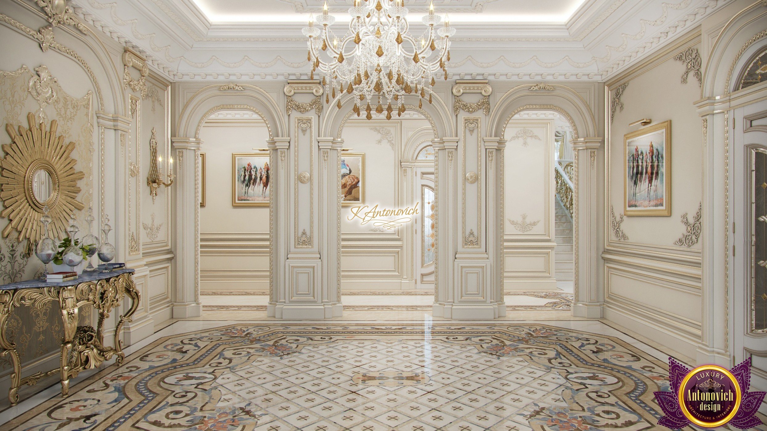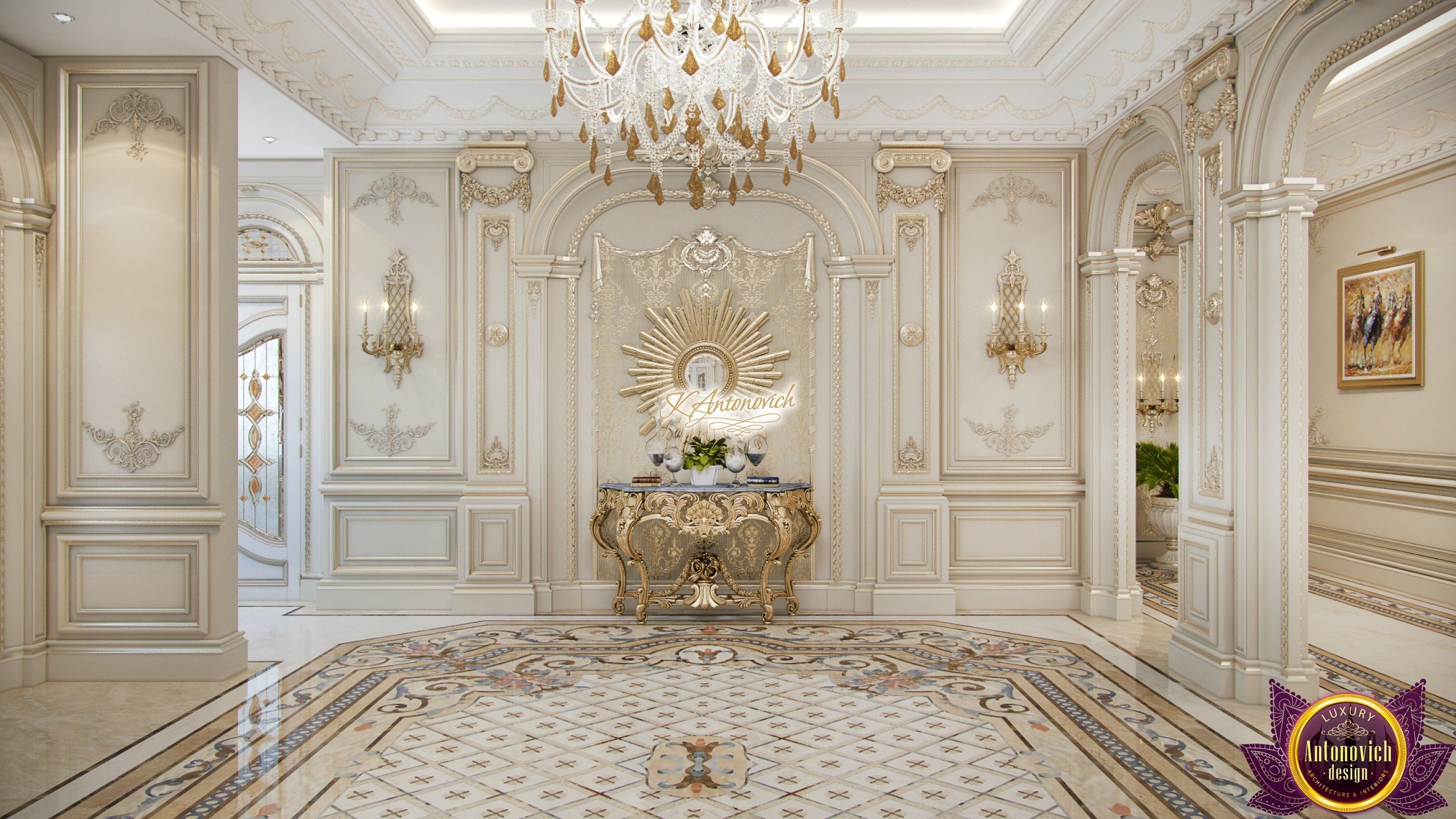 Luxury and beauty the interior of the house in classical style is reflected in the amazing in its beauty the details of the decor. Interior designers have created an extremely elegant and aristocratic interior of the modern family nest. It is the classic style of the interior becomes a way to establish family traditions and create a comfortable home in which will be enjoying the comfort and coziness more than one generation of the family. And this gentility and respectability begin with the spacious hall interior.Rich wall decor is worthy of the royal palace. Decor is based on an elite decorative plaster gray shade.Against this background, very bright and saturated looks elements of the stucco decoration, which is covered with gold leaf. One of the highlights, which is brought into the interior festive spirit of art deco, has become wall decor near console table. Console on carved gilded legs perfectly combined with the beautiful frame of the mirror in the form of the sun. A significant part of the wall decor, became paintings, with special lighting. This element clearly shows a good taste of house owners and their love of art.Marble floors have become one of the most picturesque parts of the interior. Classic ornaments made of marble of various shades resemble little beautiful Persian rug. The ceilings are decorated with quite deep niches. They are outlined by the wide moldings with large swirls of stucco decoration.This sculptural element seems to be more expressive due to the additional illumination.Interior of the house in the classical style gives pleasant aesthetic emotions.