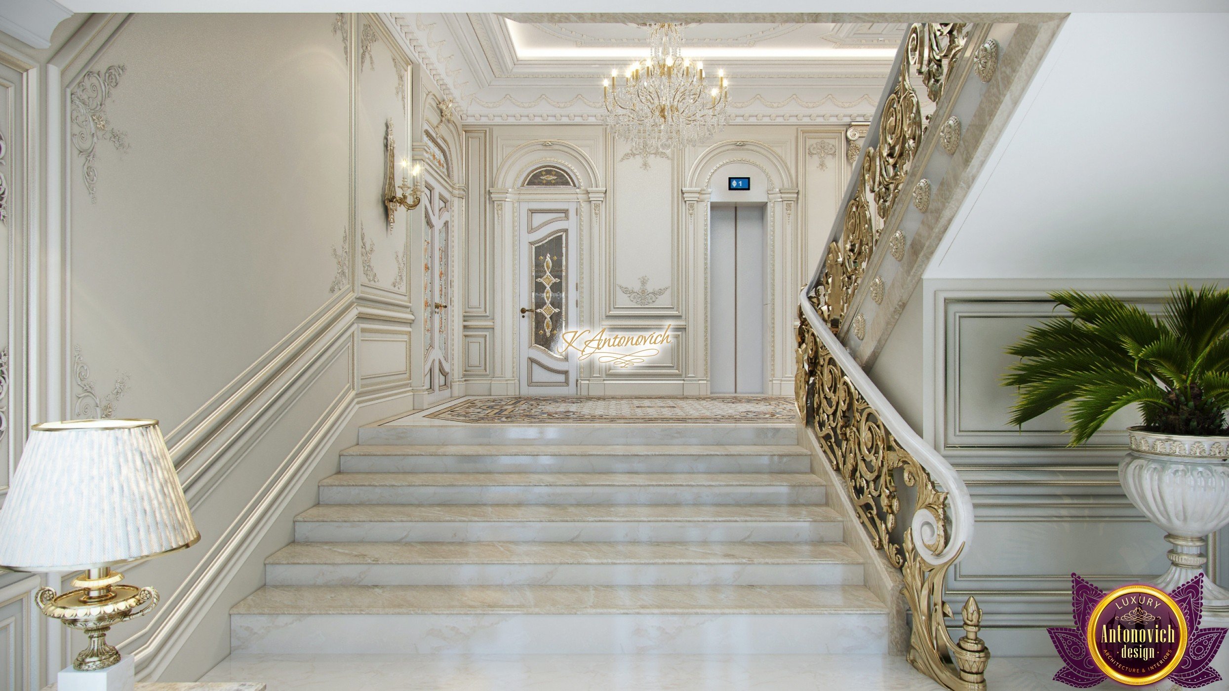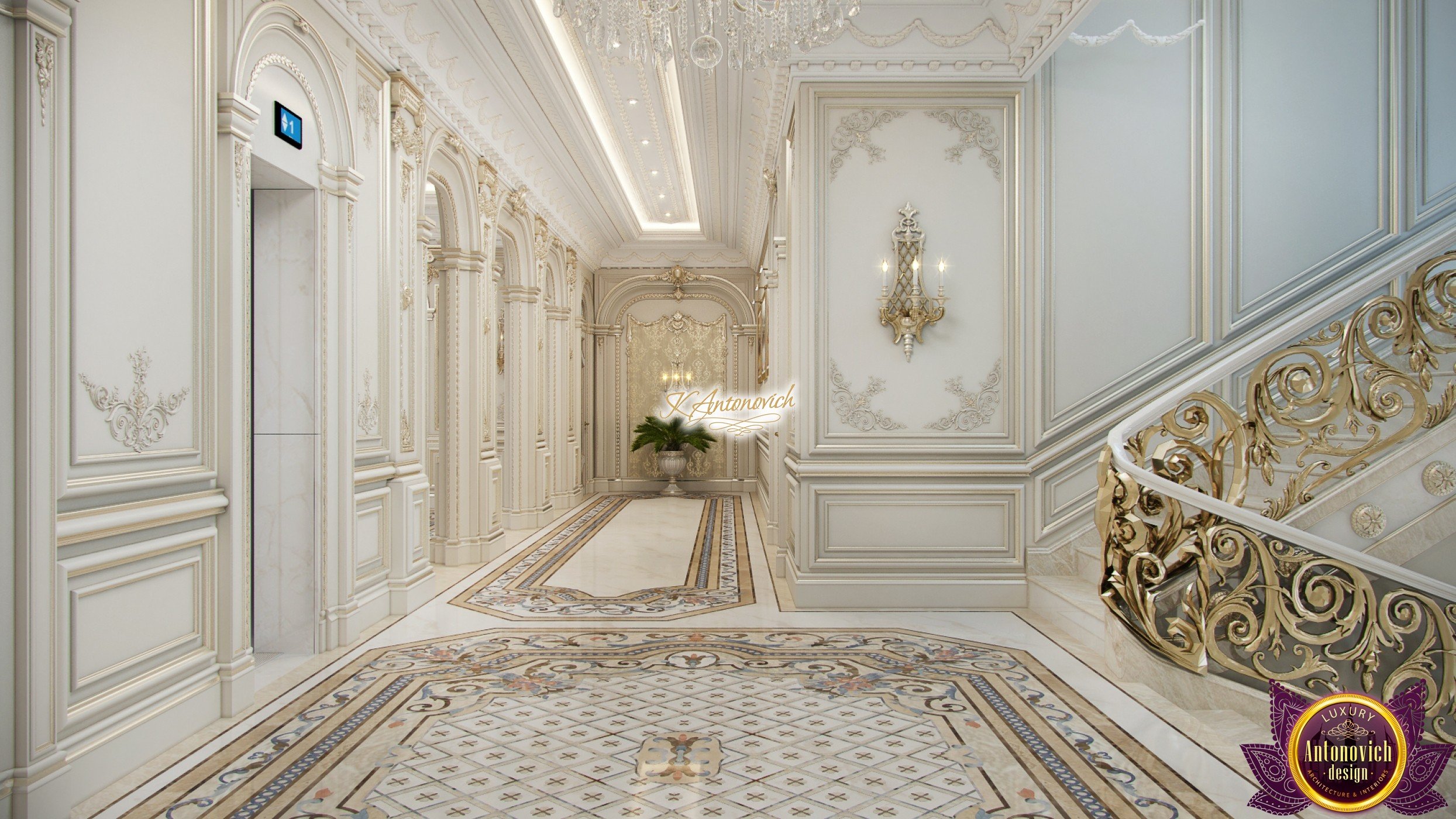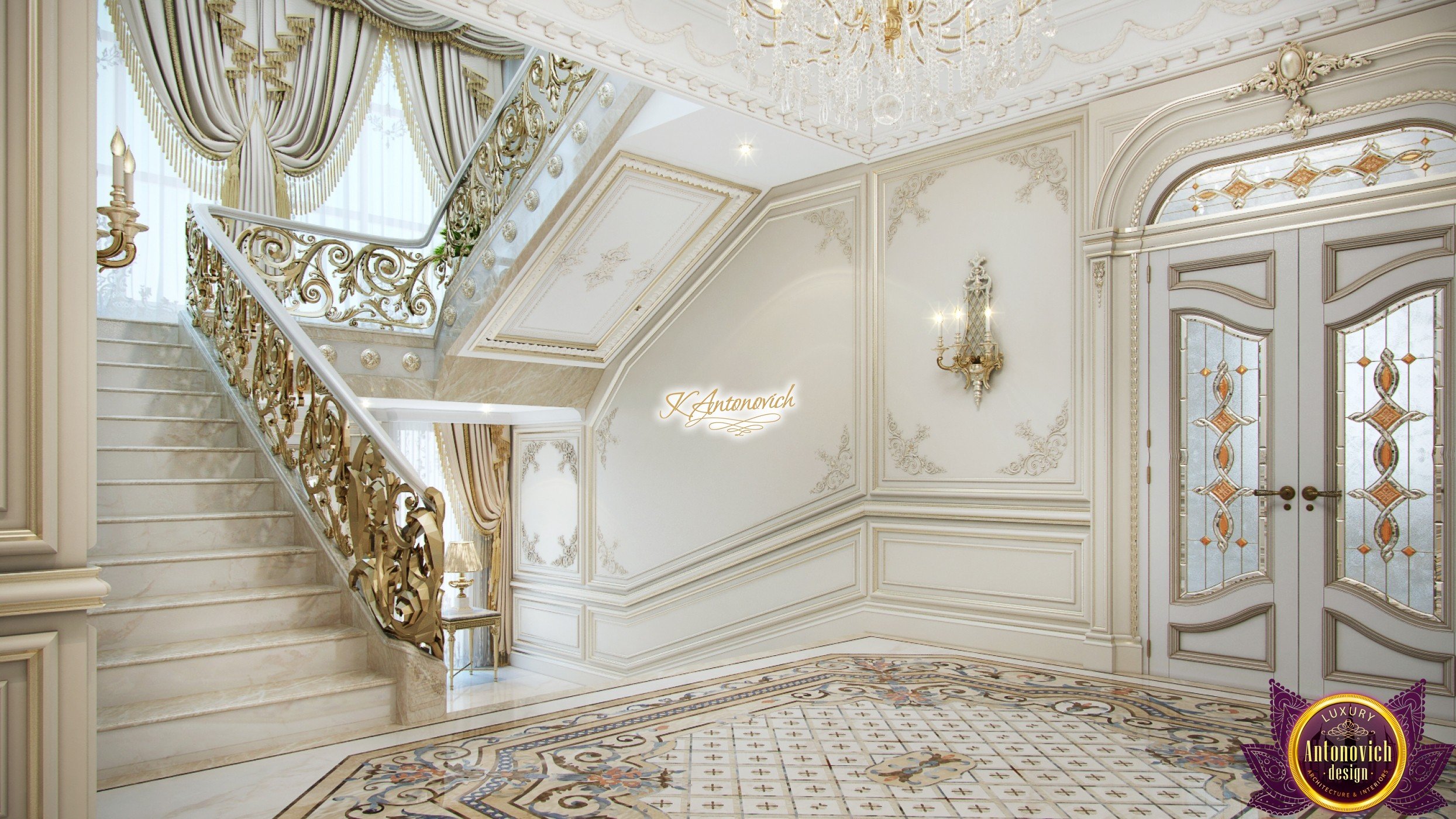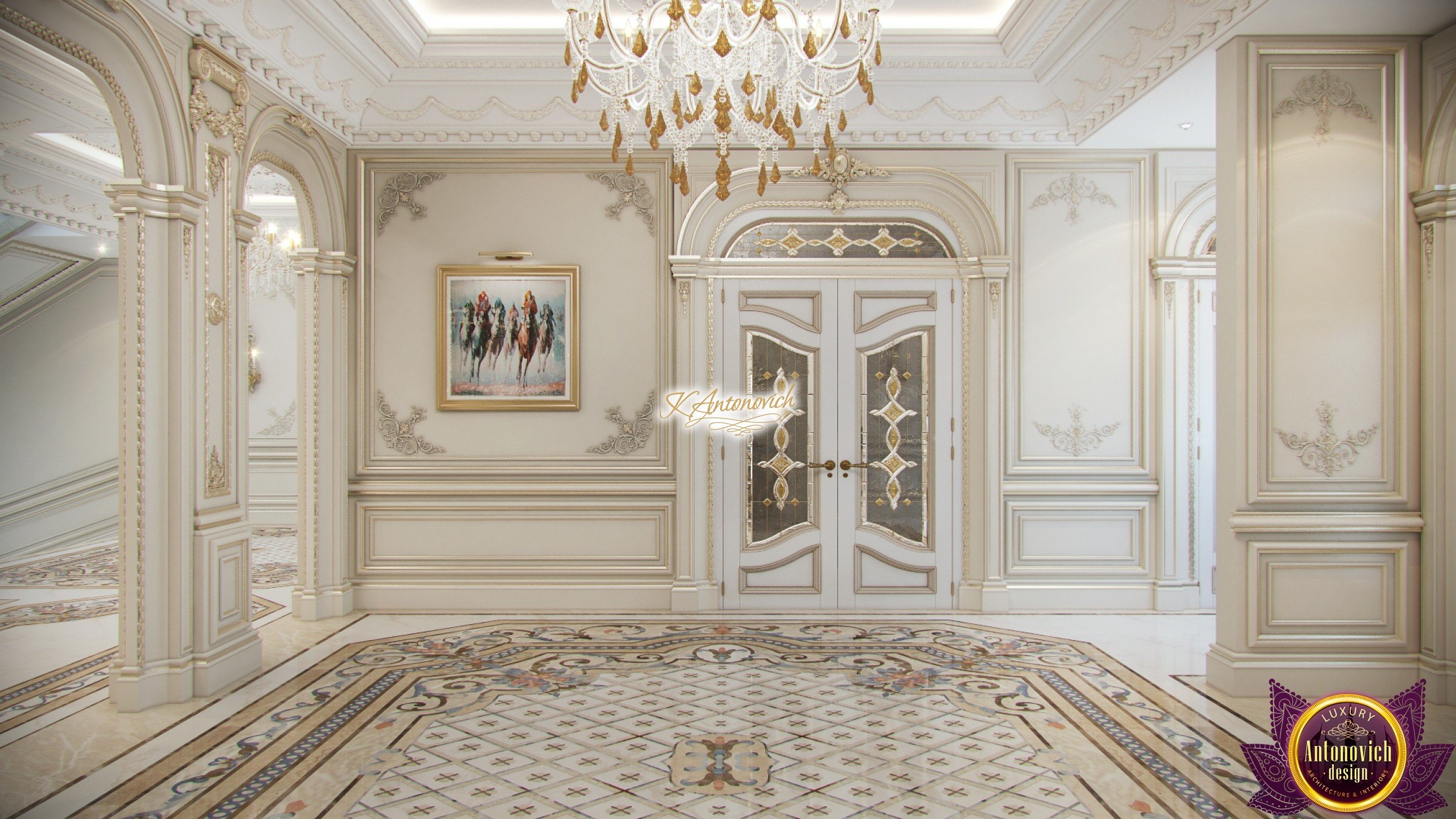 Luxury and beauty the interior of the house in classical style is reflected in the amazing in its beauty the details of the decor. Interior designers have created an extremely elegant and aristocratic interior of the modern family nest. It is the classic style of the interior becomes a way to establish family traditions and create a comfortable home in which will be enjoying the comfort and coziness more than one generation of the family. And this gentility and respectability begin with the spacious hall interior.Rich wall decor is worthy of the royal palace. Decor is based on an elite decorative plaster gray shade.Against this background, very bright and saturated looks elements of the stucco decoration, which is covered with gold leaf. One of the highlights, which is brought into the interior festive spirit of art deco, has become wall decor near console table. Console on carved gilded legs perfectly combined with the beautiful frame of the mirror in the form of the sun. A significant part of the wall decor, became paintings, with special lighting. This element clearly shows a good taste of house owners and their love of art.Marble floors have become one of the most picturesque parts of the interior. Classic ornaments made of marble of various shades resemble little beautiful Persian rug. The ceilings are decorated with quite deep niches. They are outlined by the wide moldings with large swirls of stucco decoration.This sculptural element seems to be more expressive due to the additional illumination.Interior of the house in the classical style gives pleasant aesthetic emotions.
