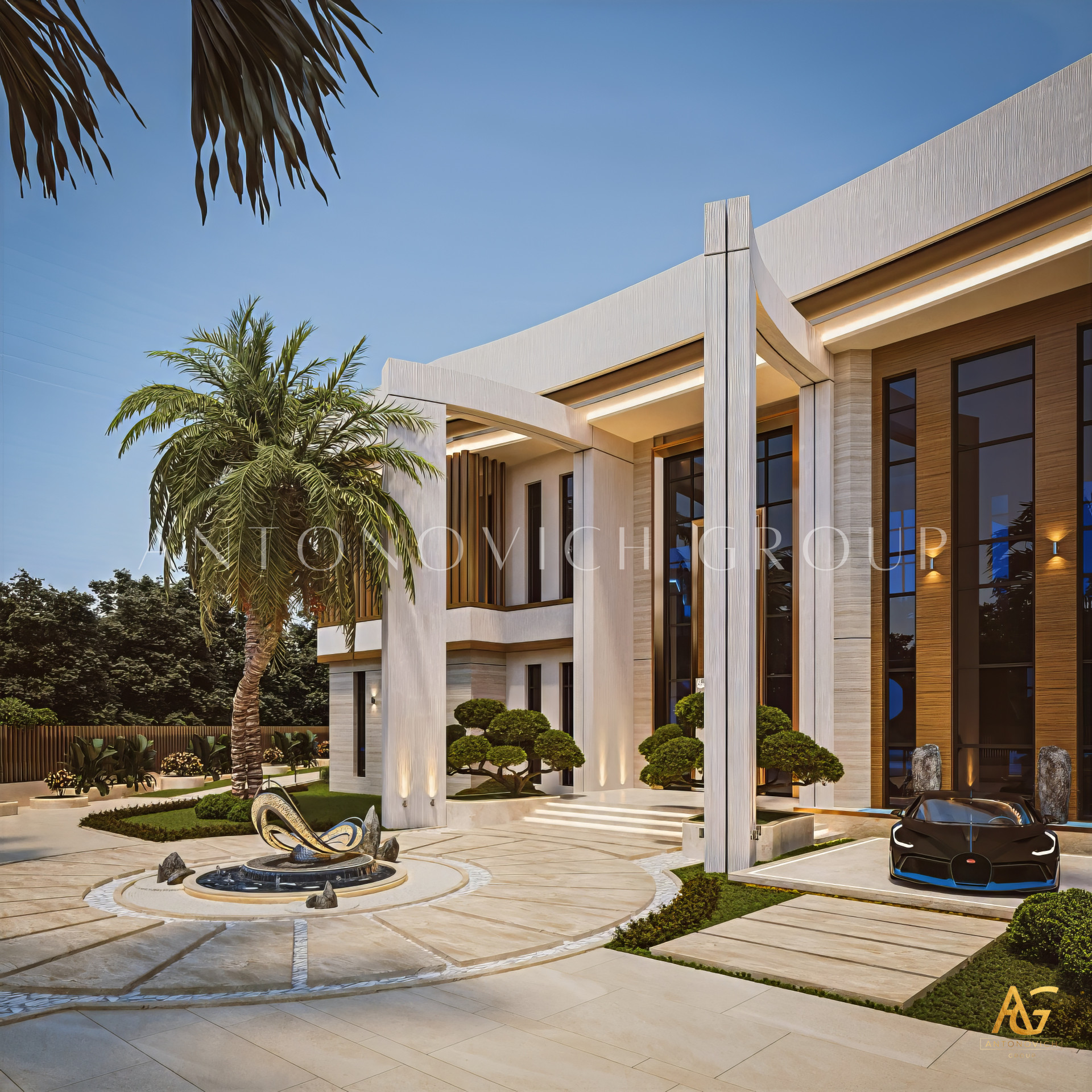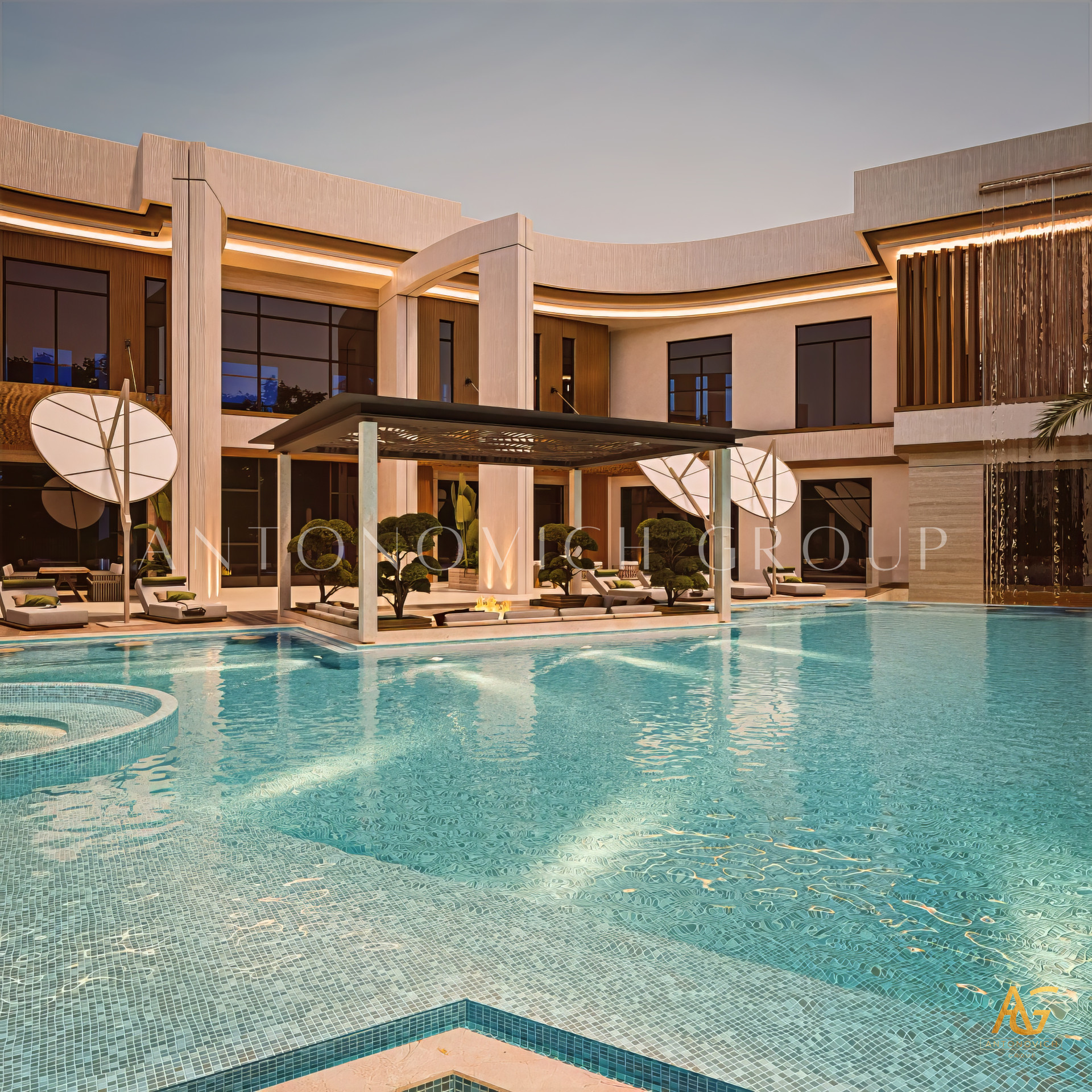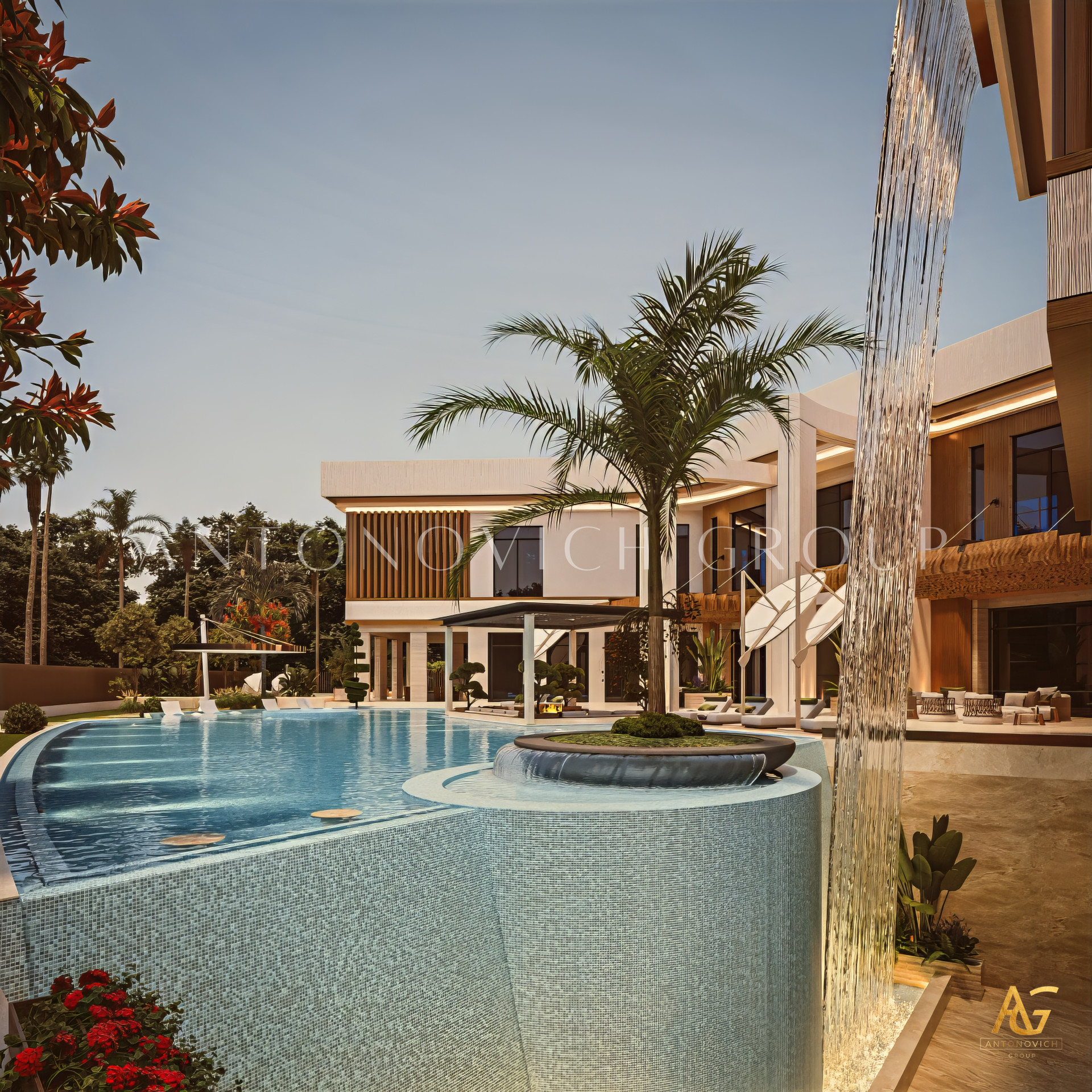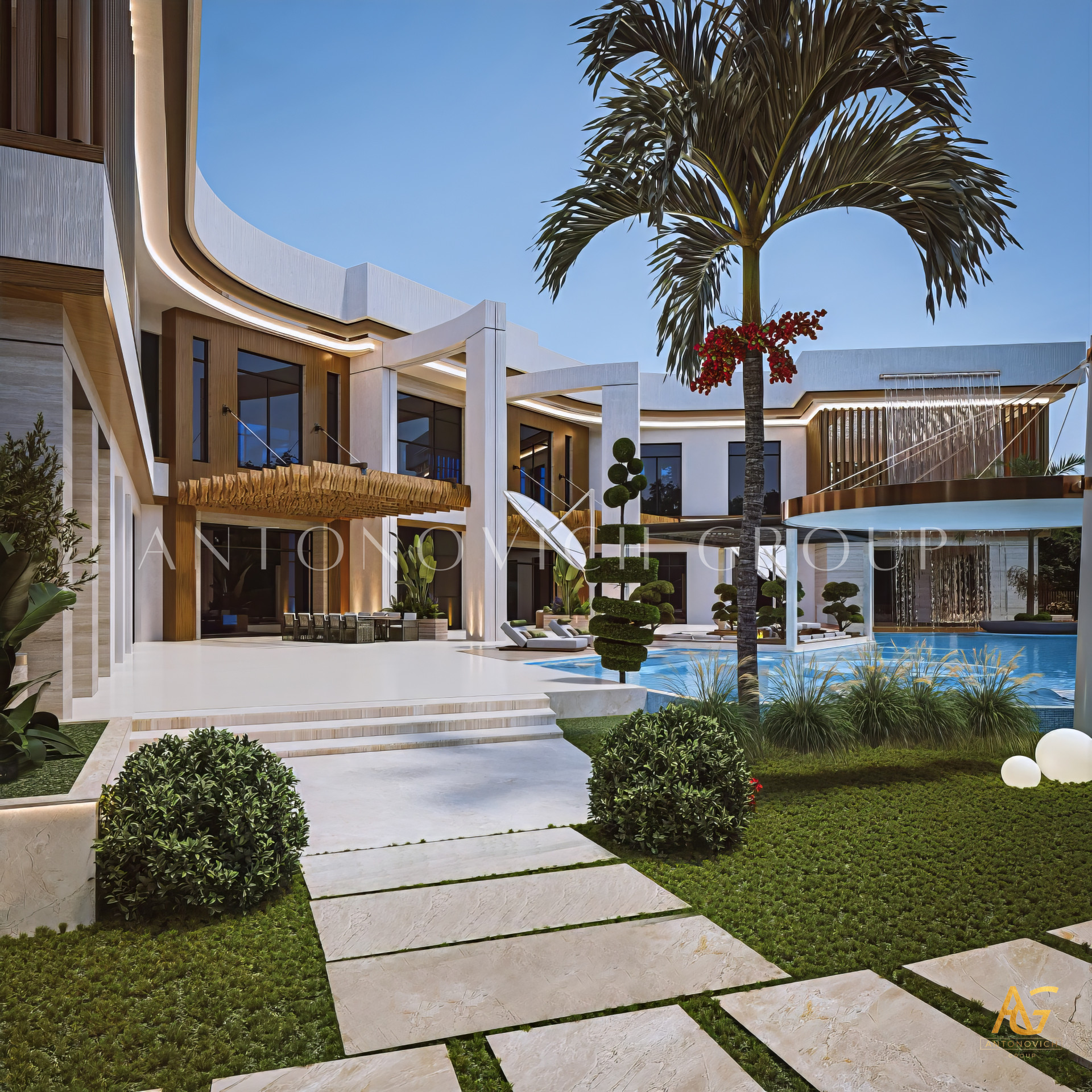 The luxury of this exterior design lies in the harmony of style. The house, the stone pavilion and other architectural structures are completed in neoclassical style. This style conquers hearts with an excellent combination of simplicity and elegance. Modern elements near swimming pool and summer pavilion attract attention and make the exterior design more cozy and warm.