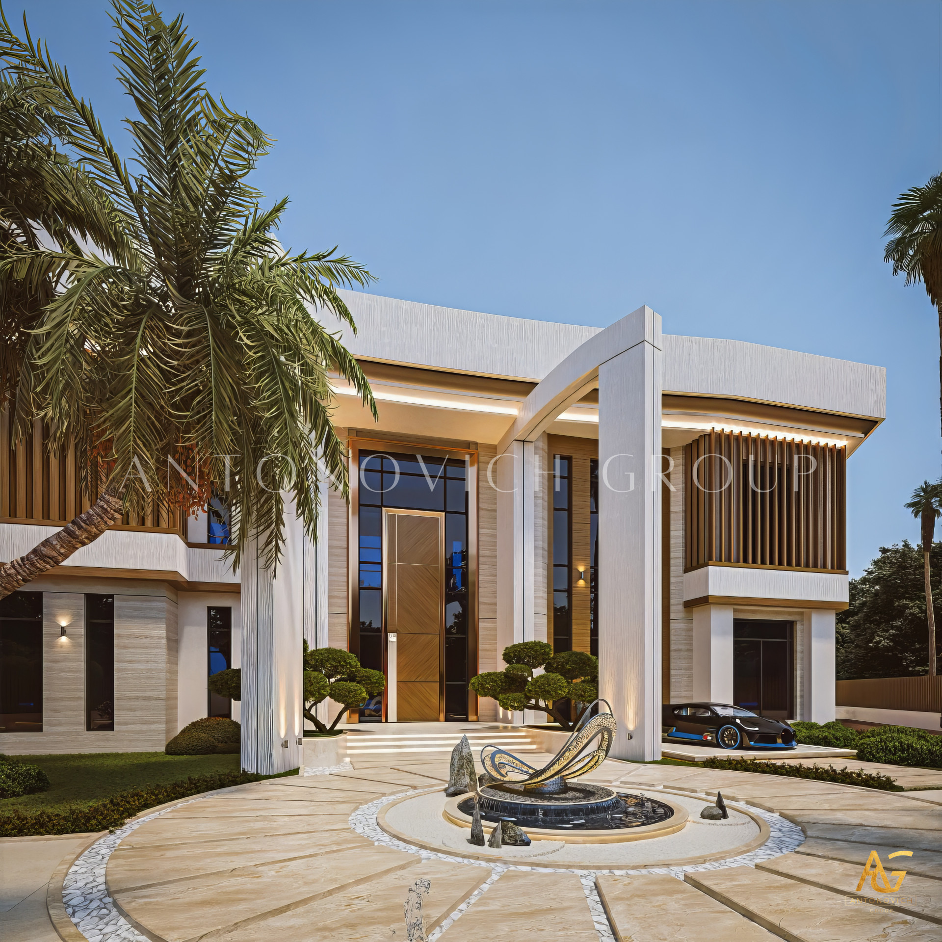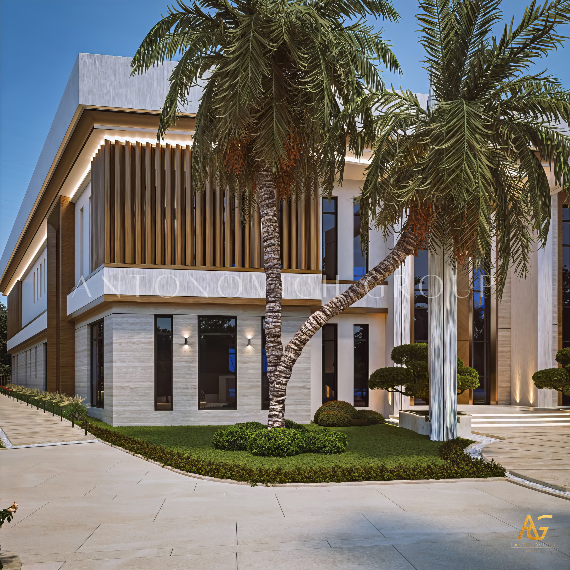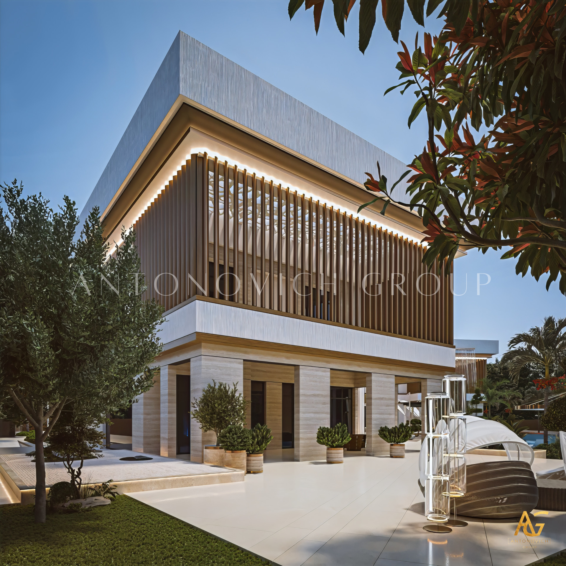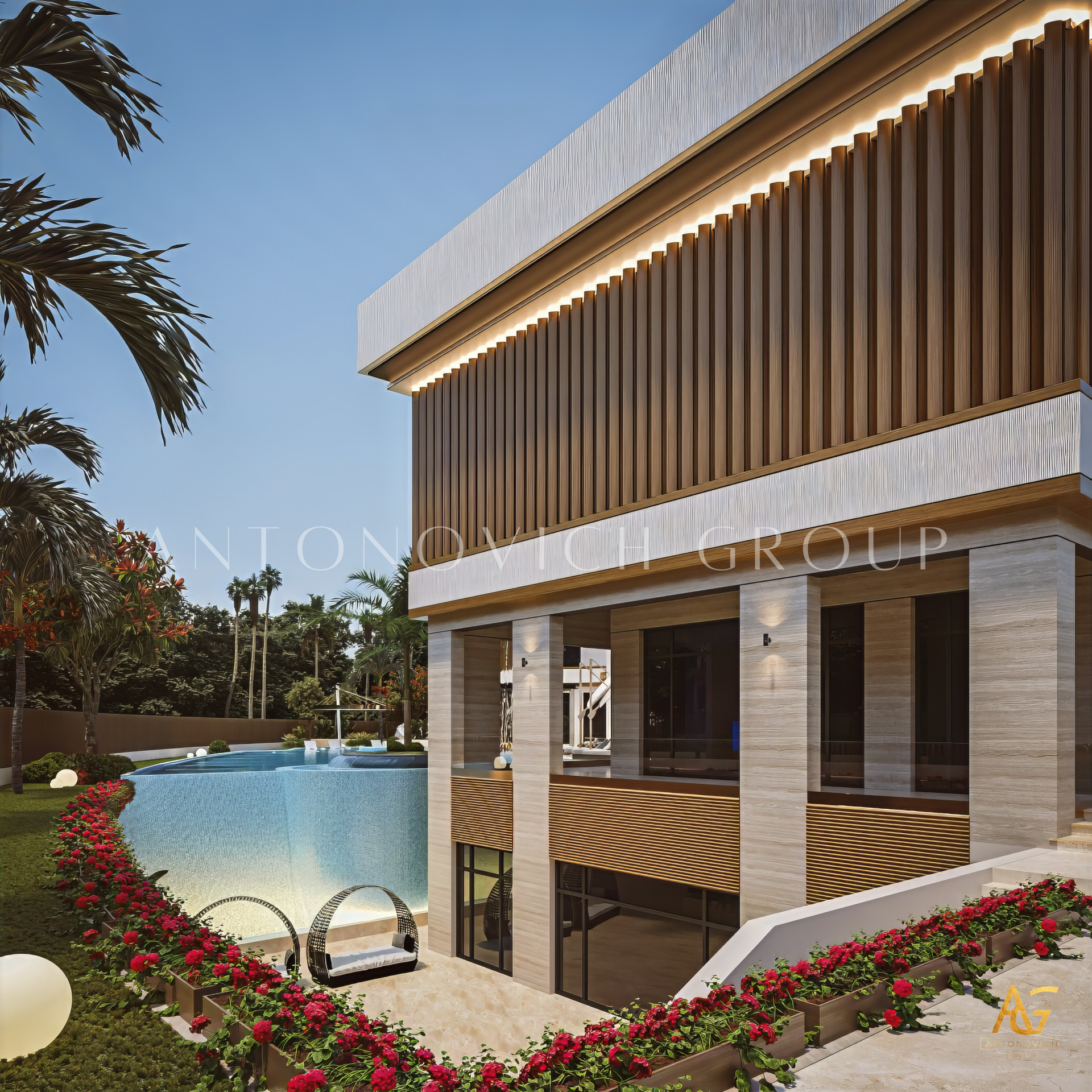The luxury of this exterior design lies in the harmony of style. The house, the stone pavilion and other architectural structures are completed in neoclassical style. This style conquers hearts with an excellent combination of simplicity and elegance. Modern elements near swimming pool and summer pavilion attract attention and make the exterior design more cozy and warm.