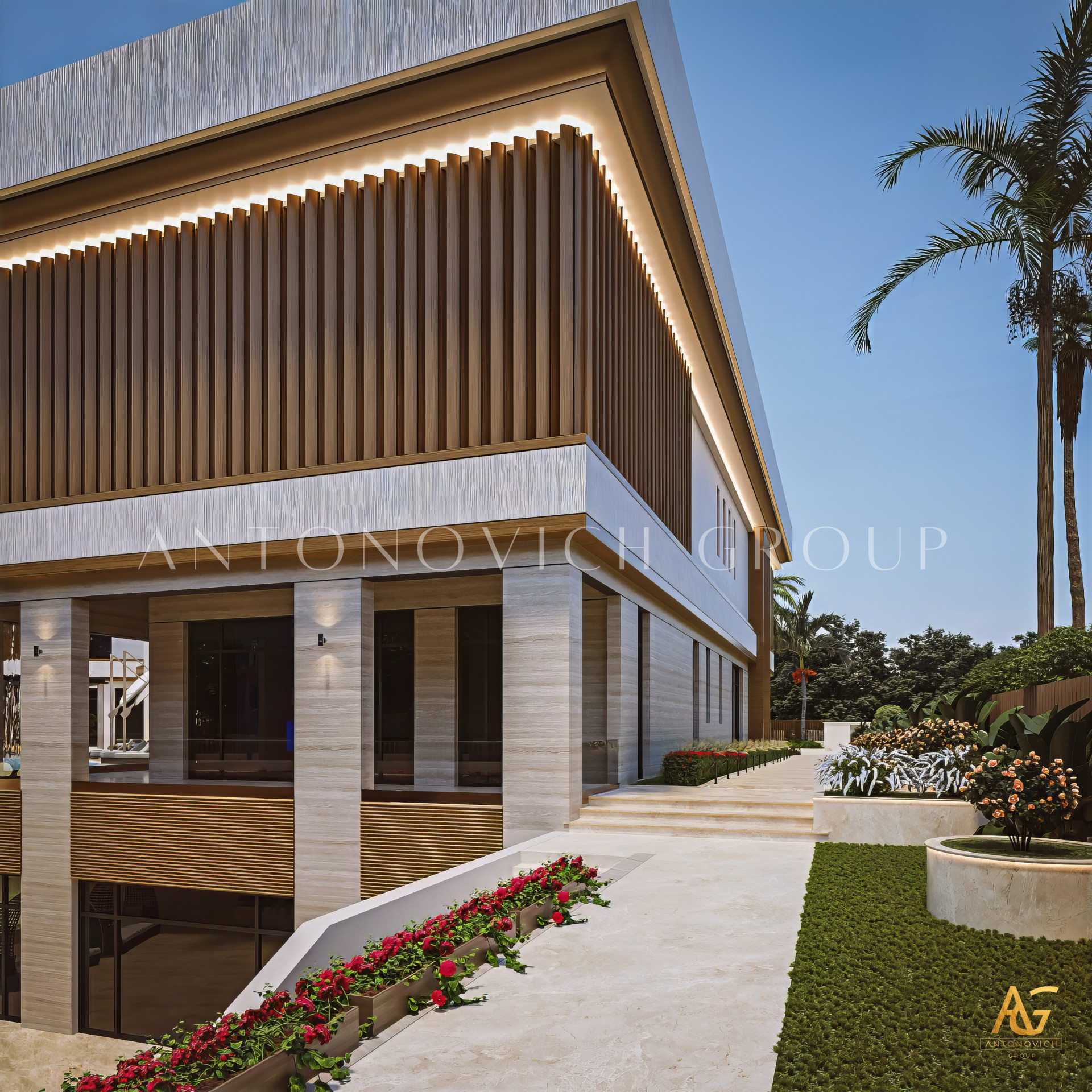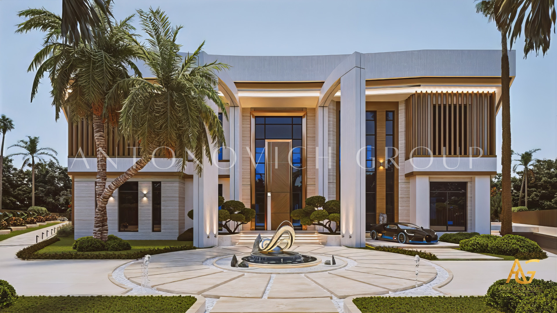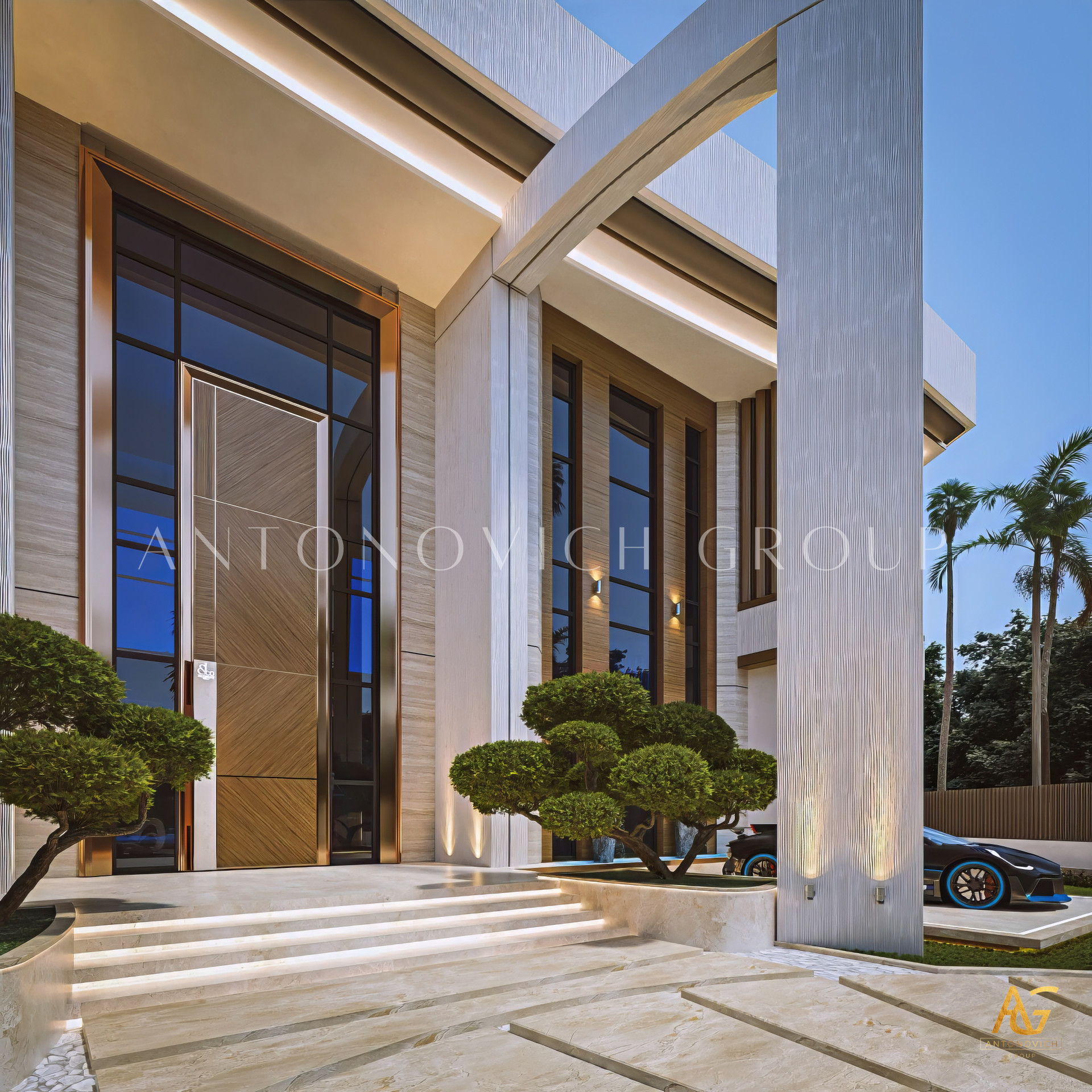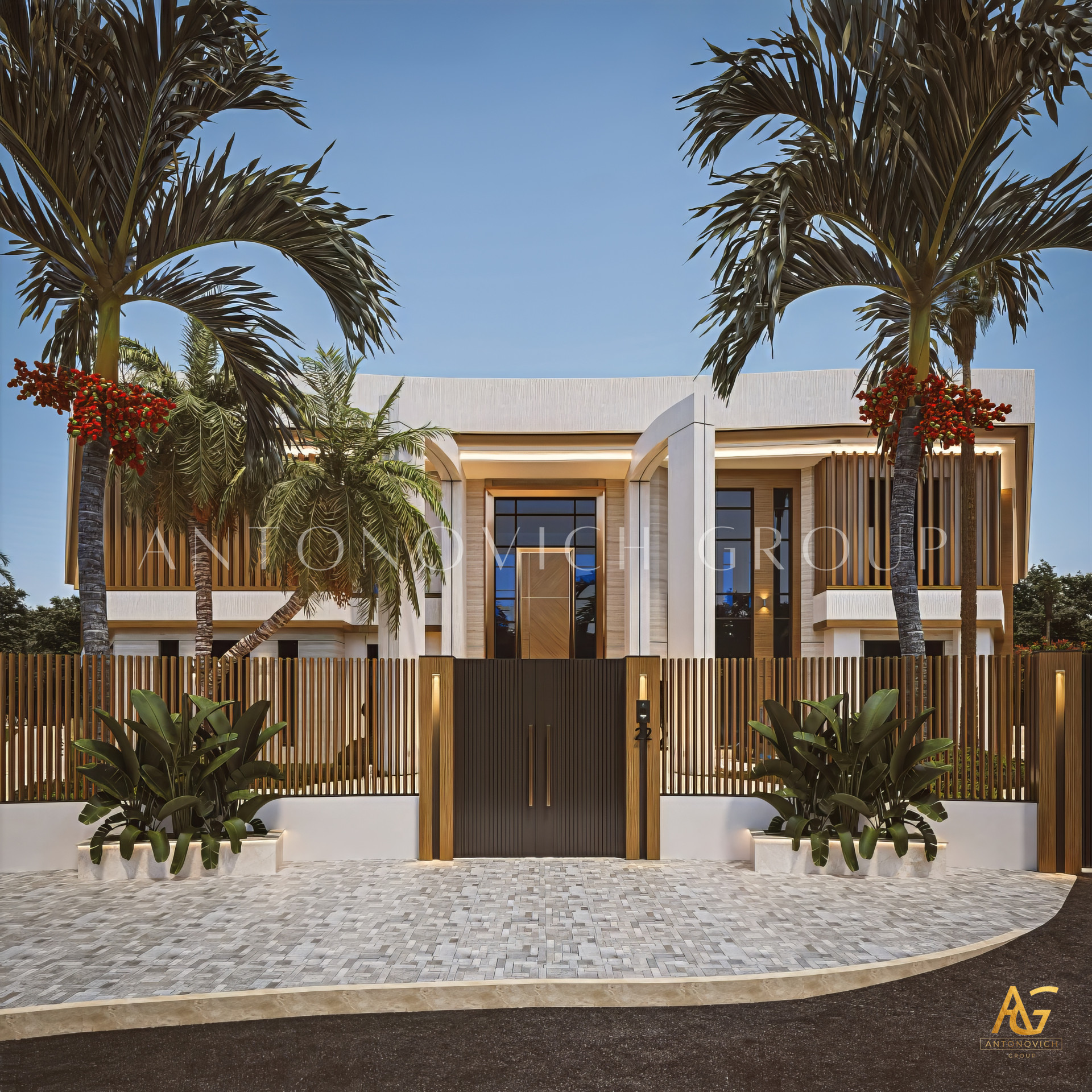 Roman elements are widely used in external design. Columns and door cornices adorn the house. The decoration of the fence includes pediments, columns, and reliefs of vases with flowers. Interesting details of the exterior design are the ornament on the ceiling of the parking place and classical vases that are used as pots.