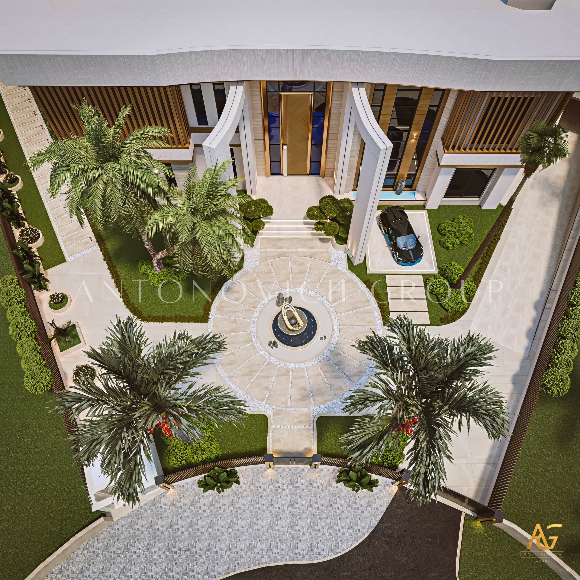 The main constructions of this exterior design are a house, a stone pavilion, a summer pavilion, a swimming pool, a parking lot and green areas. The stone pavilion is a wonderful and comfortable place to relax. Homeowners and guests can sit on the couch and admire the beauty of the hearth. The construction of the hearth is amazing. It is like an indoor flower with fire inside. Plants in stone pots and a stylish chandelier create an atmosphere of hospitality.
