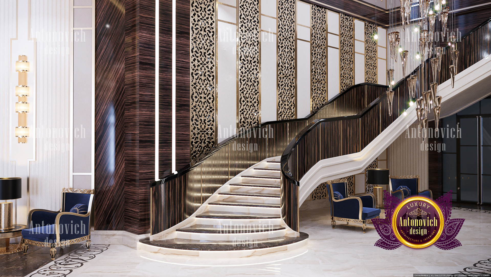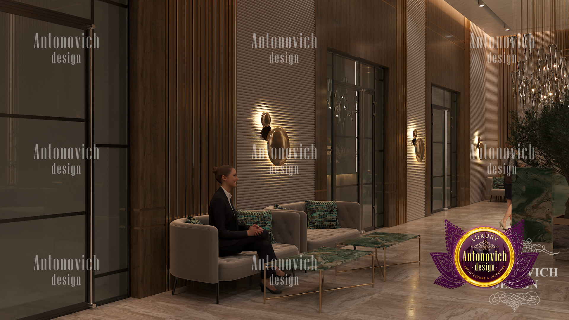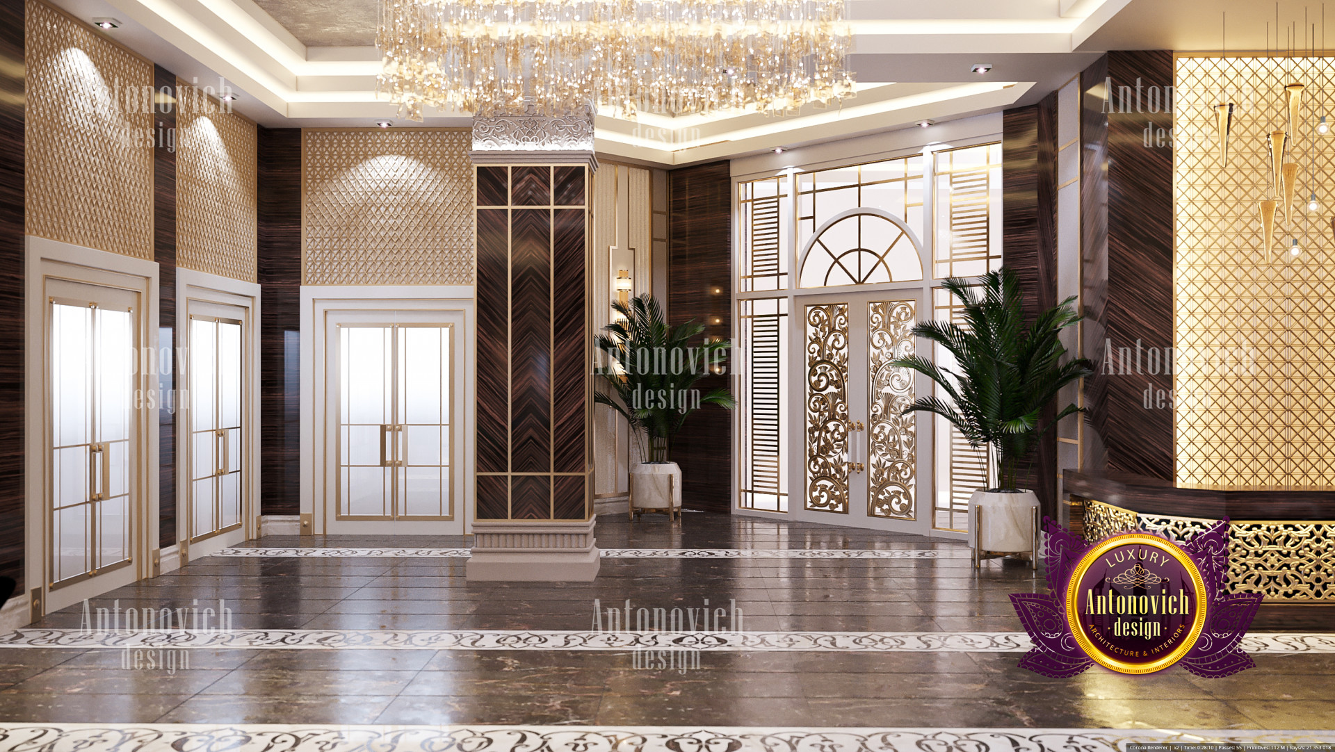 The features and arrangement of Luxury Antonovich Designs Hotel lobby design Dubai are modern luxuries. The big space is decorated in a luxurious manner. The patterns are perfect for a modern high-end interior design. It also has high-end functions that you may utilize on a regular basis. The Hotel interior design in Dubais arrangement is also rather big and appealing, as one would expect from a high-end modern interior design.
