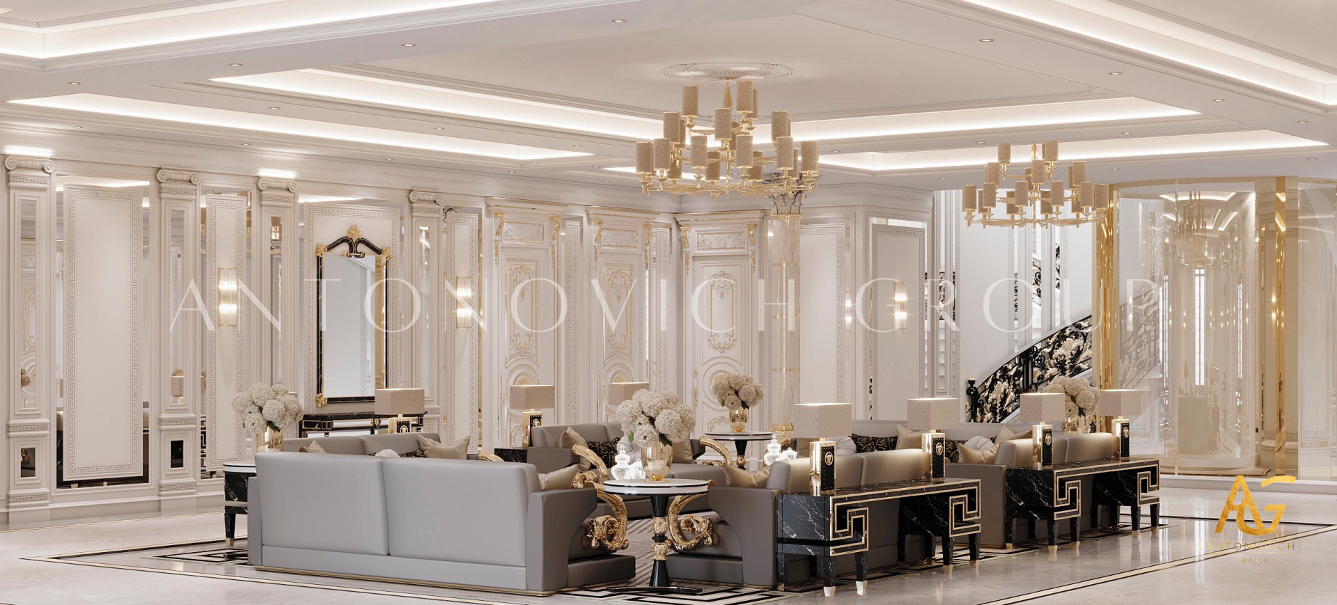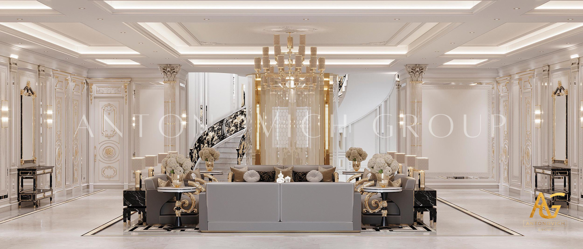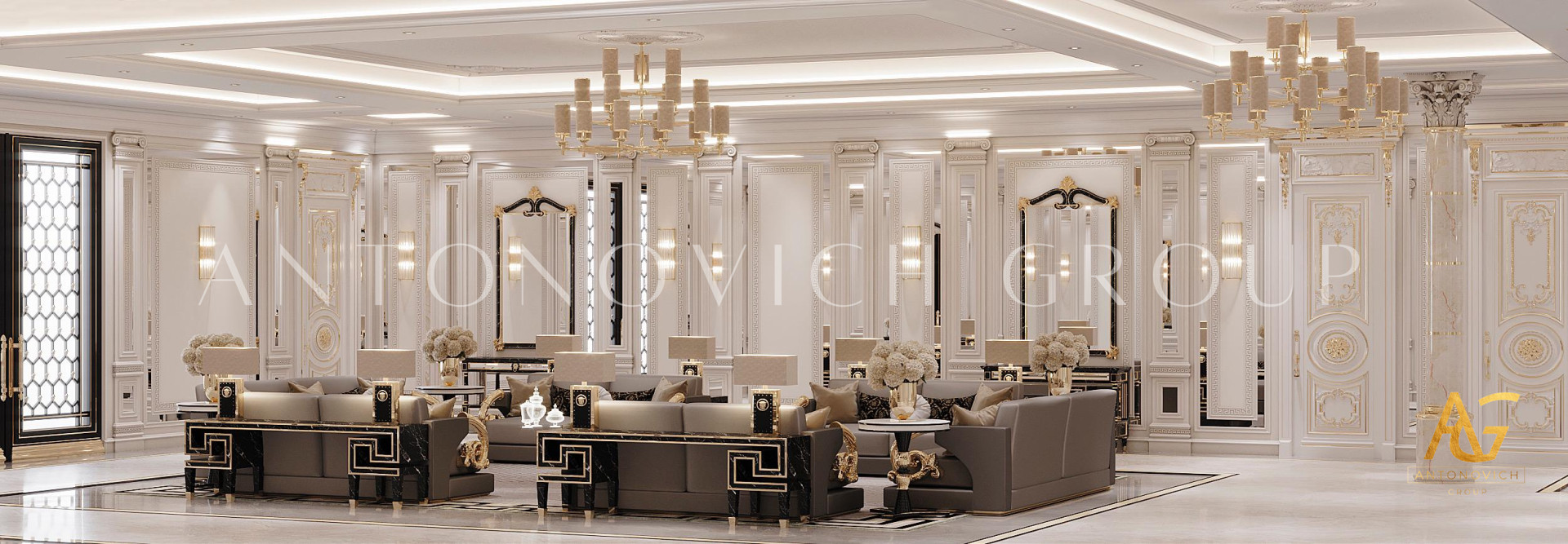 Comfortably, cozy and thus elegantly and festively this interior of a small living room in style of modern classic looks. Designers of the studio Luxury Antonovich Design elegantly improvise with motives of neoclassic and Art Deco accents. As a result, interesting and memorable interiors are always with a cozy and artistically expressive image. In this design project for the living room, there are several bright moments that shape the overall mood of the space. First of all, this is the ceiling decor. With the help of clear outlines of a deep niche on the ceiling, gilded lines and lighting, the room becomes visually more spacious, and the ceiling is higher. With the help of a laconic crystal chandelier, designers define the center of space. The decor of the walls became an even more bright moment in the living room interior design. The accent wall, where the large plasma panel is placed, is decorated with special decorative plaster with sparkles. The authors of the project created vertical patterns and curves of a line of polished brass fill the room with a deeper shine of modern luxury. Against the background of such a bright and extravagant decor of the walls and ceiling, the furniture looks laconic and elegant. The highlight of the furniture decor is an upholstery of dense silk cream-bronze shade and accented pillows with very bright ornaments. Complemented the festive mood of the living room with cozy warmth in the decor of the floors used a parquet board made of light natural wood and a soft carpet look great.