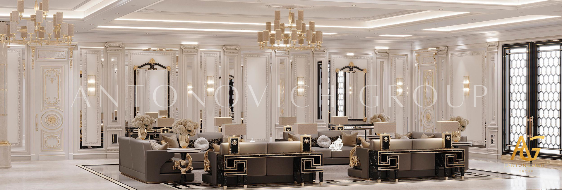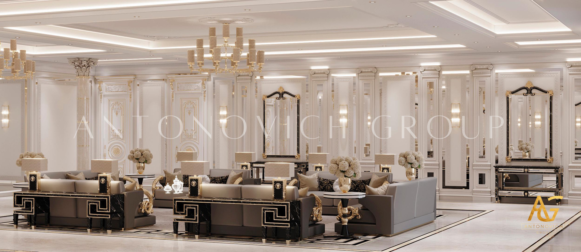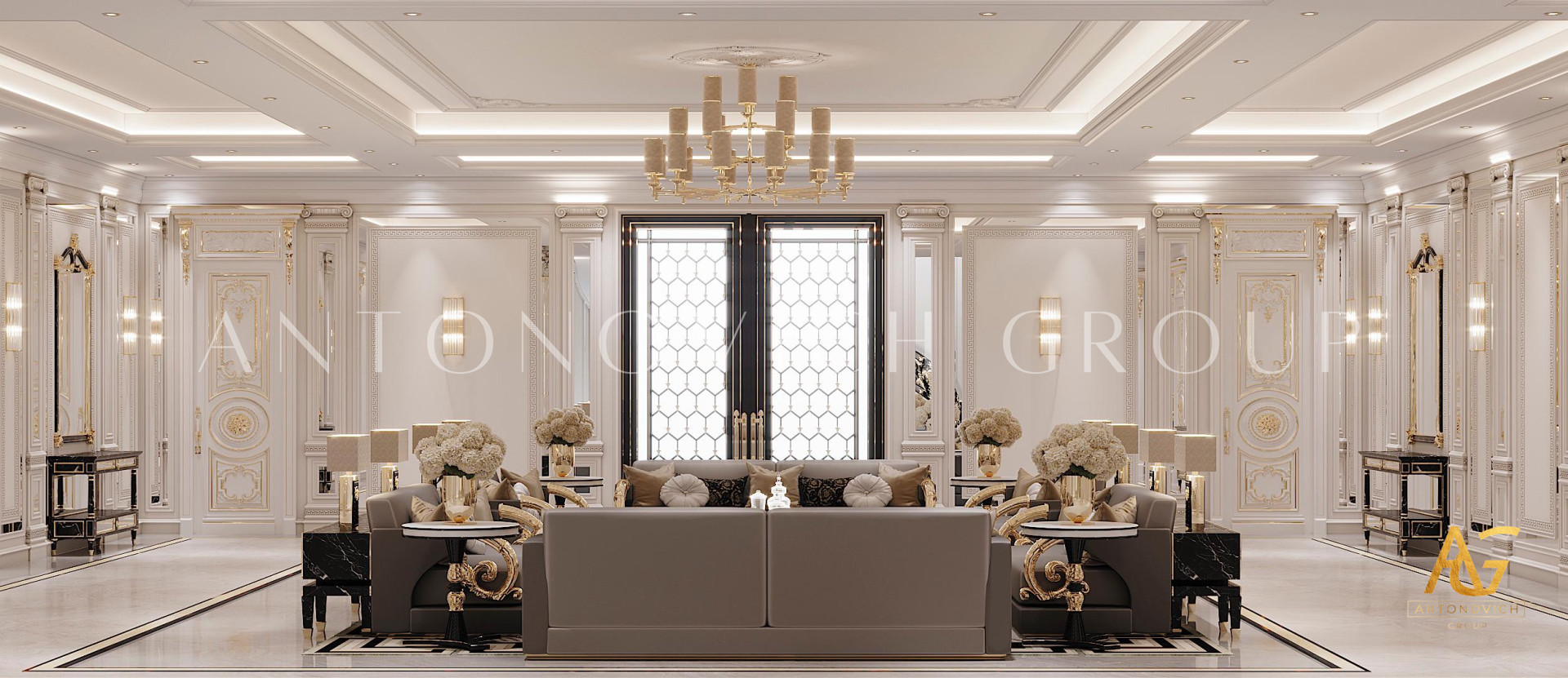 Comfortably, cozy and thus elegantly and festively this interior of a small living room in style of modern classic looks. Designers of the studio Luxury Antonovich Design elegantly improvise with motives of neoclassic and Art Deco accents. As a result, interesting and memorable interiors are always with a cozy and artistically expressive image. In this design project for the living room, there are several bright moments that shape the overall mood of the space. First of all, this is the ceiling decor. With the help of clear outlines of a deep niche on the ceiling, gilded lines and lighting, the room becomes visually more spacious, and the ceiling is higher. With the help of a laconic crystal chandelier, designers define the center of space. The decor of the walls became an even more bright moment in the living room interior design. The accent wall, where the large plasma panel is placed, is decorated with special decorative plaster with sparkles. The authors of the project created vertical patterns and curves of a line of polished brass fill the room with a deeper shine of modern luxury. Against the background of such a bright and extravagant decor of the walls and ceiling, the furniture looks laconic and elegant. The highlight of the furniture decor is an upholstery of dense silk cream-bronze shade and accented pillows with very bright ornaments. Complemented the festive mood of the living room with cozy warmth in the decor of the floors used a parquet board made of light natural wood and a soft carpet look great.