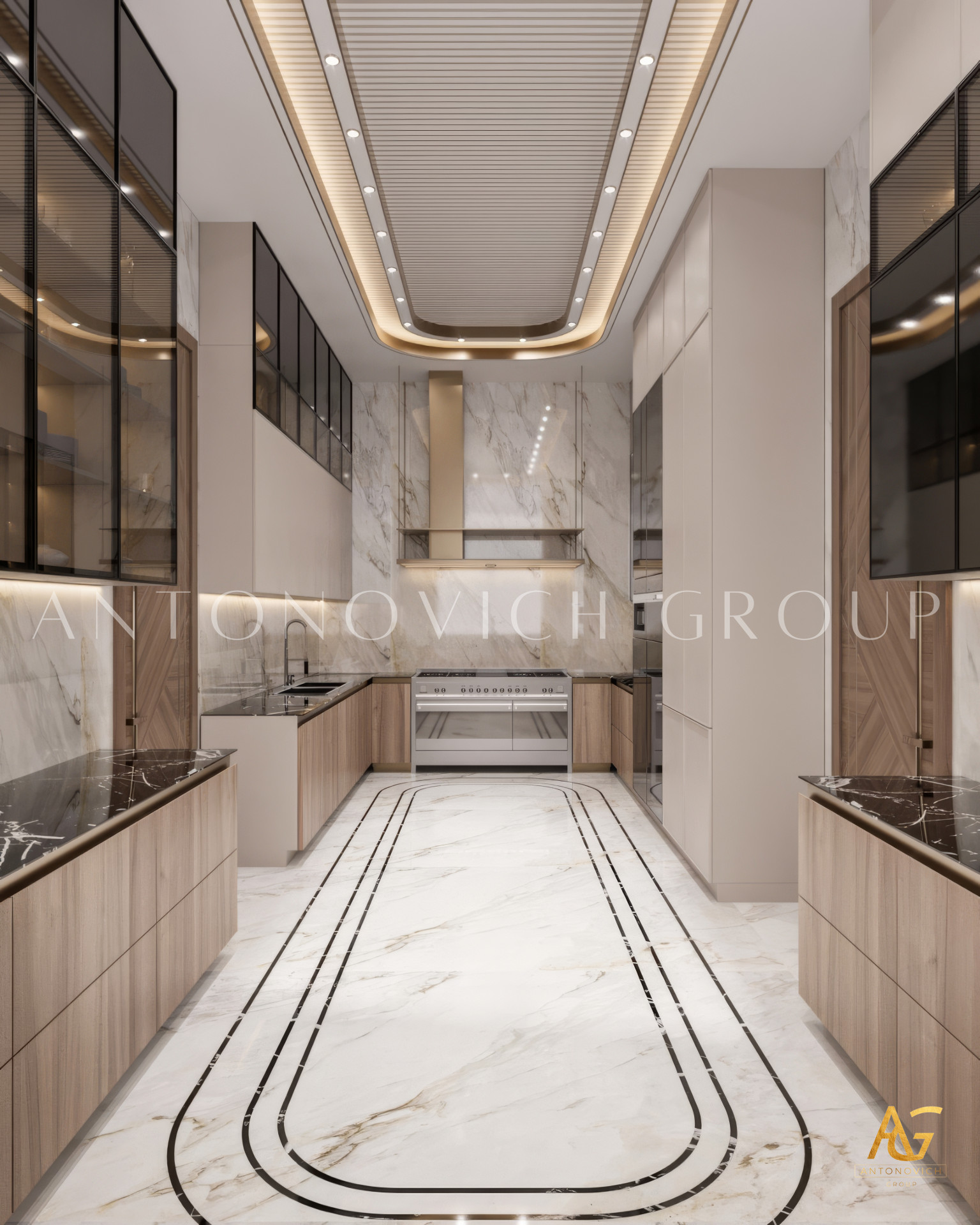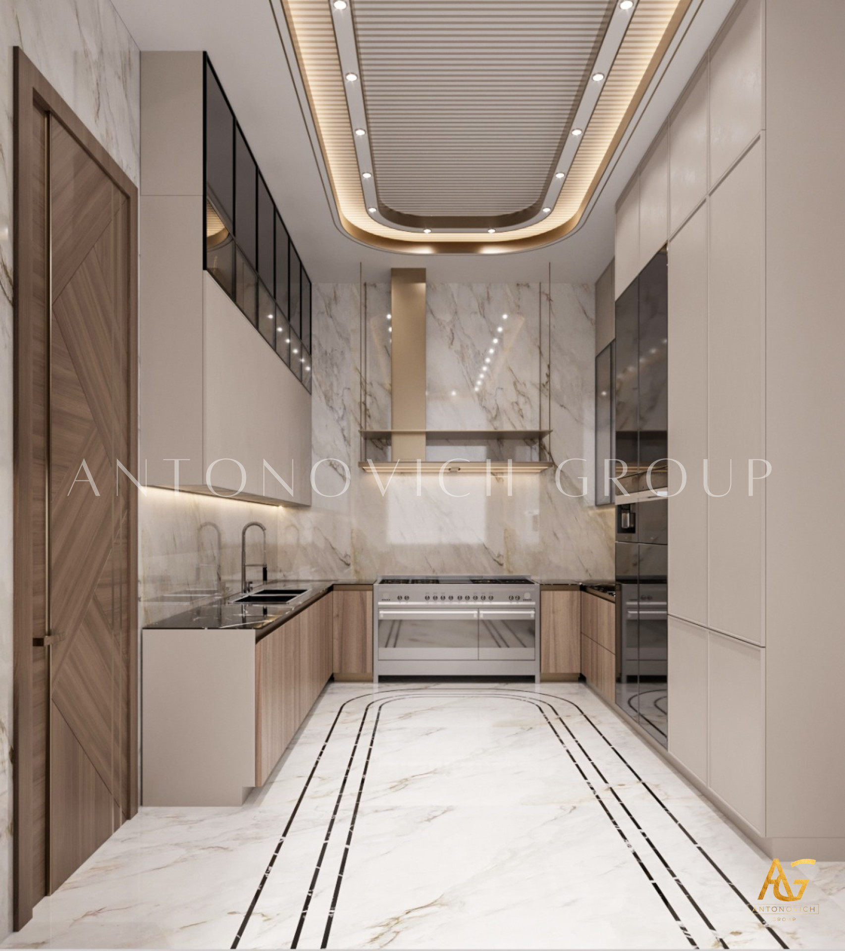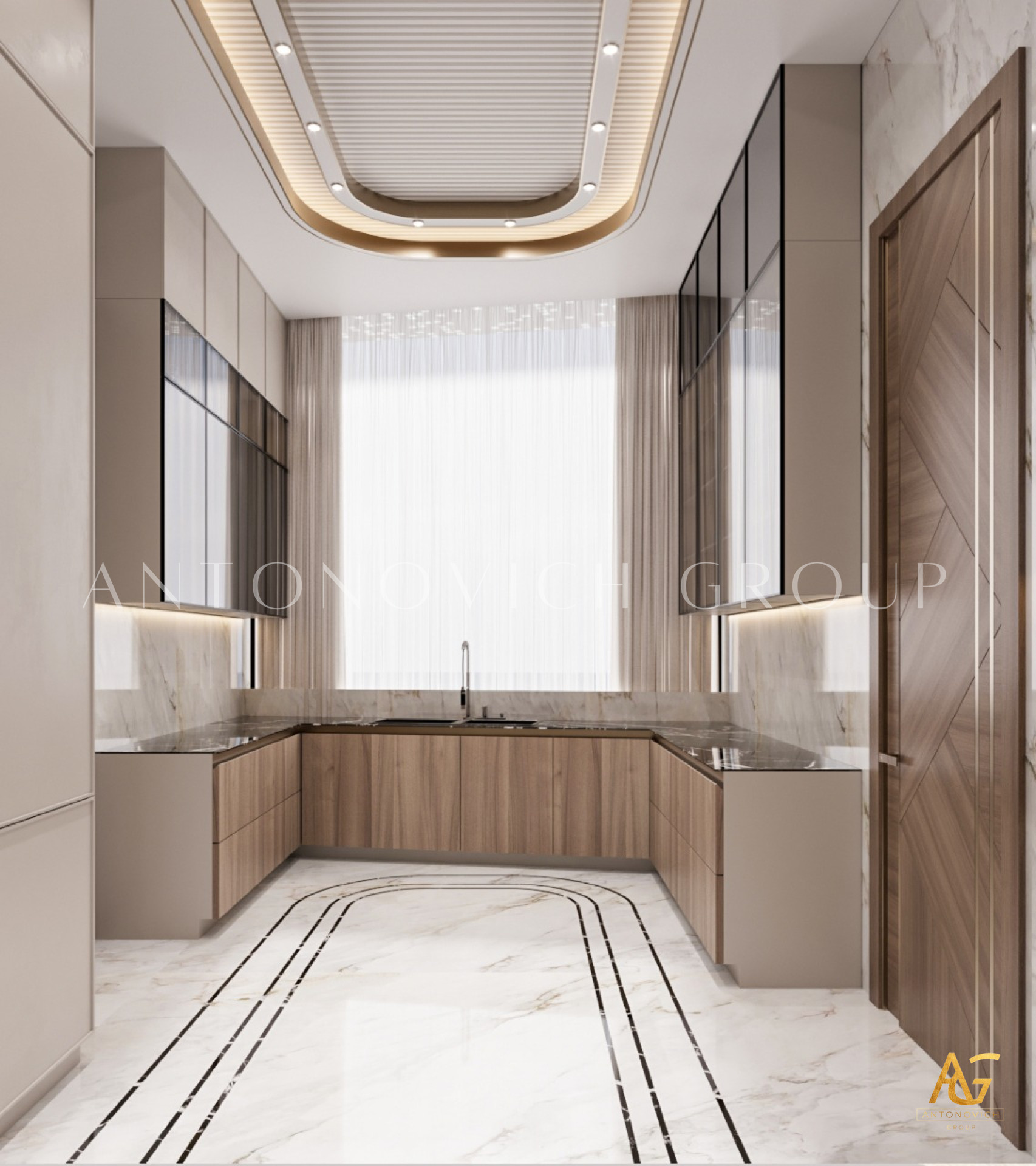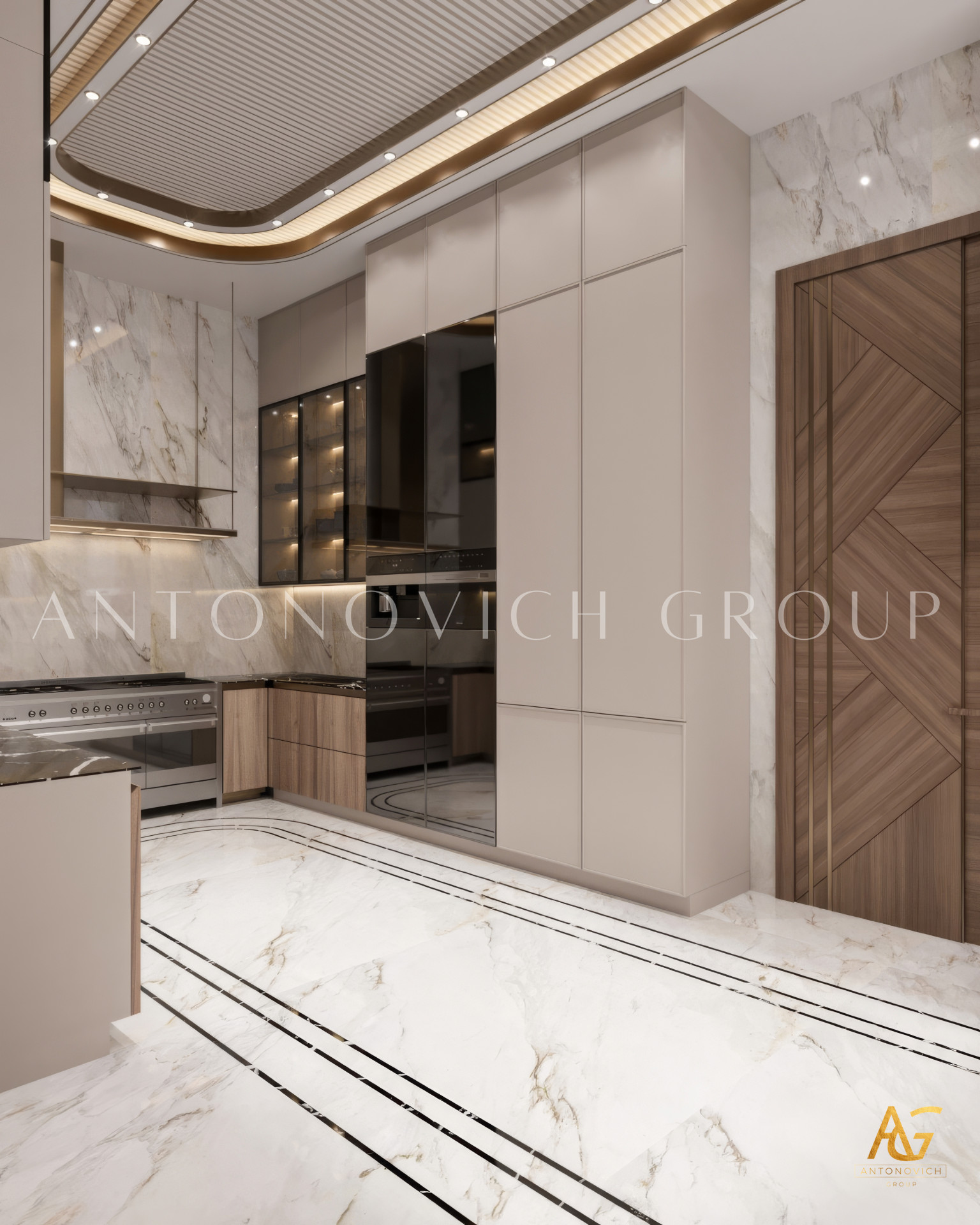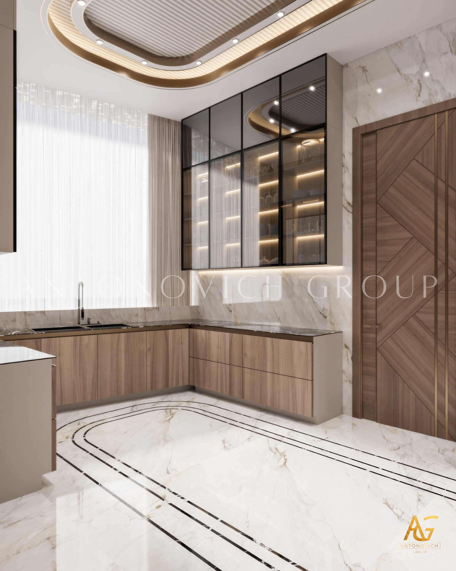 It is always very interesting to work with large areas of space, especially if it concerns such a direction as kitchen design. Since, as a rule, for this part of the interior of a house or apartment is not allocated the largest area. But in this project, all is conceived quite the opposite. For the country mansions kitchen interior was allocated a large space with high ceilings. The designers use much creativity and improvisation when working with a large area. In this version, the studio Luxury Antonovich Designs designers improvised with the motives of the classic style. The high ceiling as one of the big pluses of the interior was decorated with interesting decor in the form of a niche in the form of a flower with graceful curls of stucco decoration, which are neatly covered with gilding. In the center, this visual flower is adorned with a massive crystal chandelier with magnificent pendants. But to make the interior even more bright and elegant, the project authors use additional ceiling lights and soft LED lighting throughout the perimeter of the ceiling. The wide stucco molding with magnificent decor outlines luxurious ceiling. Kitchen furniture has become part of the decor of the walls, literally merging with this luxurious space. Designers use one pleasant shade of muted creamy. A light palette of the interior contributes to visually increase of luxury kitchen. Also, soft backlighting decorated the cabinets with utensils. Soft furniture and a table-top made of blue marble are the bright accents of the interior.
