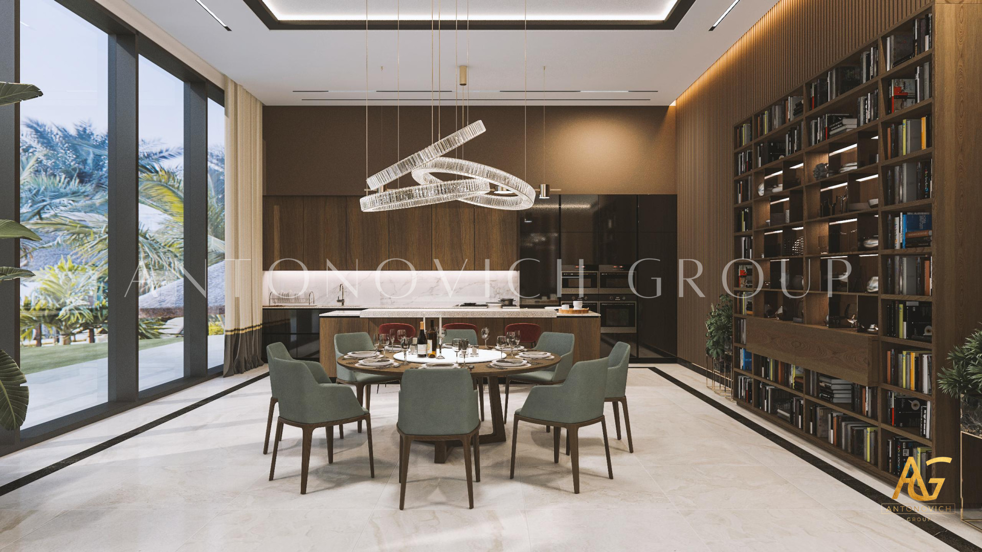 The living room interior was created by the best designers. Here, every detail has its own philosophical meaning. Here, each design solution emphasizes the overall design concept. And the interior design itself was the perfect continuation of the architectural layout of the elite apartment. The living room is conditionally divided into several zones. Most of the interior is occupied by a luxurious dining zone for 12 people. This moment became fundamental in reflecting the hospitable and open nature of the owner of the house. A beautiful dining room emphasizes the fact that guests are always welcomed here and only the best hospitality offered. Of course, the main violin of the orchestra of luxury in the neoclassic style is played by beautiful furniture from Italy. In the dining room, the interior is decorated with luxurious cabinets of precious wood with inlay. Soft chairs with are upholstered with noble velvet in a restrained pastel color scale. A large window was decorated with curtains made of silk velvet in a muted lilac shade, complemented by a wave of beige silk for contrast. A bright accent of the beautiful living room interior is a large crystal chandelier an original shape. Two beautiful armchairs and a small coffee table look very picturesque against the background of the wall. English parquet on the floor emphasizes the aristocratic look of the interior. The living room area was decorated with exquisite soft sofas in contrasting upholstery made of beige and emerald velvet. The interior is filled with the mood of the warmth of home comfort, a sense of calm and