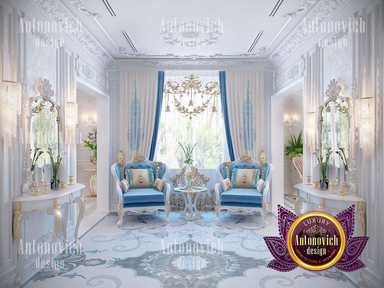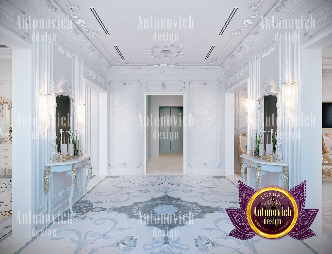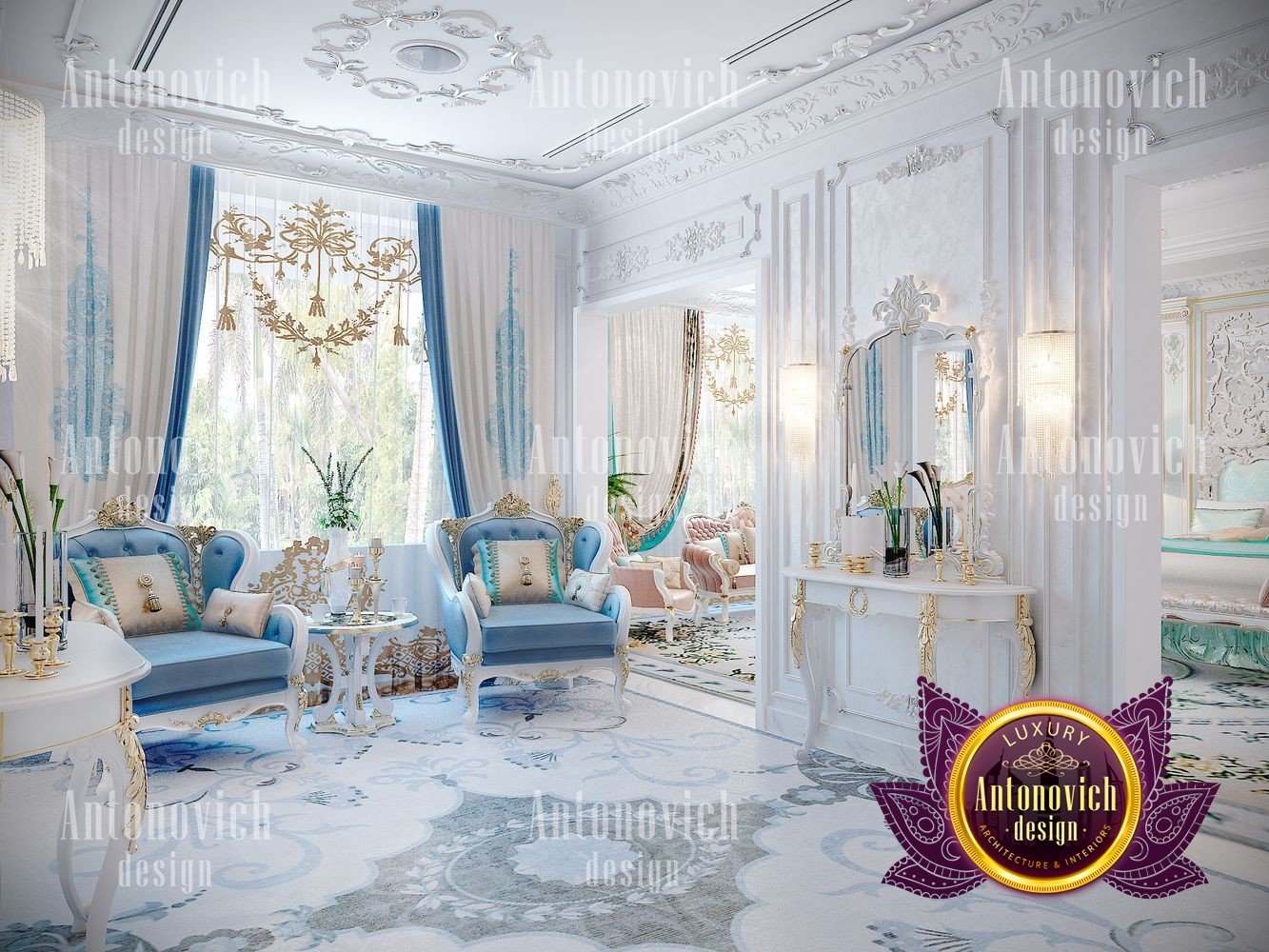 Luxury classic style in the interior attracts by the use of most daring designers improvisations. You can play with a palette of shades, materials, a geometry of shapes and lines. The main thing is to create exactly the ideal space that will reflect the character of the owner of the house. This is the only way to achieve perfect harmony. After all, no matter how the designers designed the interior the design studio Antonovich Design is always dedicated to the client, his dreams and hopes to get something unique and exceptional. Looking at this beautiful spacious bedroom you can give definitions for the character of its owner. This is a man with an easy character, an open mind and the ability to see the important small things. It would seem that a discreet range of cool colors in this interior of a beautiful bedroom plays absolutely unexpectedly bright and attractive. Soft velvet of a muted gray shade became the basis of textile design in the interior. The large headboard of the bed and its footboard are upholstered with a soft velvet panel with shallow shrinkage in a geometric ornament. This softness of silvery color continued in the decoration of the large window. Direct folds of the curtains perfectly combined with the white tulle. Even without that, the spacious room has an interesting effect of the infinity of luxurious space. This effect interior designers Dubai achieve with the help of mirrors in the decor, as well as multifaceted ceiling decor. The decorative mirror panel on the wall behind the headboard reflects the beautiful interior dividing it into many beautiful moments.