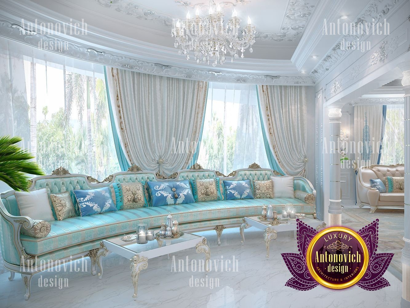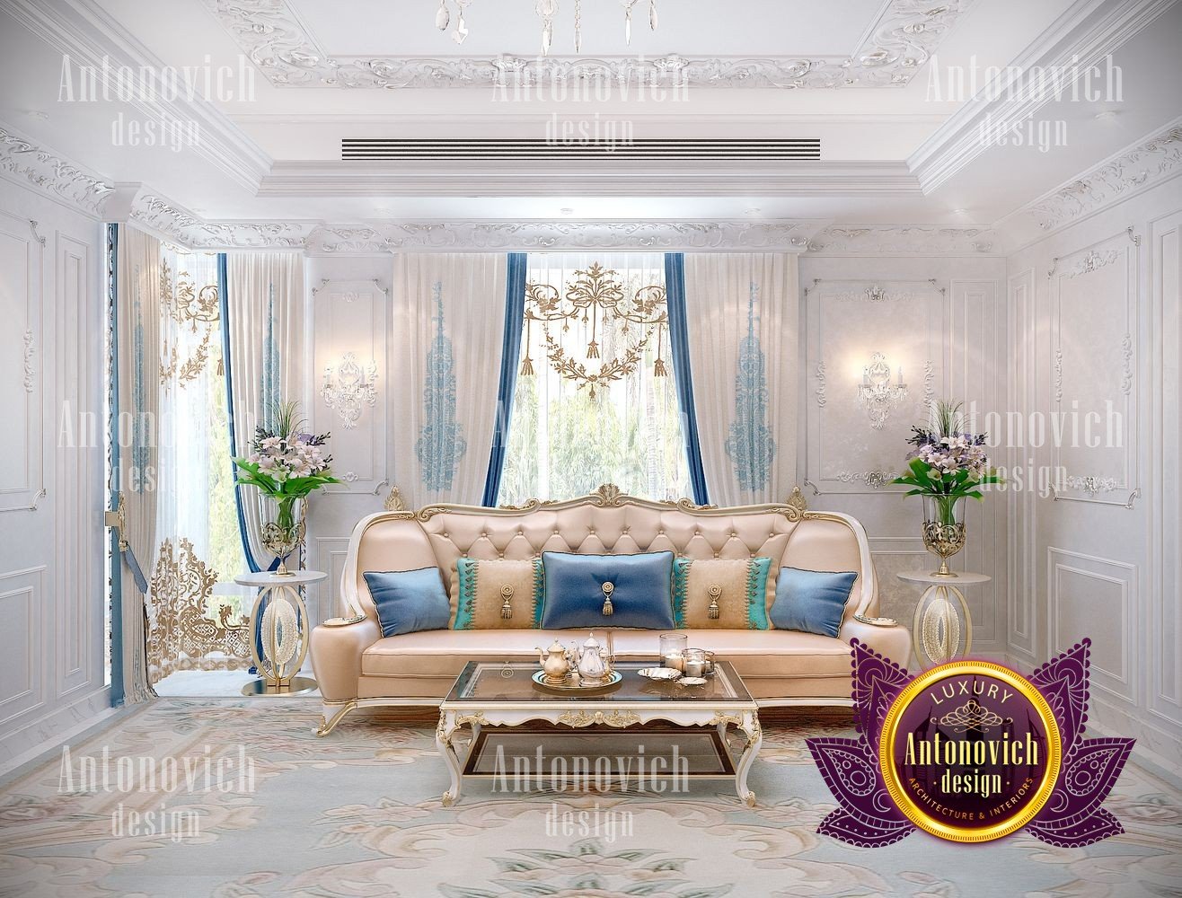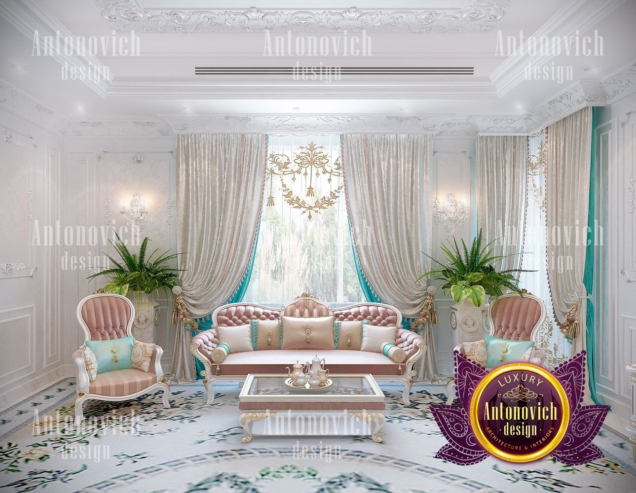 Luxury classic style in the interior attracts by the use of most daring designers improvisations. You can play with a palette of shades, materials, a geometry of shapes and lines. The main thing is to create exactly the ideal space that will reflect the character of the owner of the house. This is the only way to achieve perfect harmony. After all, no matter how the designers designed the interior the design studio Antonovich Design is always dedicated to the client, his dreams and hopes to get something unique and exceptional. Looking at this beautiful spacious bedroom you can give definitions for the character of its owner. This is a man with an easy character, an open mind and the ability to see the important small things. It would seem that a discreet range of cool colors in this interior of a beautiful bedroom plays absolutely unexpectedly bright and attractive. Soft velvet of a muted gray shade became the basis of textile design in the interior. The large headboard of the bed and its footboard are upholstered with a soft velvet panel with shallow shrinkage in a geometric ornament. This softness of silvery color continued in the decoration of the large window. Direct folds of the curtains perfectly combined with the white tulle. Even without that, the spacious room has an interesting effect of the infinity of luxurious space. This effect interior designers Dubai achieve with the help of mirrors in the decor, as well as multifaceted ceiling decor. The decorative mirror panel on the wall behind the headboard reflects the beautiful interior dividing it into many beautiful moments.