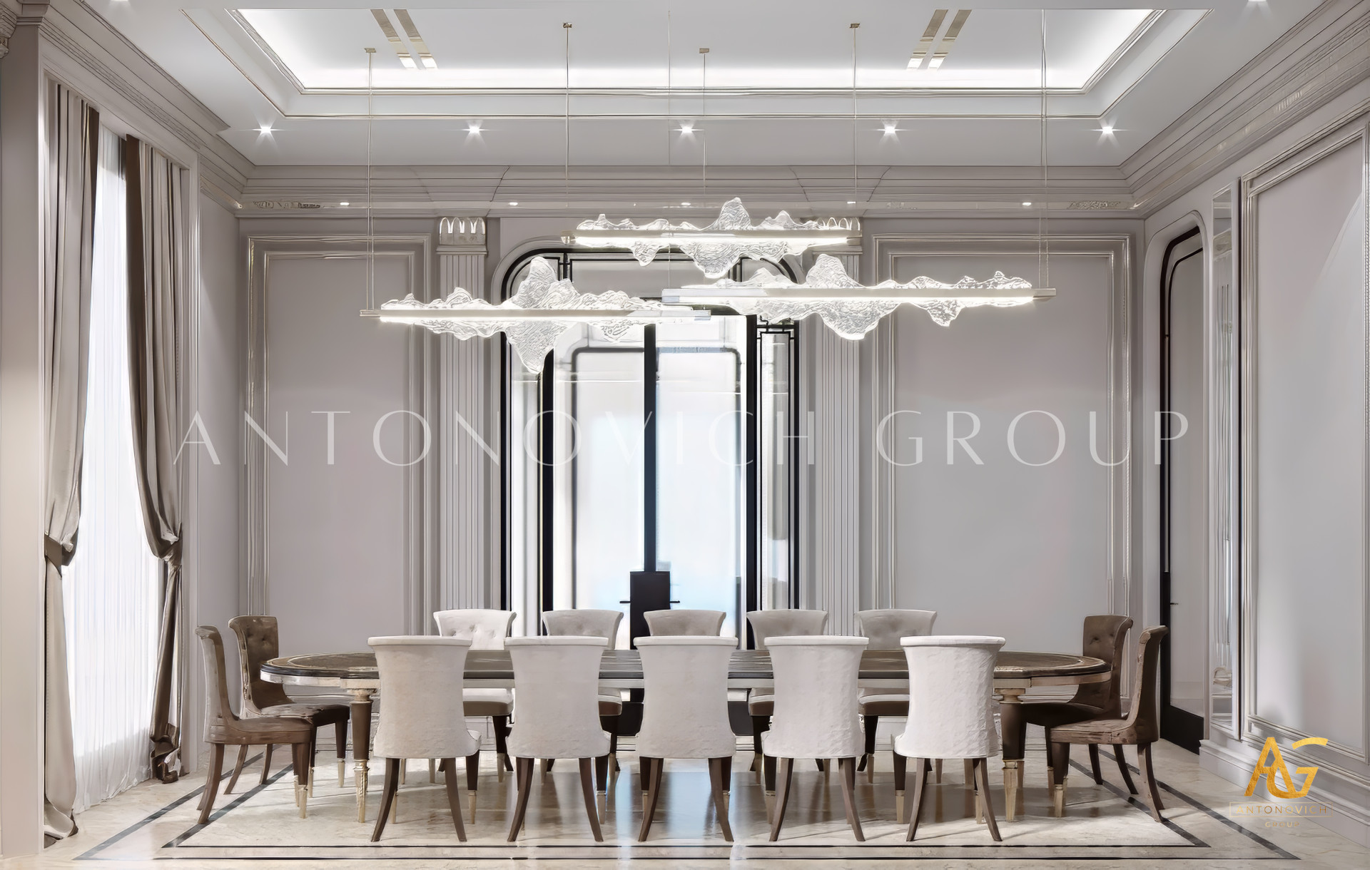 Antonovich Group’s approach to spacious dining room interior design and fit-out elevates everyday living into a luxurious experience. By combining bespoke furniture, architectural precision, advanced lighting concepts, and turnkey execution, the company delivers spaces that exude sophistication and comfort.