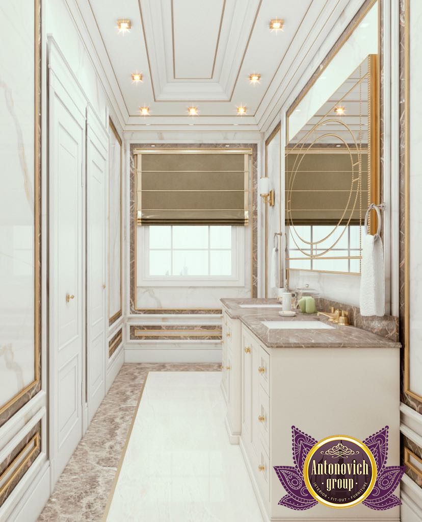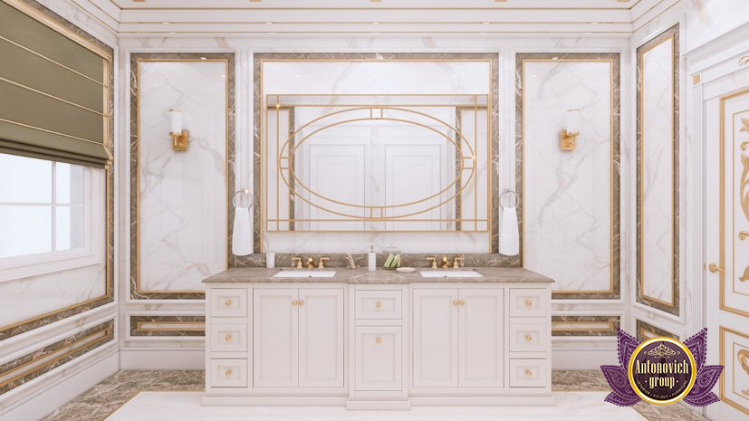 Now, let your gaze wander to the walls – no mundane hooks here. Intricately designed, solid brass robe hooks emerge as functional pieces of art, effortlessly combining form and function. A crystal-clear mirror reflects your refined image, framed by a handcrafted, gilded mirror frame that channels the aesthetic of a grandiose palace, evoking the Bulgari residence exterior. Lighting takes center stage as well; imagine sconces with ornate detailing that cast a warm, inviting glow, turning your daily routine into an experience akin to a spa visit — or consider a crystal chandelier design to amplify the effect.