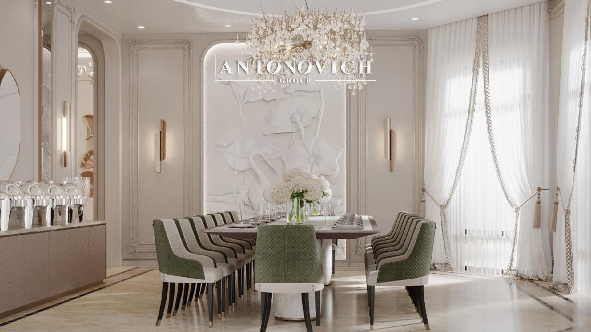 One hallmark of classic dining room interior design is the use of luxurious dining materials. The Antonovich Group spares no expense in sourcing the finest materials from around the world to create an atmosphere of unparalleled opulence. From marble flooring that exudes grandeur to silk draperies that add a touch of regal splendor, every element is carefully selected to elevate the dining experience to new heights. They partner with furniture production and stylish accessories in Dubai to source bespoke pieces. In a classic dining room designed by The Antonovich Group, symmetry and balance reign supreme. The placement of furniture, the arrangement of decor, and even the positioning of the tableware are meticulously planned to create a sense of harmony and order. This sense of balance is not only visually pleasing but also creates an environment that fosters engaging conversations and memorable gatherings. For structural inspiration, see their best modern architecture project. It also informs their superb villa interior design work.