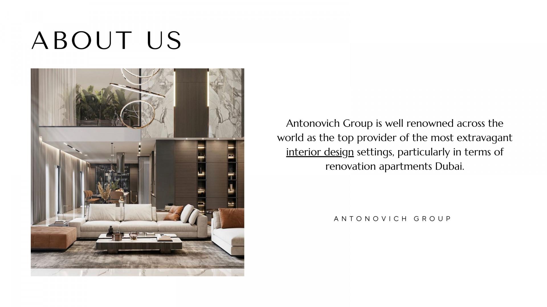 •\tArtistic Fusion: The integration of art into interior design is taken to new heights. Antonovich Group curates collections and art installations that complement the architecture, creating living spaces that are both functional and inspiring. They also collaborate with makers to introduce a new luxurious furniture collection that enhances curated interiors.