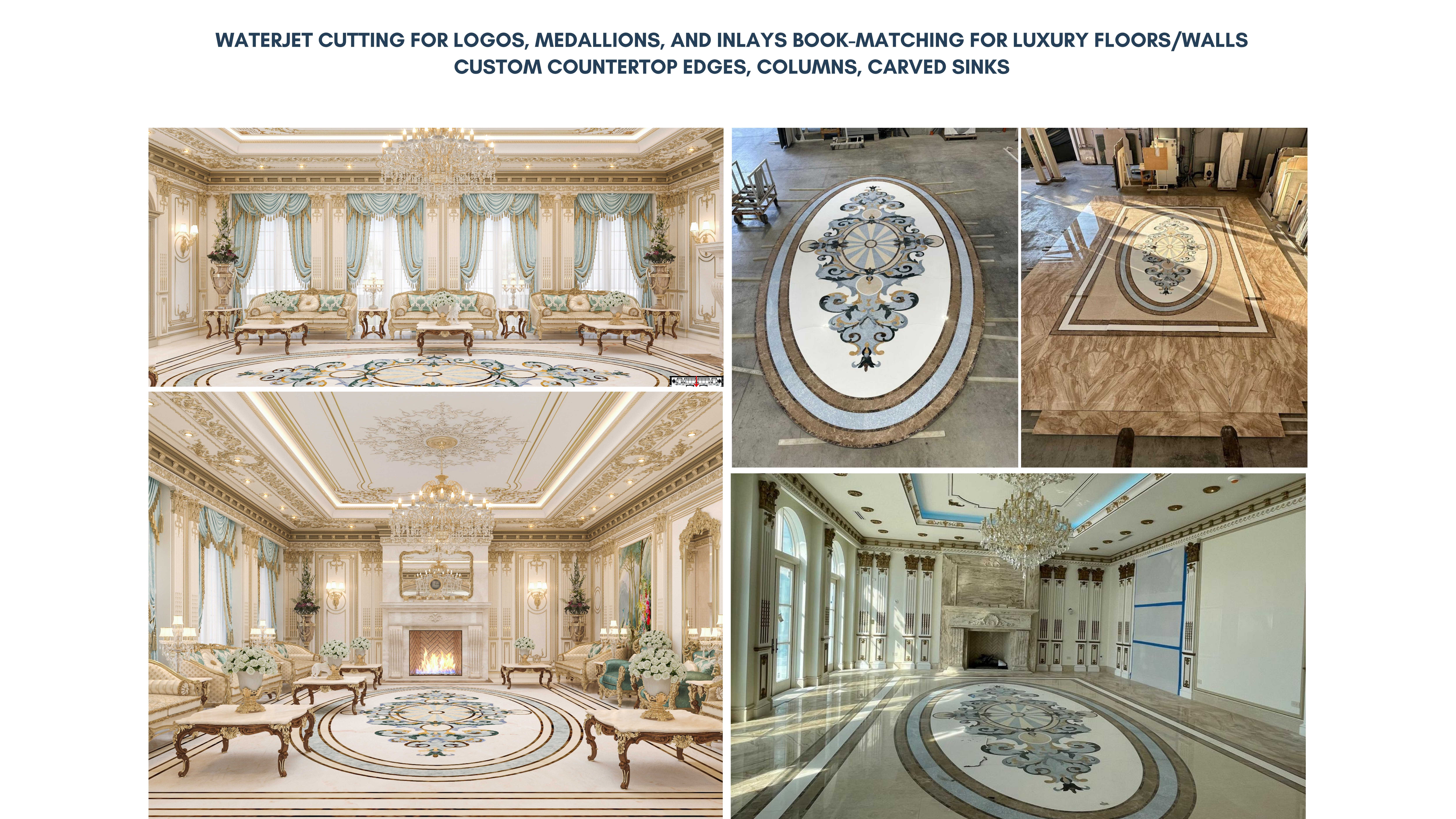 We specialize in waterjet cutting for logos, medallions, and inlays, bringing intricate patterns and custom designs to life with exceptional accuracy. For expansive interior applications, our artisans execute book-matching for luxury floors and walls, creating stunning mirror-like veining effects that enhance the grandeur of any space.