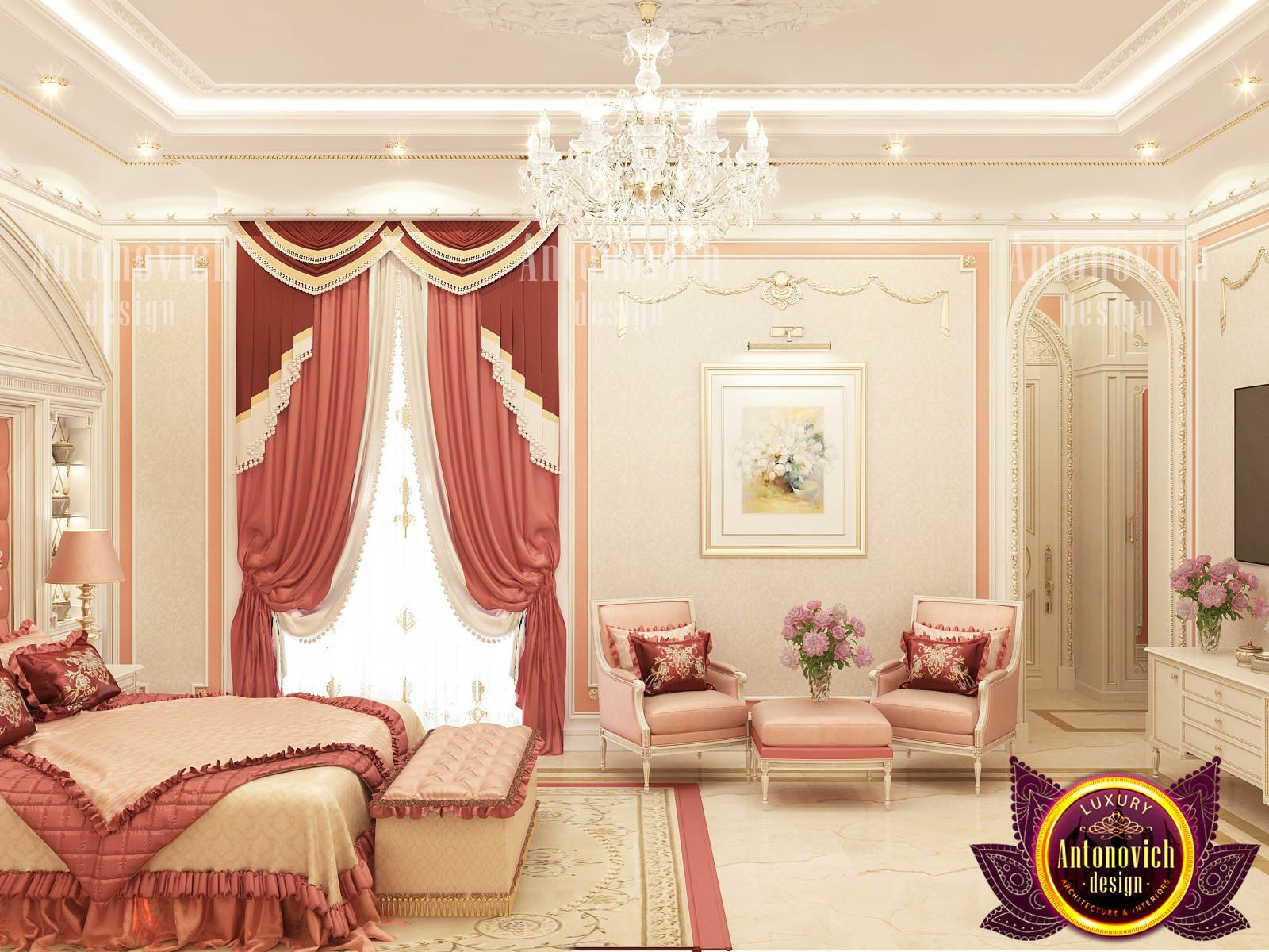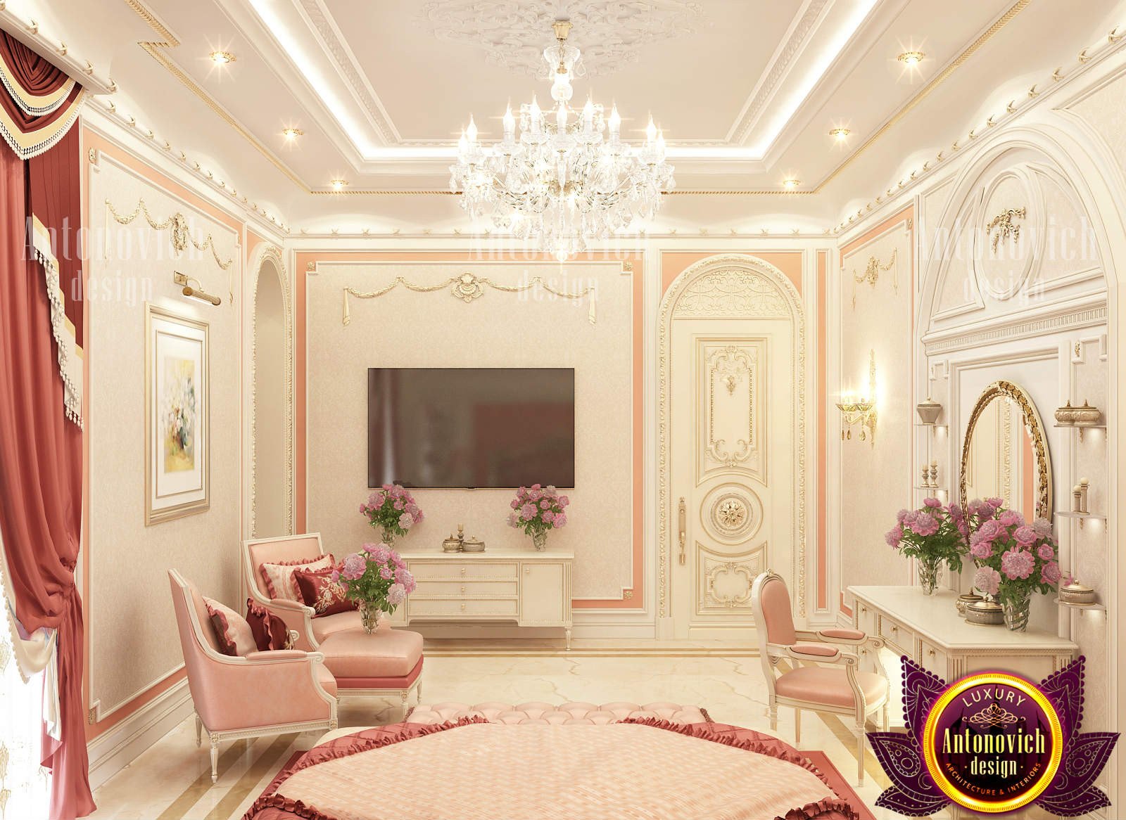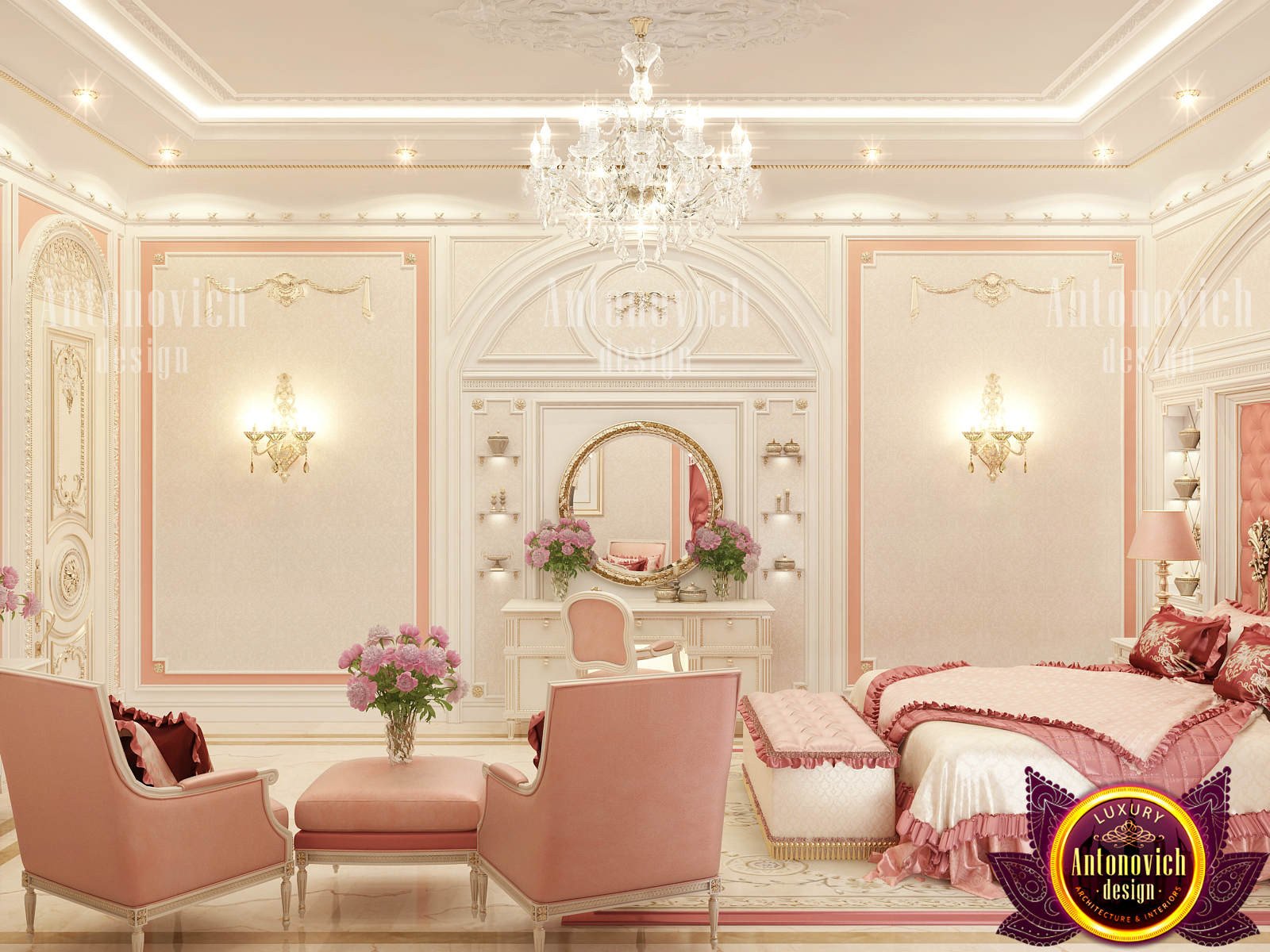 In the project of this bedroom in gentle tones, our designers of Luxury Antonovich Design have placed accents in different ways. The bed of pink color looks really gorgeous. A wide bed of light pink pastel color, decorated with decorative pillows with gold embroidery and drapery is perfect for finishing the headboard of the bed with carved gold elements. The furniture made of light wood and covered with translucent varnish looks unusual. Such a chest of drawers fits perfectly into the design of a classic bedroom and creates a cozy atmosphere in it. For accessory and styling suggestions, see home decor ideas Florida. For living-area references that pair comfort with style, review the cozy sitting room guide. If you need exterior inspiration as well, explore exterior design Uganda. For full-service outdoor options, consider Dubai landscape company packages.