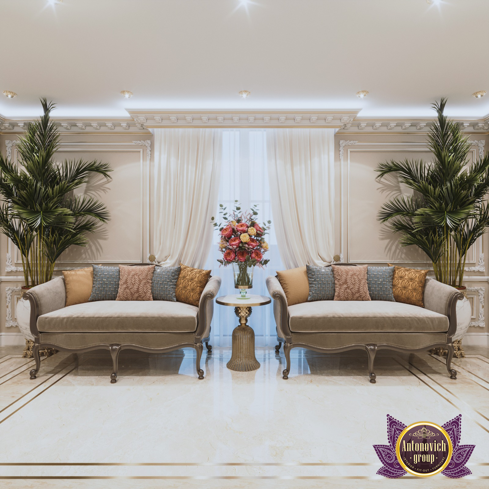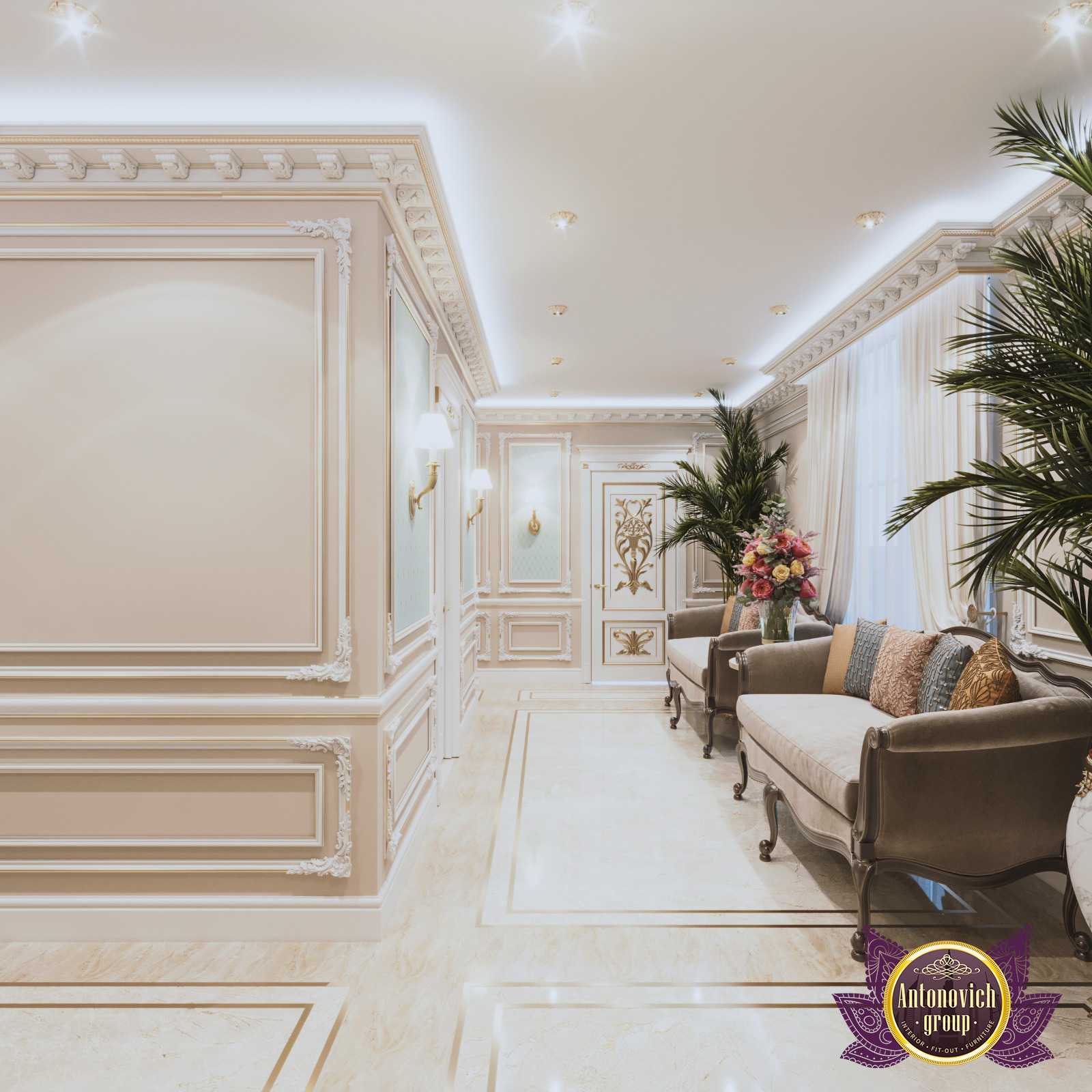 Gently curving credenzas adorned with intricate woodwork greet the eye, inviting guests to pause and appreciate the intricate details that once defined an era. These pieces, polished to a lustrous sheen, hold within them the stories of countless guests who have traversed this very path. For care and selection, consult furniture buying tips in Dubai. The credenzas are not mere furniture; they are time capsules of an age where every curve, every flourish was an expression of artistic dedication. Tall, regal plant stands punctuate the hallway Dubai, holding court with a natural grace. Cascading greenery spills from elegant pots, creating an oasis of tranquility amidst the hustle of the hotel's comings and goings. The juxtaposition of organic beauty against the backdrop of opulent decor encapsulates the very essence of classic design – a harmonious marriage of the lavish and the natural. Richly upholstered benches beckon tired travelers to rest for a moment, their plush seats offering solace and respite. Their layout benefits from comfortable sitting room design principles. As you sink into the cushions, a sense of relaxation washes over you, akin to the embrace of an old friend. These benches have witnessed conversations and reunions, their presence a constant in a world that is forever evolving.