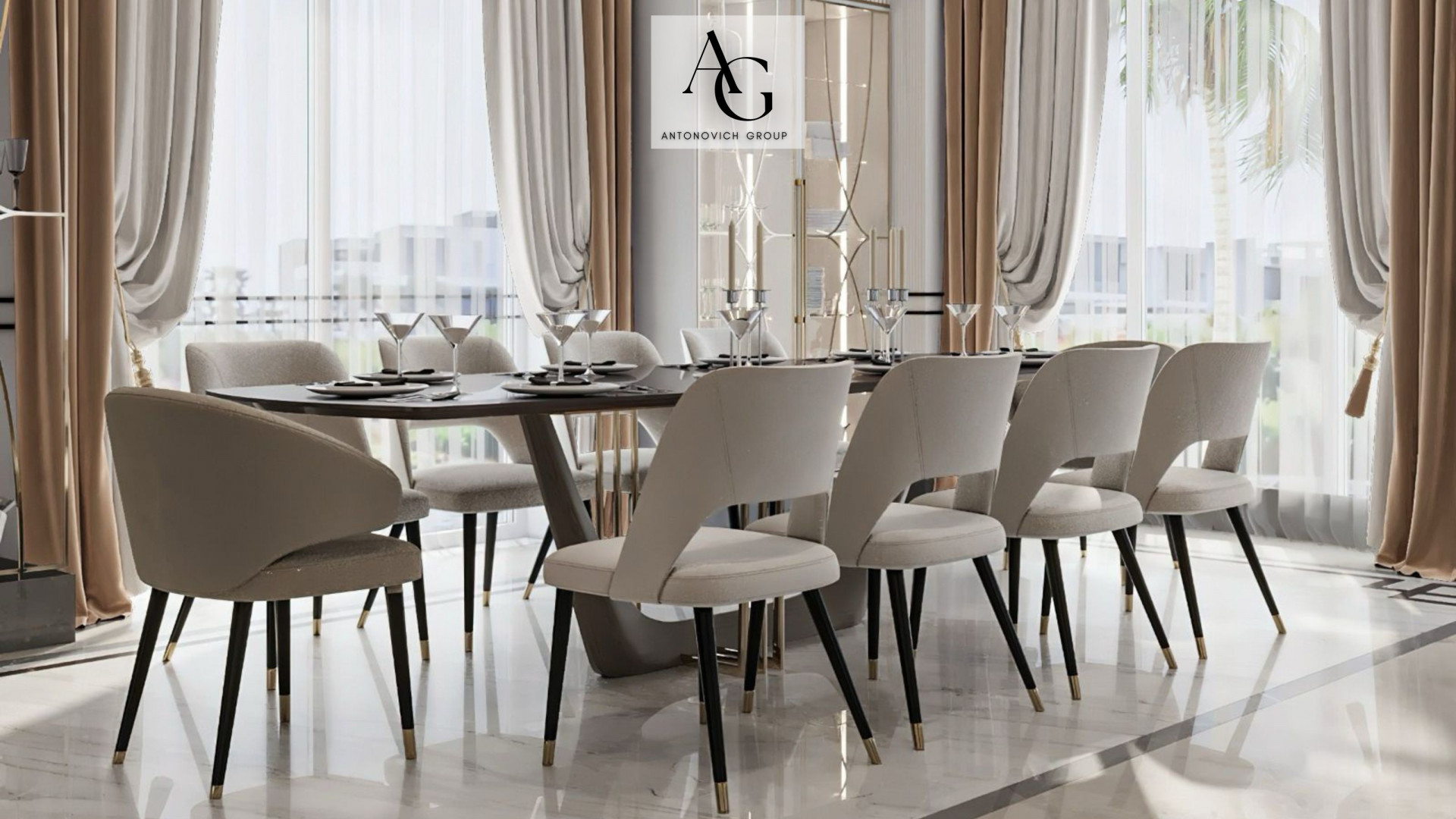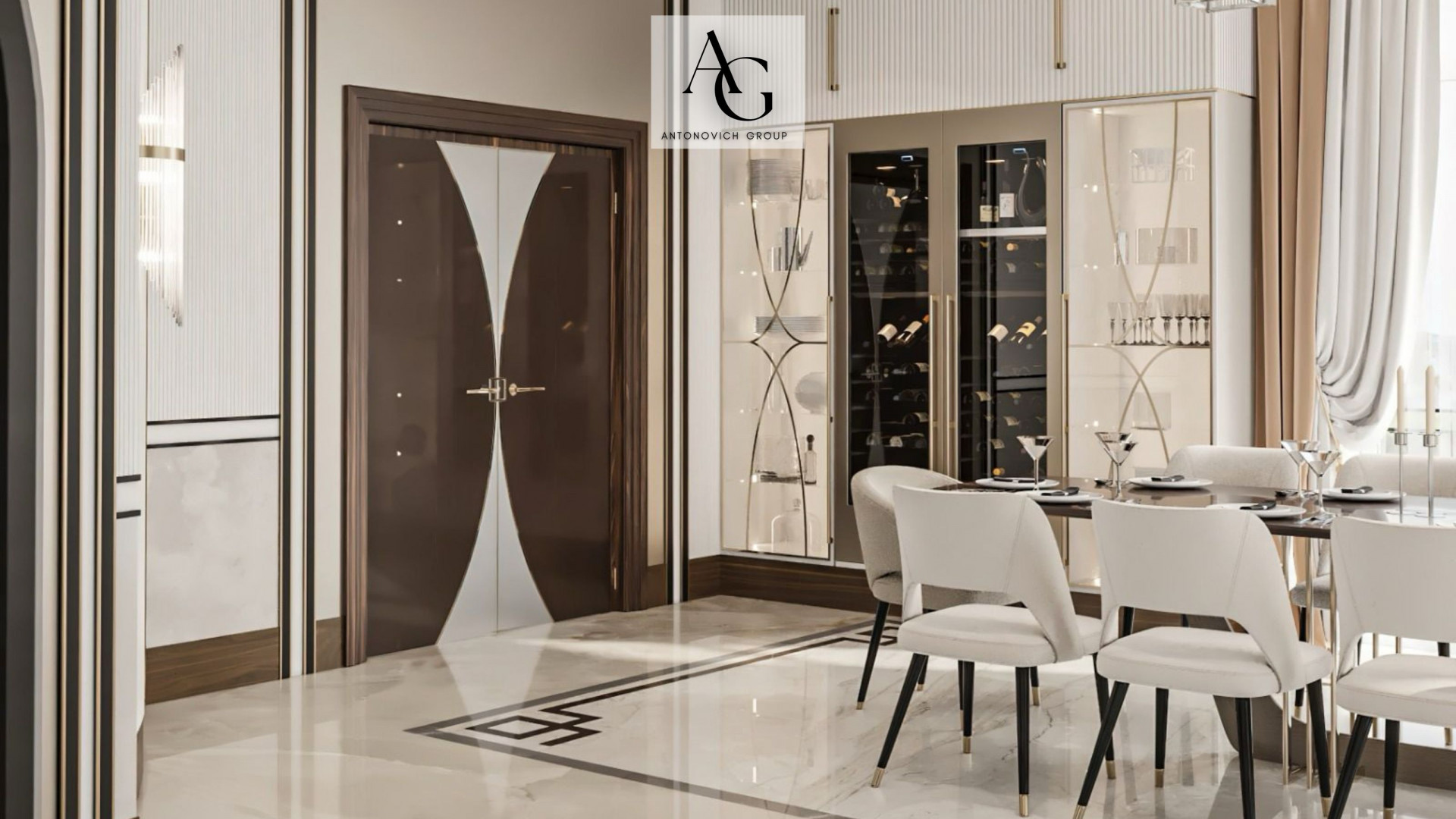 The dining room becomes a culinary haven with Antonovich Group's meticulous touch. The design team pays attention to every detail, from the layout to the choice of materials, including Italian and French furnishings, ensuring a seamless flow between the living and dining spaces. Tailored to accommodate both intimate gatherings and lavish feasts, the dining room becomes a symbol of luxury and refined taste.