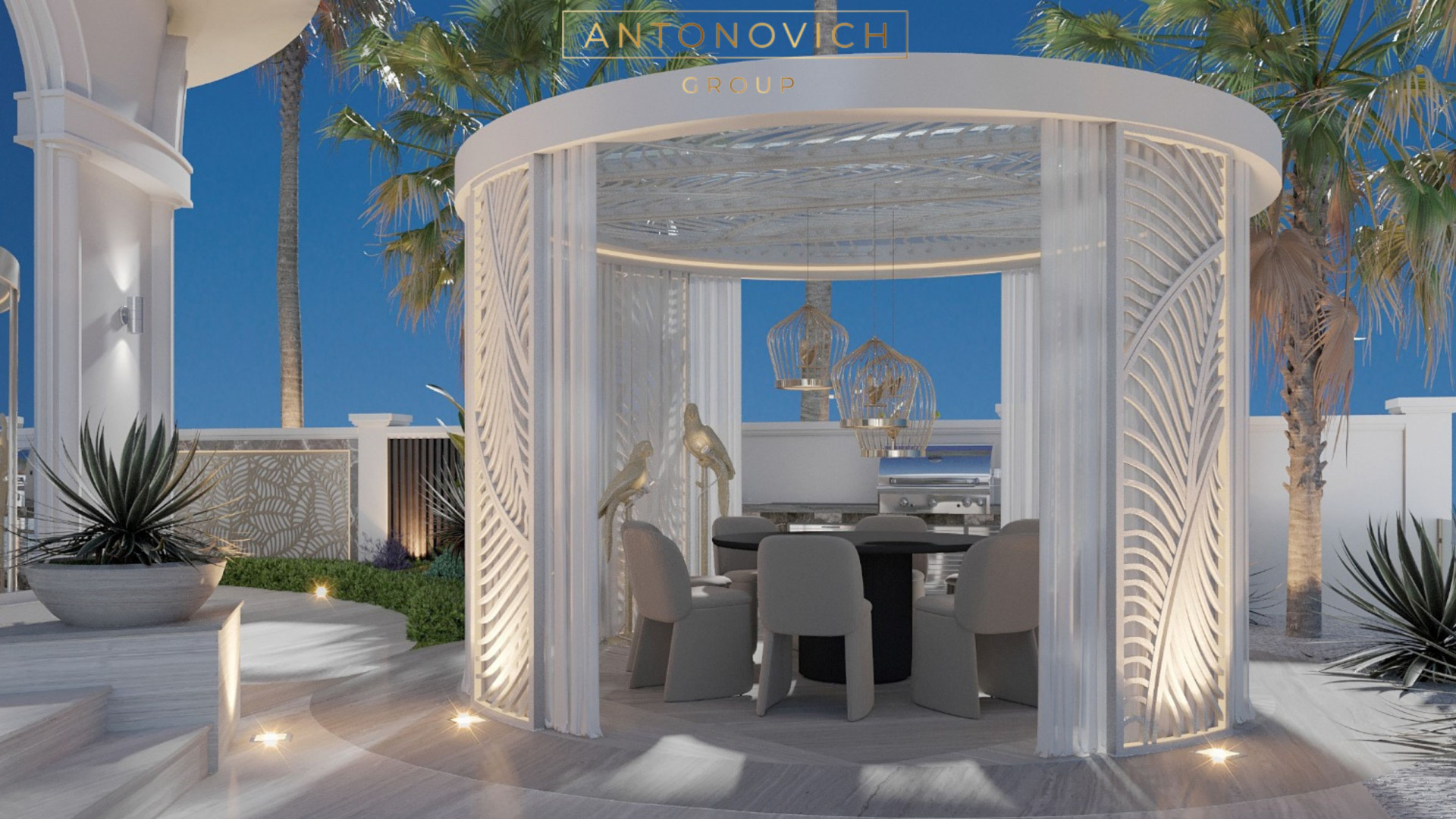 Antonovich Group's interior exterior design solutions ensure that the transition from indoor to outdoor spaces is fluid and inviting, and they complement modern dining room design to create seamless living areas.
