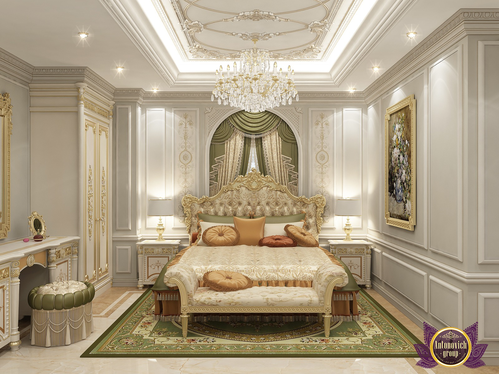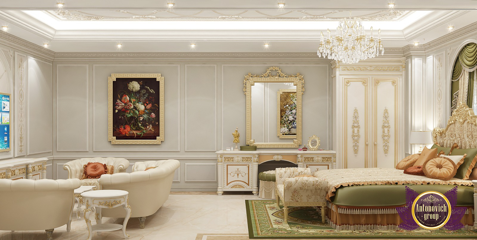 At the heart of this design is the artful use of color. The deep, lush shades of green envelop the space, creating an ambiance that is both calming and invigorating. This carefully chosen color palette draws inspiration from the natural world, bringing the tranquility of a verdant landscape into the confines of the bedroom. It pairs well with garden design Dubai. The walls, adorned with intricate patterns and finished in a luxurious deep green, serve as a canvas for the interplay of light and shadow, adding depth and character to the room. Such settings often benefit from landscape design execution to integrate outdoor views. In the realm of opulent interior design, The Antonovich Group has once again outdone itself with their breathtaking Green and Gold Luxury Classic Bedroom design. This masterpiece exudes an air of timeless elegance and regal charm, setting a new standard for luxurious living spaces. With an eye for detail that only The Antonovich Group possesses, this bedroom interior is a symphony of rich green hues and gleaming gold accents, seamlessly blending classic aesthetics with modern sensibilities.