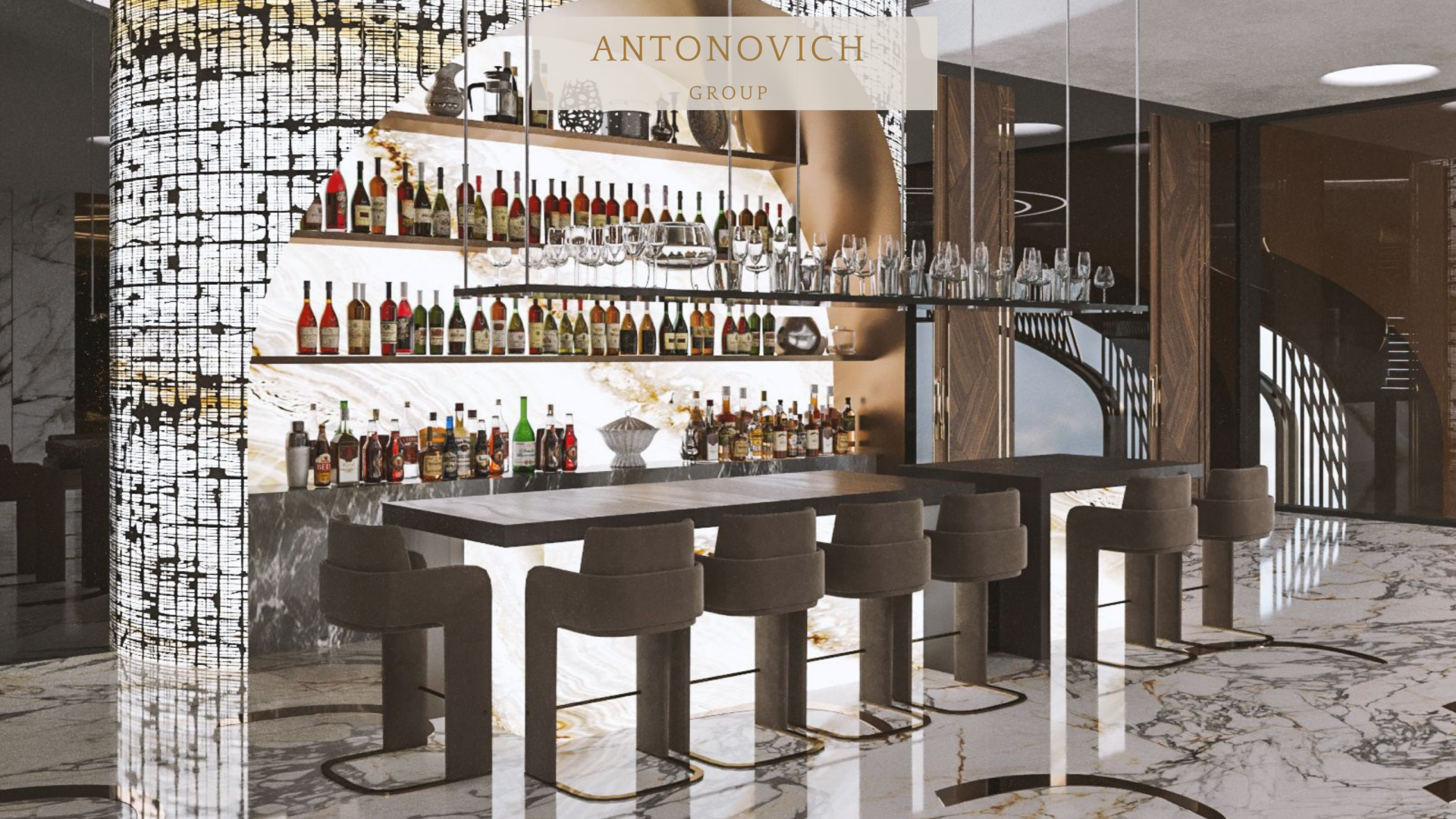 Antonovich Group's expertise in selecting the finest materials ensures that the bar counter not only serves its practical purpose but also stands as a work of art within the living space. The use of premium finishes and sophisticated design elements transforms the bar counter into a conversation piece, adding a touch of glamour to the room. It pairs beautifully with a royal kitchen design to maintain consistent luxury across adjacent spaces.