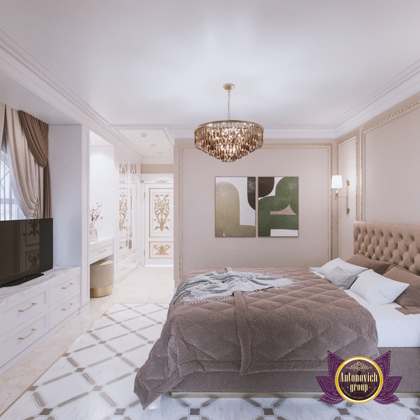 The centerpiece of this luxurious haven is undoubtedly the king-sized bed. Its upholstered headboard, upholstered in a sumptuous coffee-brown fabric, beckons with promises of indulgent relaxation. Nestled atop the bed are layers of plush pillows and throws in varying shades of brown and gold, adding depth and texture to the ensemble. The interplay of different textures, from the silky smoothness of the bedspread to the intricate patterns on the cushions, adds a tactile dimension to the visual splendor. Every detail in this room has been meticulously curated to enhance the overall ambiance of luxury. The rich wooden flooring, reminiscent of aged oak, radiates a sense of timeless beauty. A custom-designed chandelier dangles from the ceiling, casting a warm, golden glow that bathes the room in a gentle radiance. These details also appear in their living room designs, mirroring the attention to detail for which The Antonovich Group is renowned.