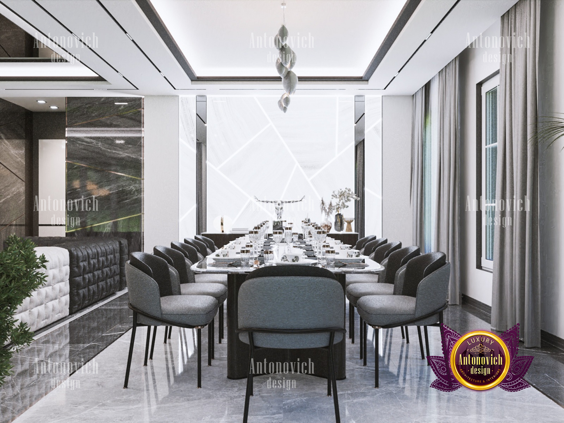 The Antonovich Group provides a setting that is unquestionably attractive and sophisticated in contrast to the white walls. As an Interiors group, they create cohesive spaces that balance materials and scale. Ivory chairs may add a hint of refinement, while white walls would look more modern and make the ideal backdrop for your crystals. High-end, opulent dining room design ideas are most frequently seen in the following shapes: round, oval, rectangle, and square. Alternatives include wood, granite, marble, and leather. Also, you may create a more contemporary appearance by choosing streamlined furniture and lighting fixtures. Vintage classics that are still in demand today are candles and candelabras. These decorations are available in a huge range of shapes, colors, and designs. You can choose elegant candles that match the rest of your décor. Candles in silver or gold are perfect for a formal setting. For a more private setting, choose candles in neutral colors like white or black. Choose votive holders made of glass or metal if you're seeking a unique candle idea. Finding a style that best suits your hosting requirements and your house is the key to providing your guests with an absolutely amazing dining experience (and yourself, of course). For regional and whole-home examples, see our Riyadh villa interior design work or browse a villa design in UAE for full-home inspiration.