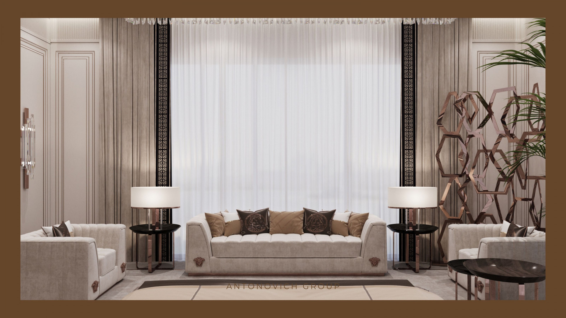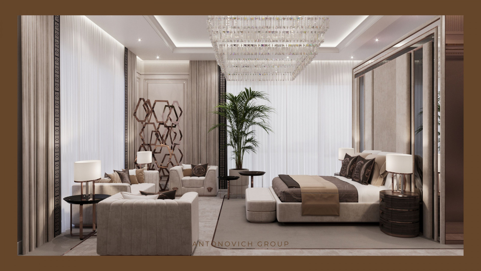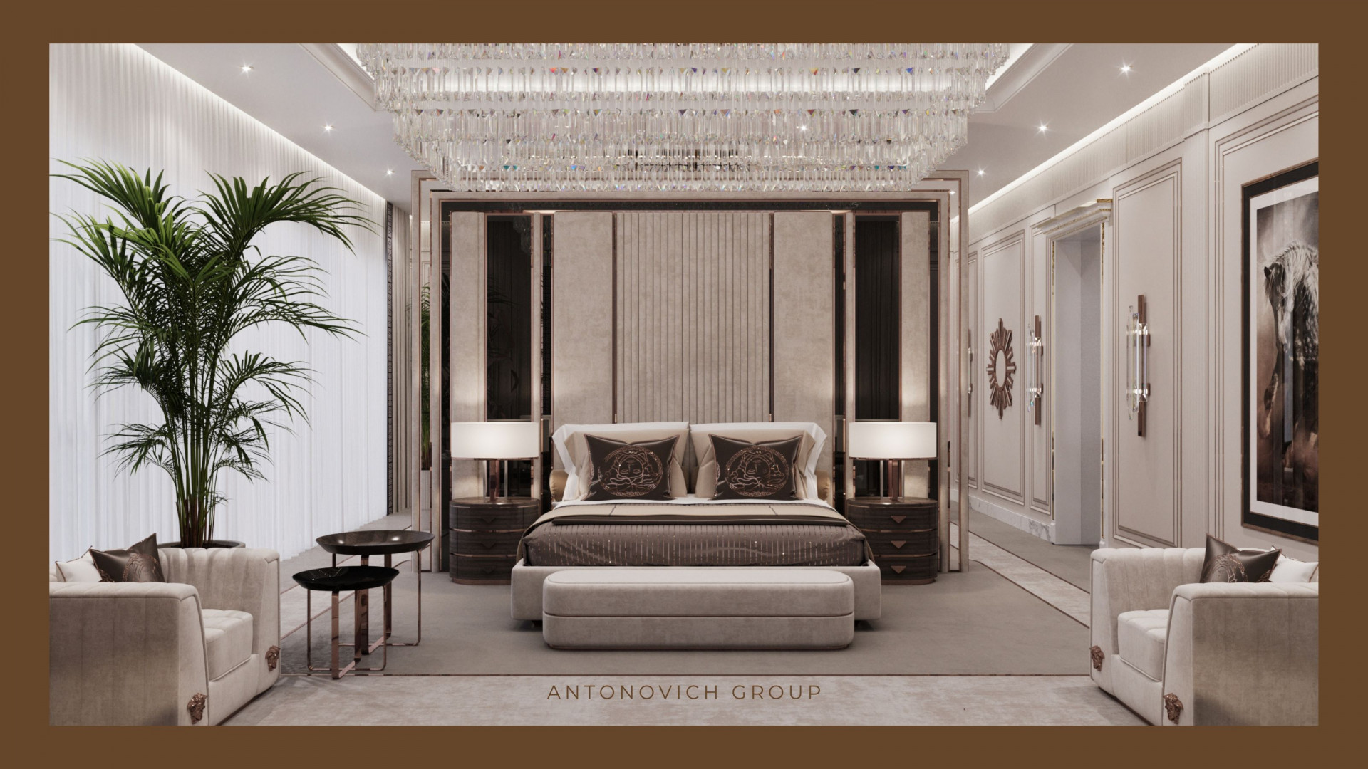 In the vibrant landscape of Dubai, where the fusion of modernity and classic design defines luxury living, Antonovich Group emerges as a trailblazer in crafting opulent spaces. Their approach to architecture and interior design is comprehensive. Today, we delve into the realm of masterful interior design, specifically focusing on the services offered by Antonovich Group for a luxurious master bedroom adorned with Versace furniture and wrapped in a sophisticated nude and brown theme. In this exploration, we will touch upon the concepts of modern villa plans, classic design villas, villa garden design, and the visionary approach of designers in Dubai.