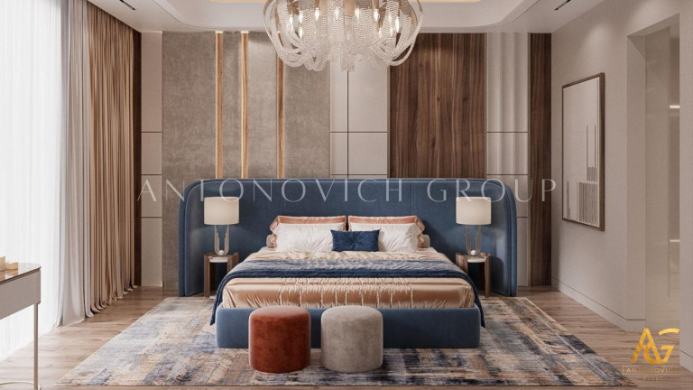 4.\tQuality Materials and Textures: To achieve a luxurious look, Antonovich Group incorporates high-quality materials such as wood, marble, and metals. Soft textures, including plush rugs and upholstered headboards, add warmth and comfort to the space.