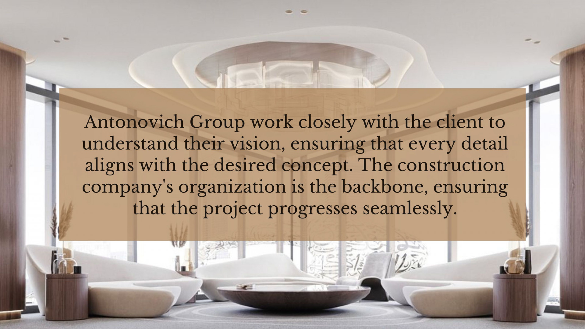 As one of the top construction consultant companies in the UAE, Antonovich Group delivers not just modern aesthetic office interiors but comprehensive solutions that enhance workspaces. Their approach is rooted in a deep understanding of client needs, creative design, and expert project management.