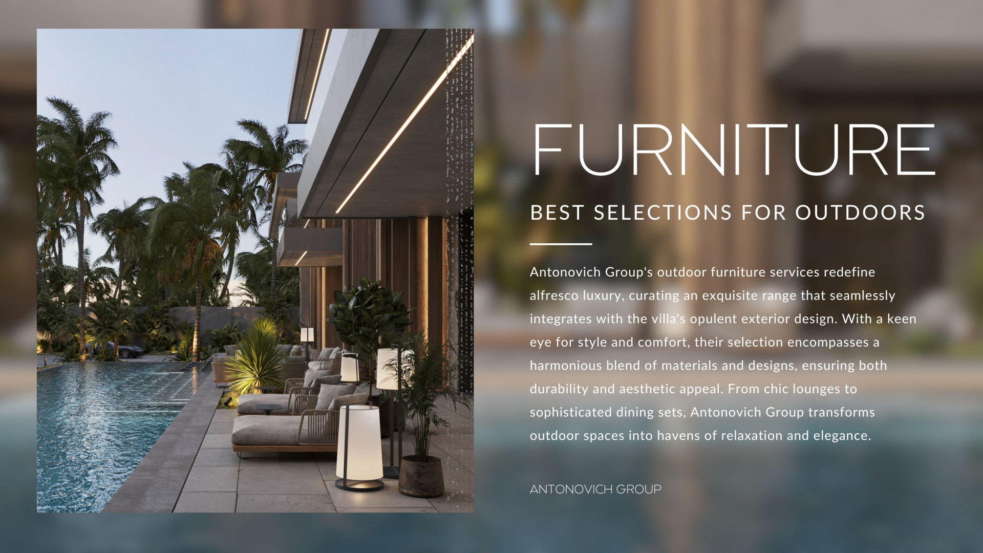 •\t\t\tOutdoor Functionality: Antonovich Group's landscape designs are equally practical and beautiful. Thoughtfully designed outdoor lounges, dining areas, and recreational spaces make the landscape not just a visual delight but also a functional extension of the villa's living spaces.