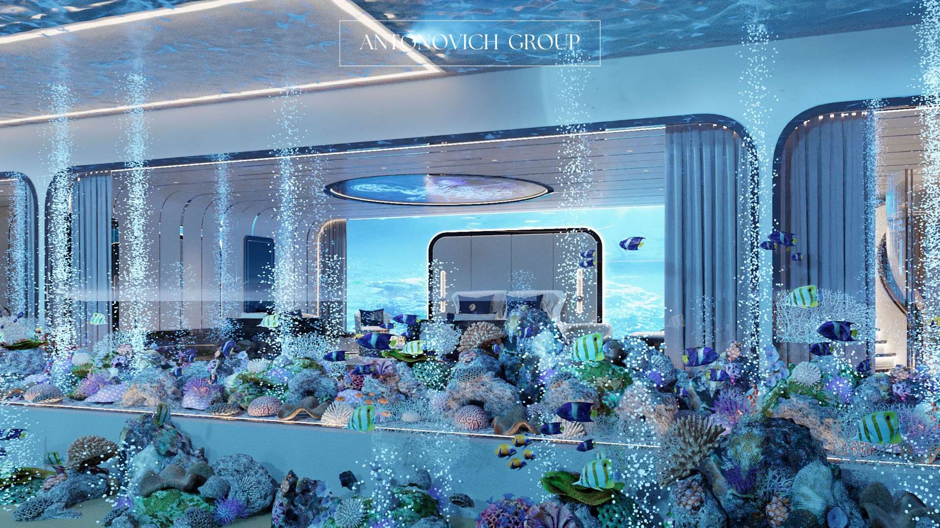 The underwater bedroom design is a sanctuary of comfort and style. Floor-to-ceiling windows provide an uninterrupted view of the vibrant marine life, creating a surreal experience for the residents. The bespoke furniture and lighting solutions by Antonovich Group add a touch of sophistication, elevating the overall ambiance of the space.