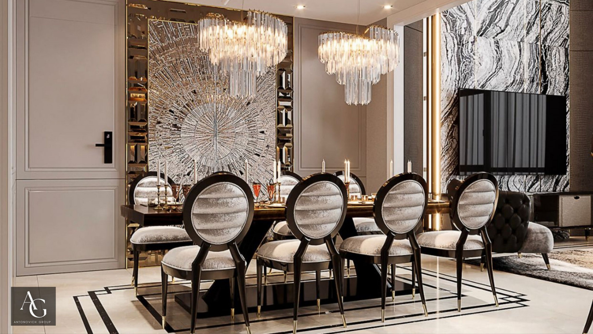 In the realm of royal house construction, the finishing works are a signature of luxury. Antonovich Group's attention to detail in finishing works elevates this villa to a realm of unparalleled elegance. Each detail, from the grand entrance to the smallest ornament, is a brushstroke in the canvas of luxury. Signature living spaces include a high-end dining room.