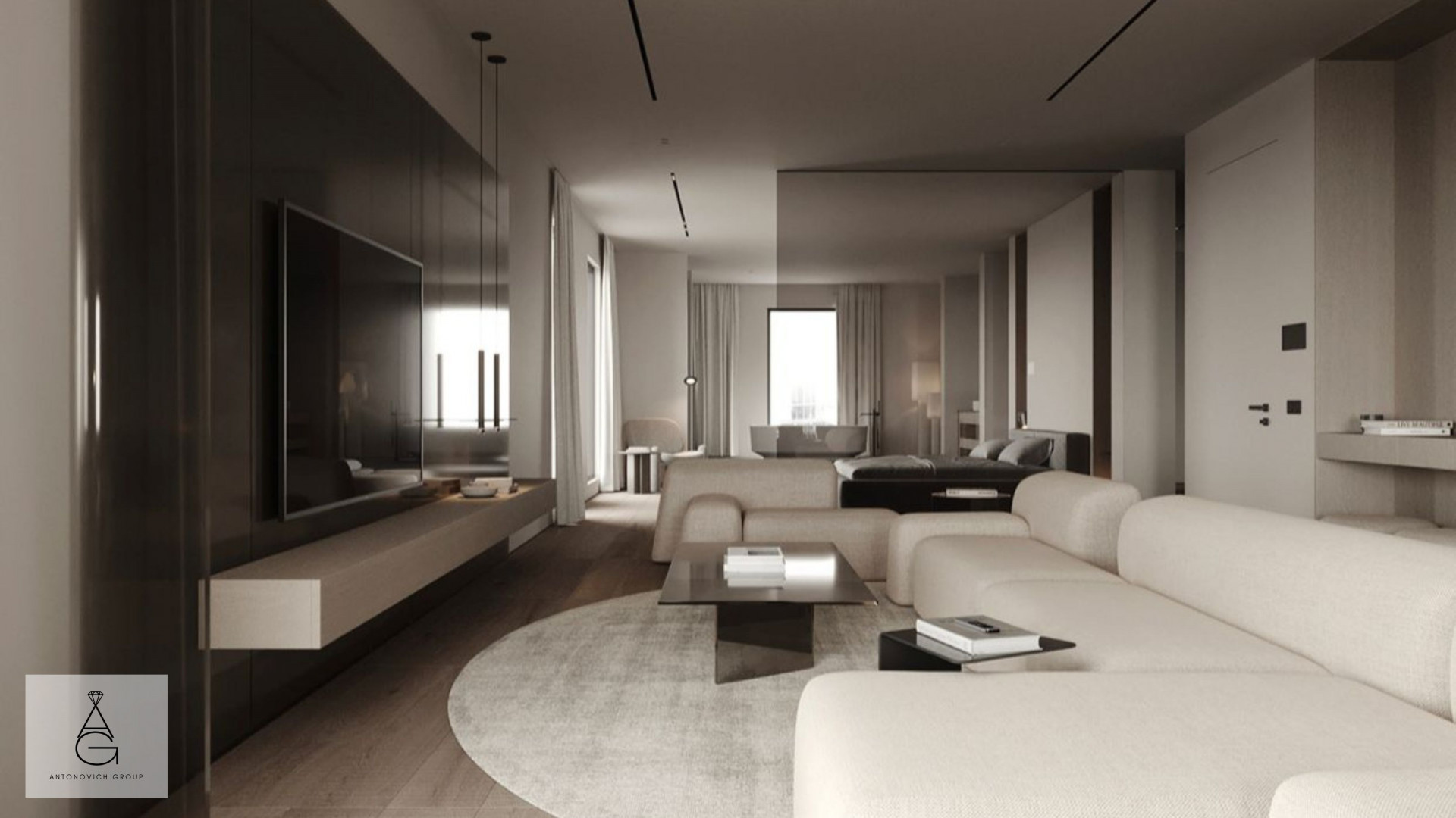 The true beauty of modern minimalist apartment interiors lies in the finishing works in construction. Antonovich Group's mastery in this area ensures that every detail is meticulously executed, from flawless wall finishes to seamless flooring transitions. Their use of neutral color palettes and subtle textures enhances the sense of tranquility and sophistication that is synonymous with minimalist design, reflecting thoughtful designer home decor choices that complement the architecture.