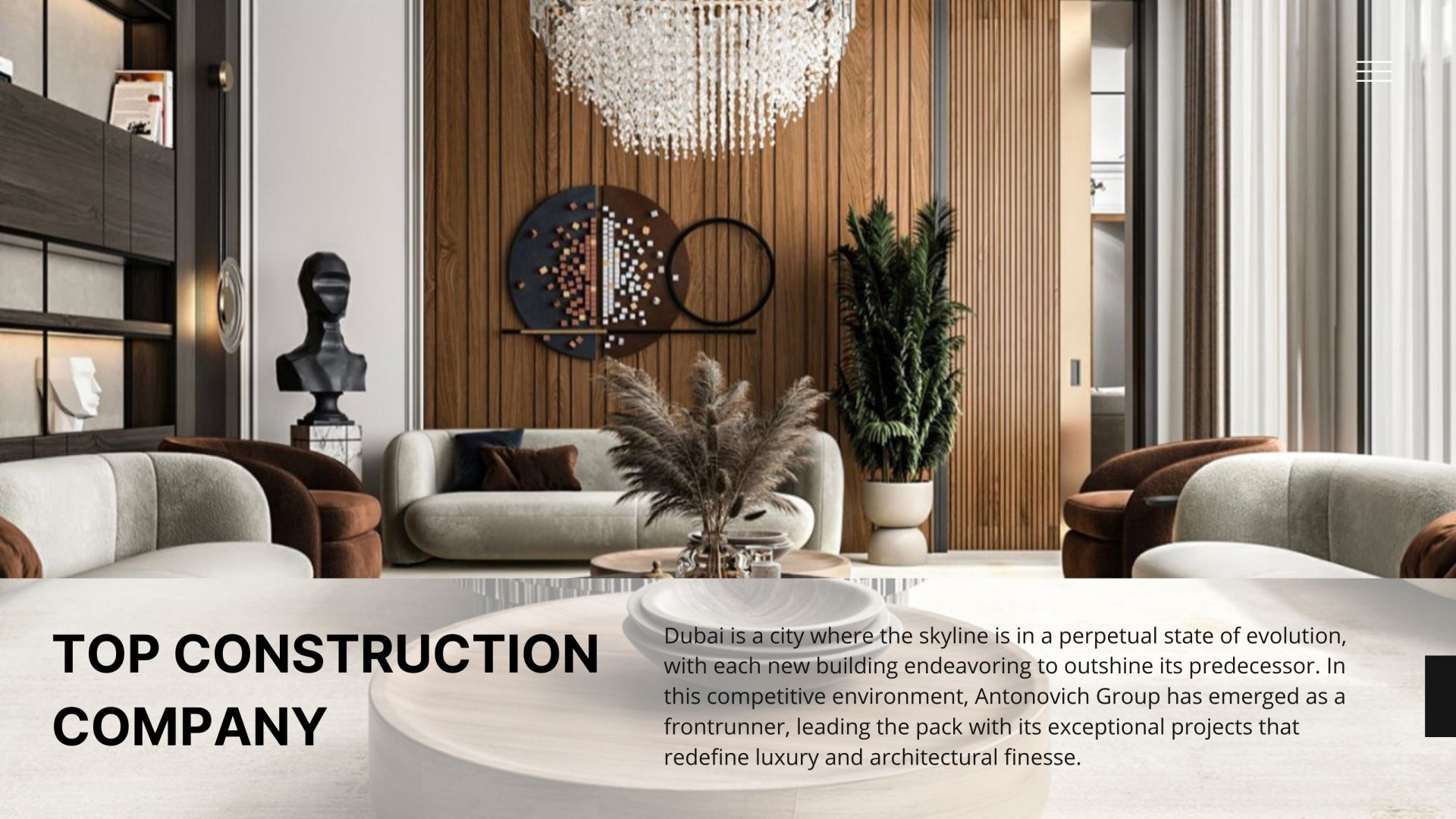 Among Dubai's top 10 construction companies, Antonovich Group's expertise extends beyond building exteriors. This project exemplifies their ability to seamlessly integrate construction prowess with luxurious interior design, creating spaces that redefine opulence, paired with luxury furniture in Dubai.