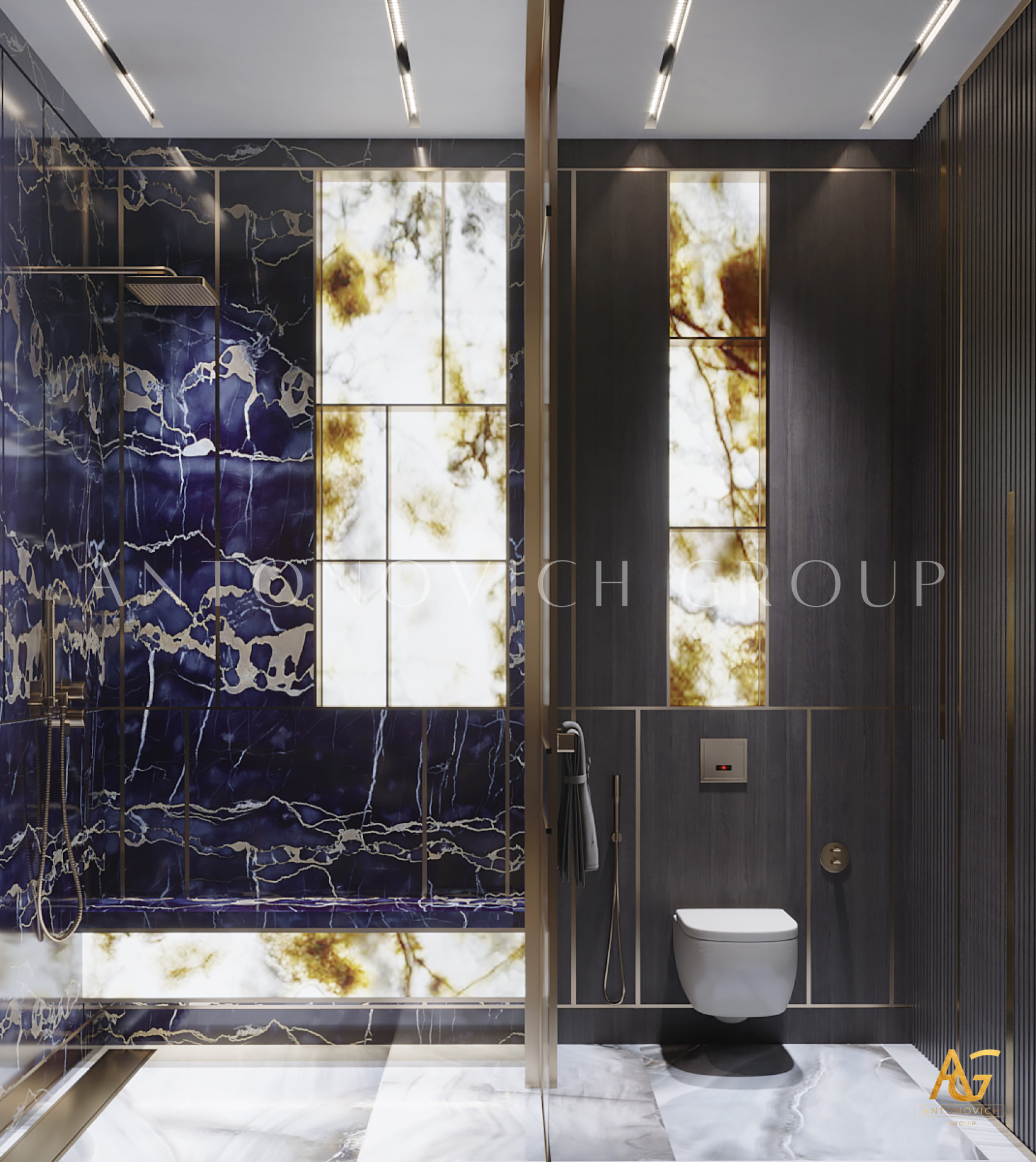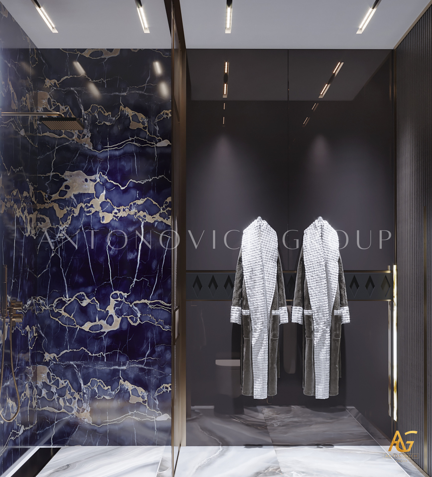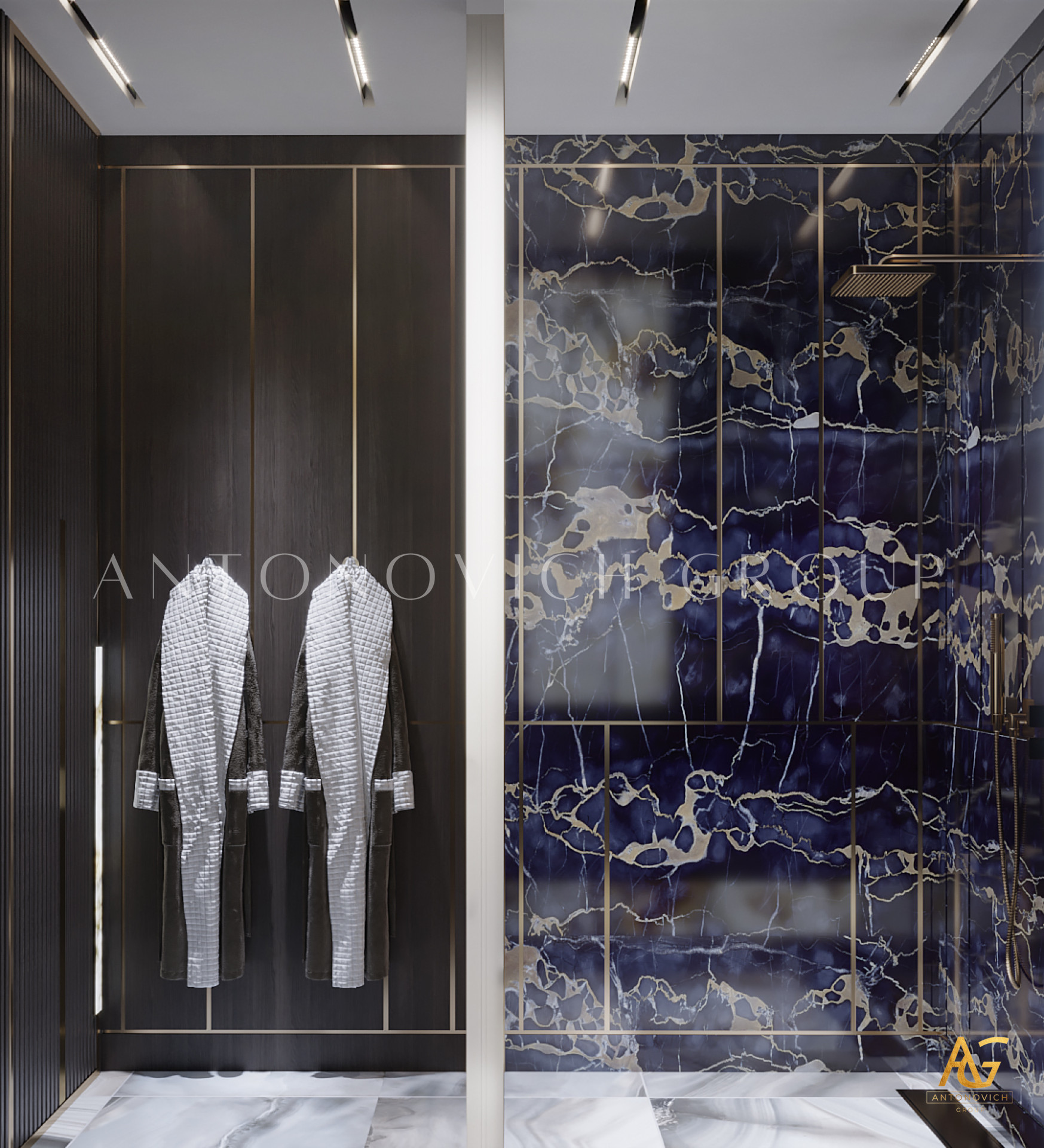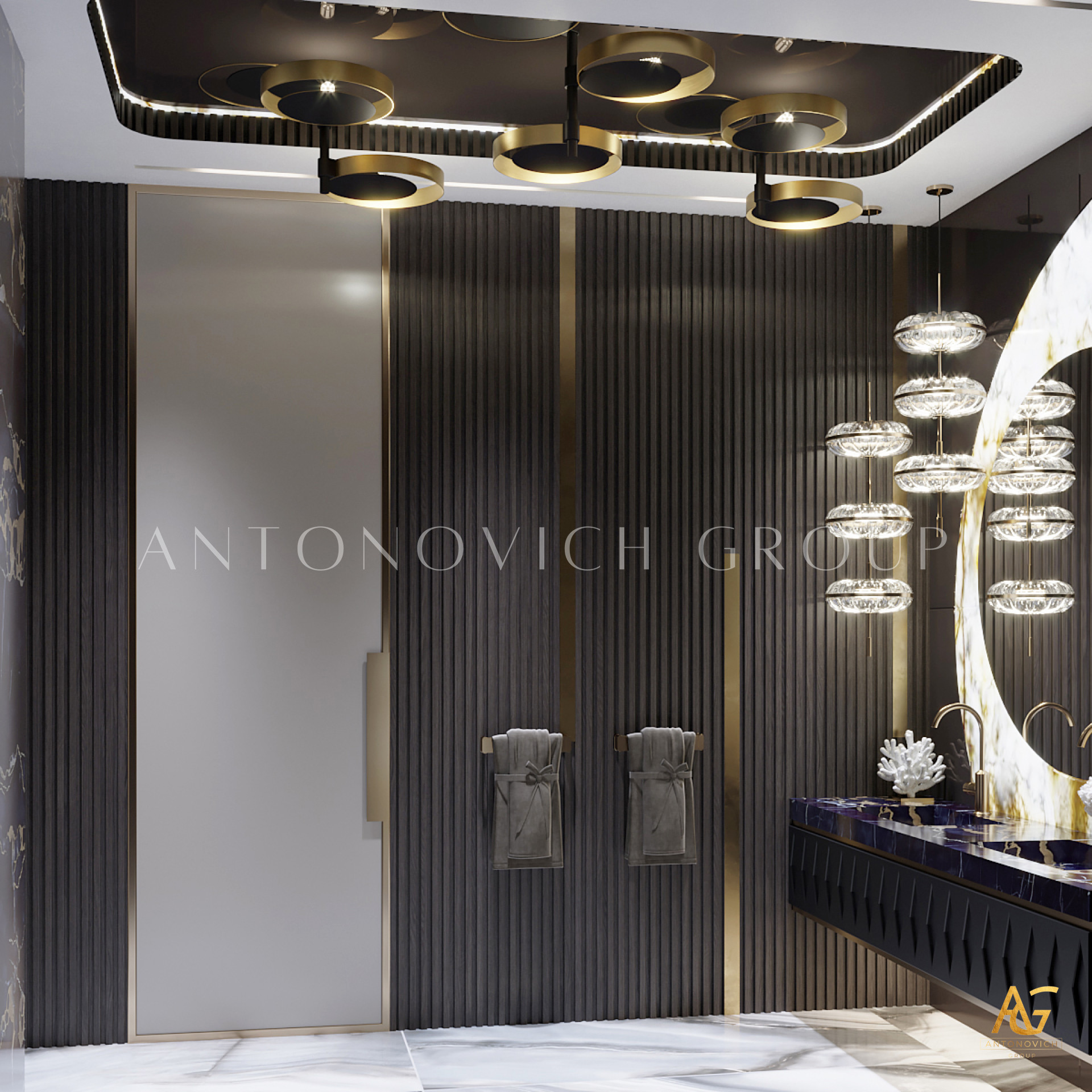 Ideas of the interior designers of the studio Luxury Antonovich Design do not cease to amaze and delight customers with their uniqueness of beautiful solutions. In this bathroom design project, everything is fine. This is an example of a truly royal luxury. When a pedestal with a beautiful staircase and a forged balustrade leads to the bathroom. This interesting moment in the interior became possible thanks to a very thoughtful organization of space. In a practically ordinary room with a window, interior designers managed to organize a royal oasis. We suggest considering in more detail the main place in this room. A snow-white oval bathroom is placed on the podium, which is decorated with mosaic tiles throughout the perimeter. A small staircase with a very beautiful forged balustrade leads to the bathroom surrounded by a light brown marble with a beautiful natural pattern of veins. Two high rectangular consoles decorated curtains of natural silk of bronze color with special impregnation. Silk with a double-sided base is assembled into perfectly smooth folds and with the help of almost invisible soft picks raised to open its pale milk side. In the decor of the walls, interior designers offered two mirror panels which in turn are reflected in each other. Comfort, authors of the project brought with the help of open shelves with illumination on which cosmetics are stored. This elegant and solemn beauty is crowned by a small niche on the ceiling with a refined chandelier. The combination in the decor of the walls of the golden and pearl mosaic tiles gives the bathroom interior a charming expression.
